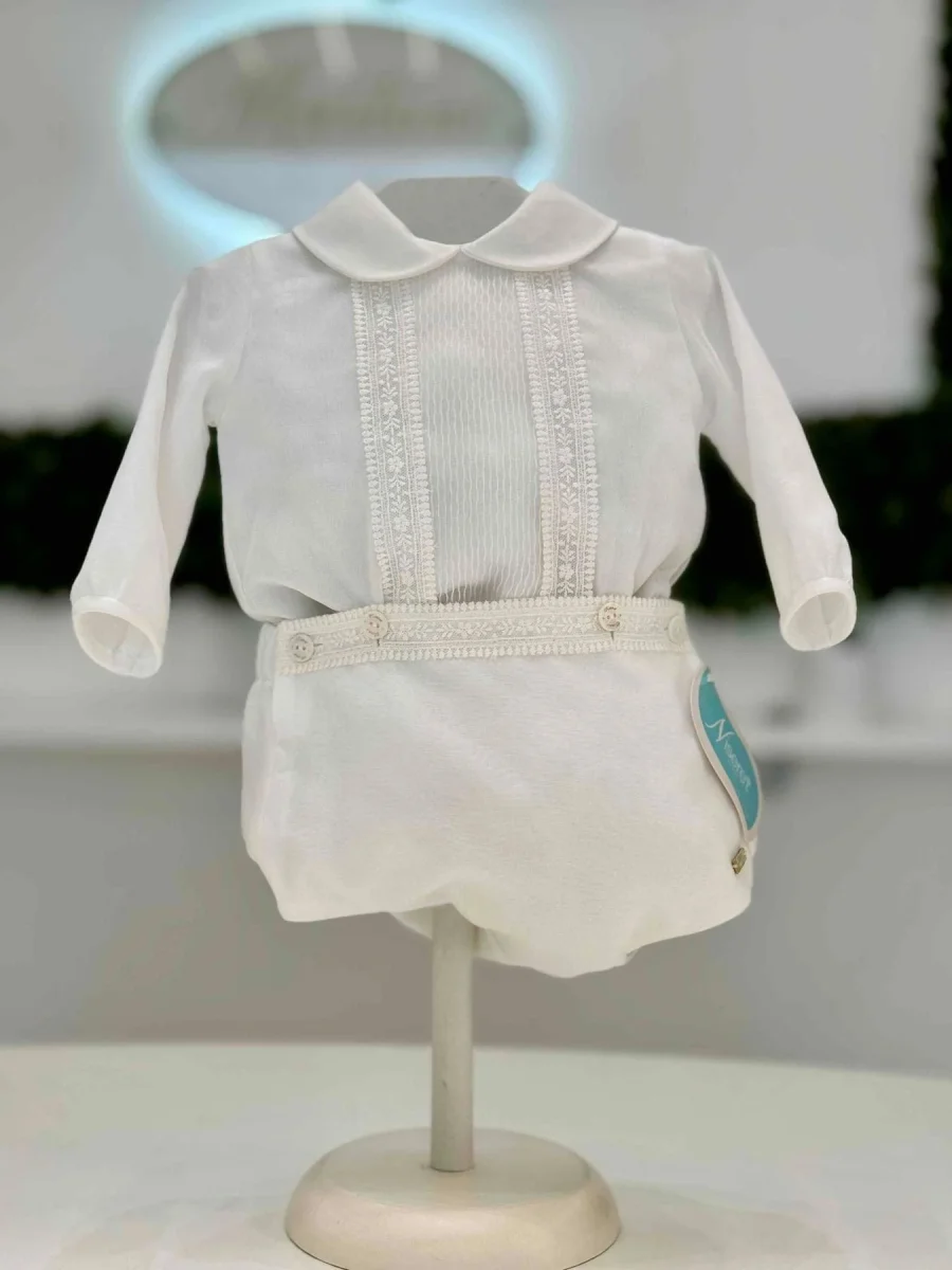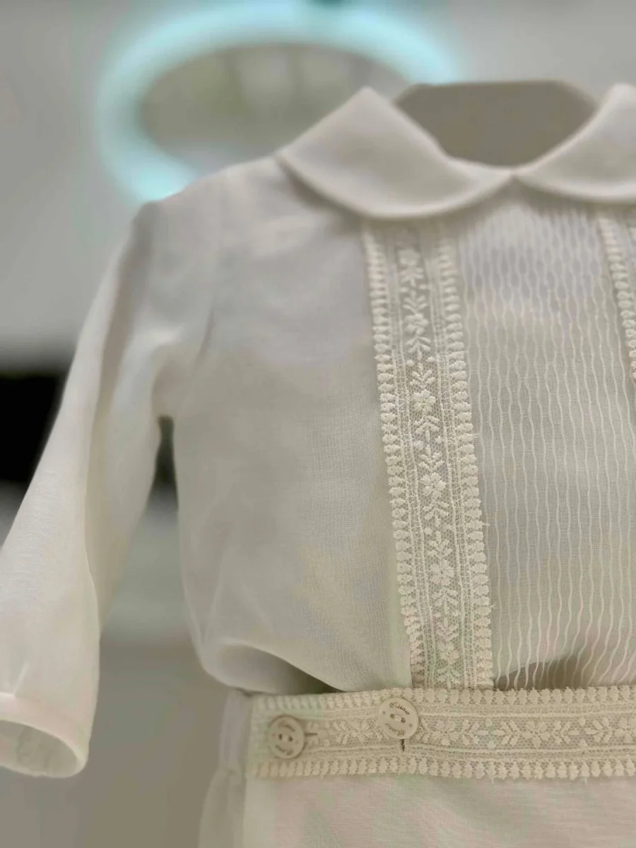 Completo battesimale camicia manica lunga in organza con motivo in pizzo centrale e culotte di organza bordato in pizzo