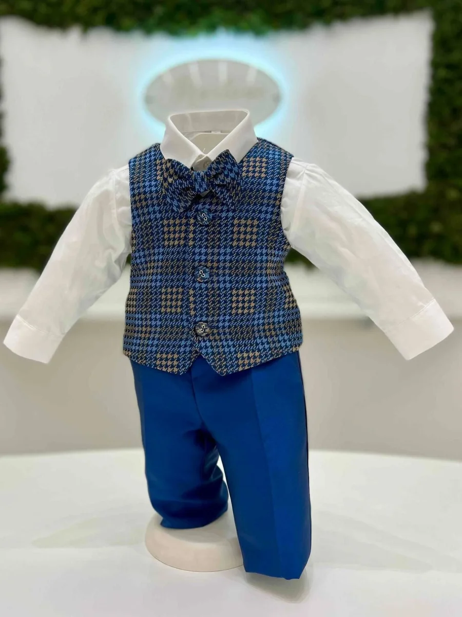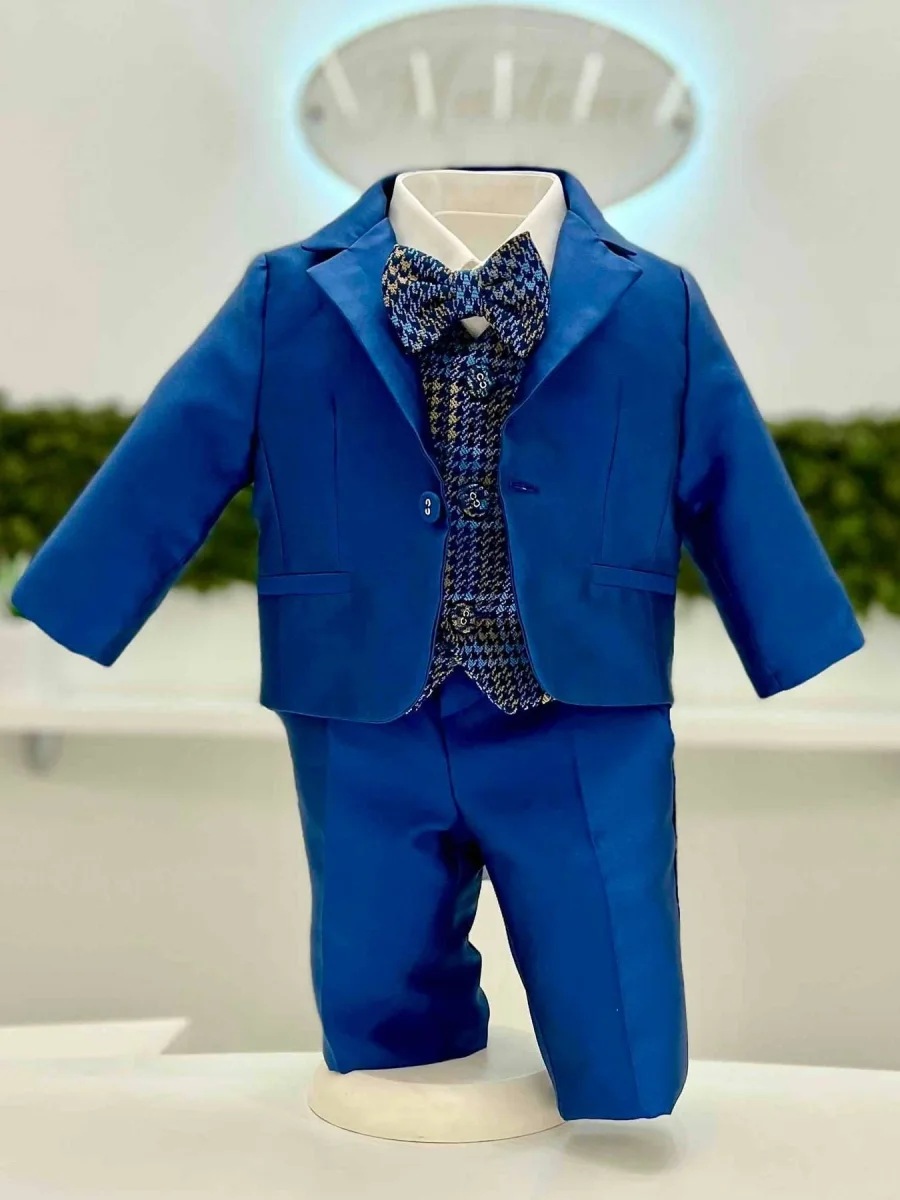 Vestito battesimo in blu (modello tight) lucido con gilet a fantasia, giacca blu, camicia bianca, papillon che richiama la stessa fantasia del gilet e pantalone blu. Questo vestito è abbinato a Luxury shots 008 e Luxury Cloth Cap 0014
