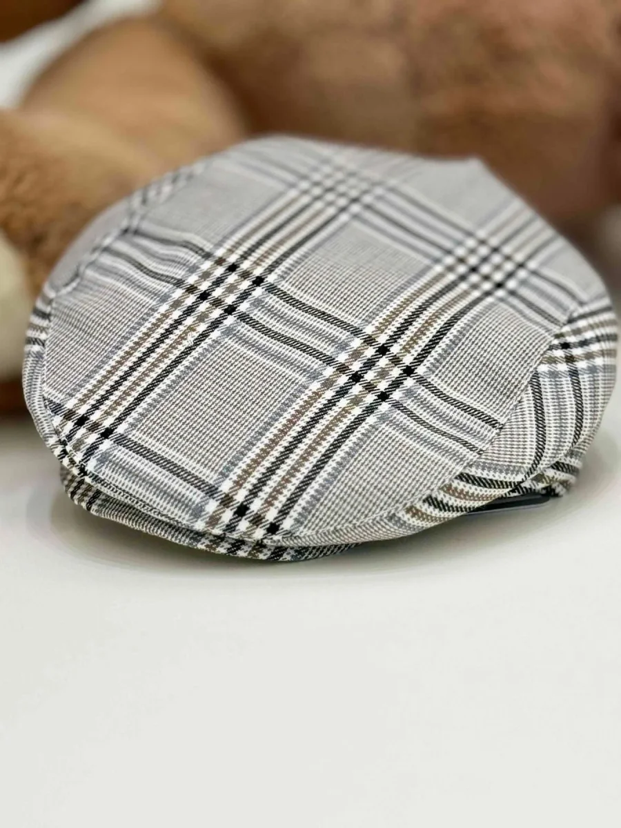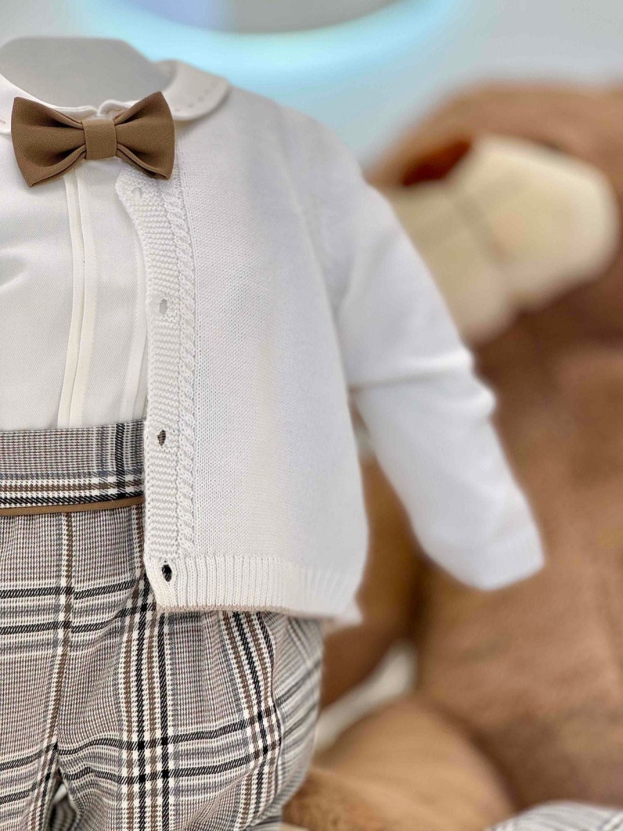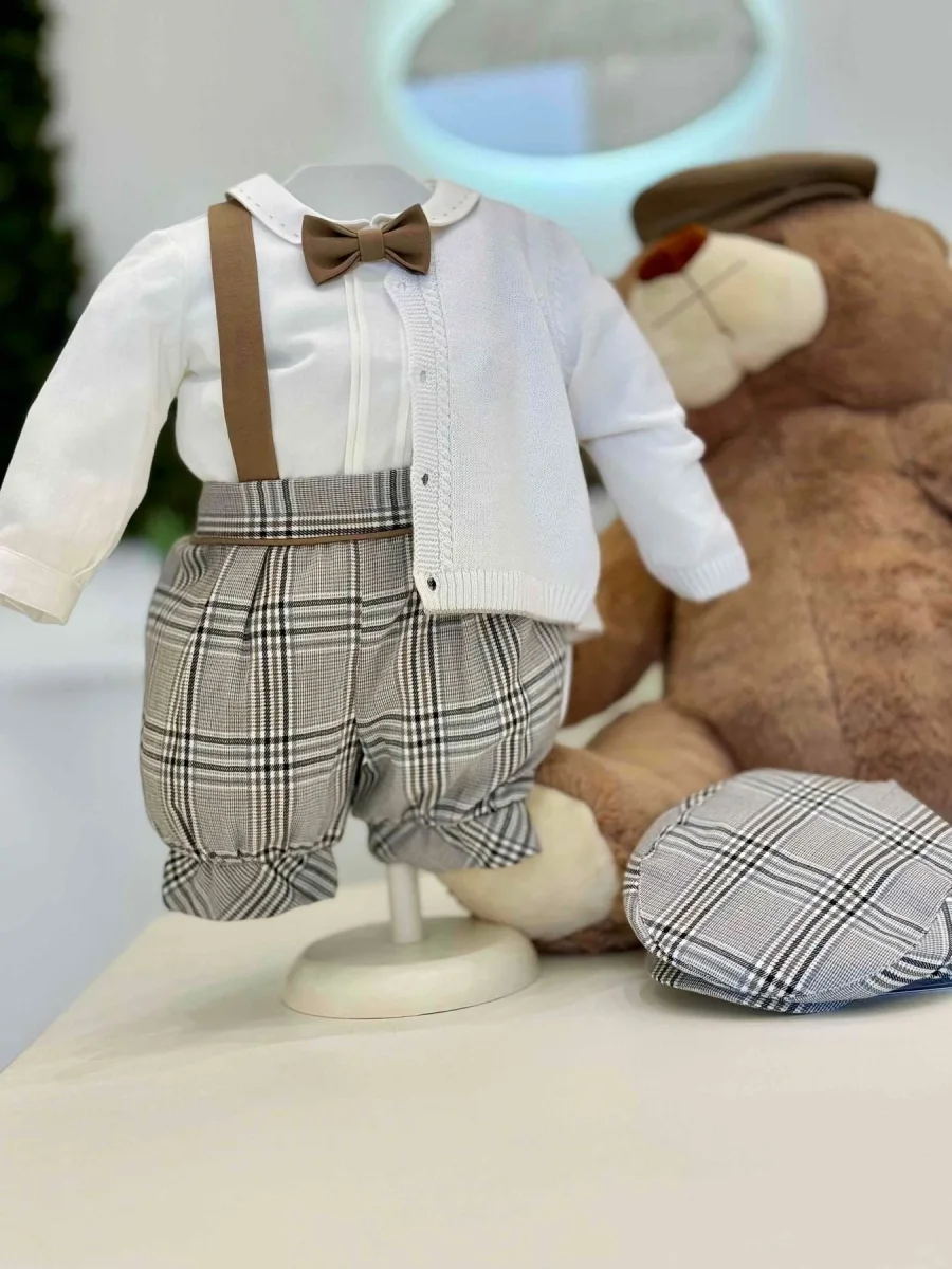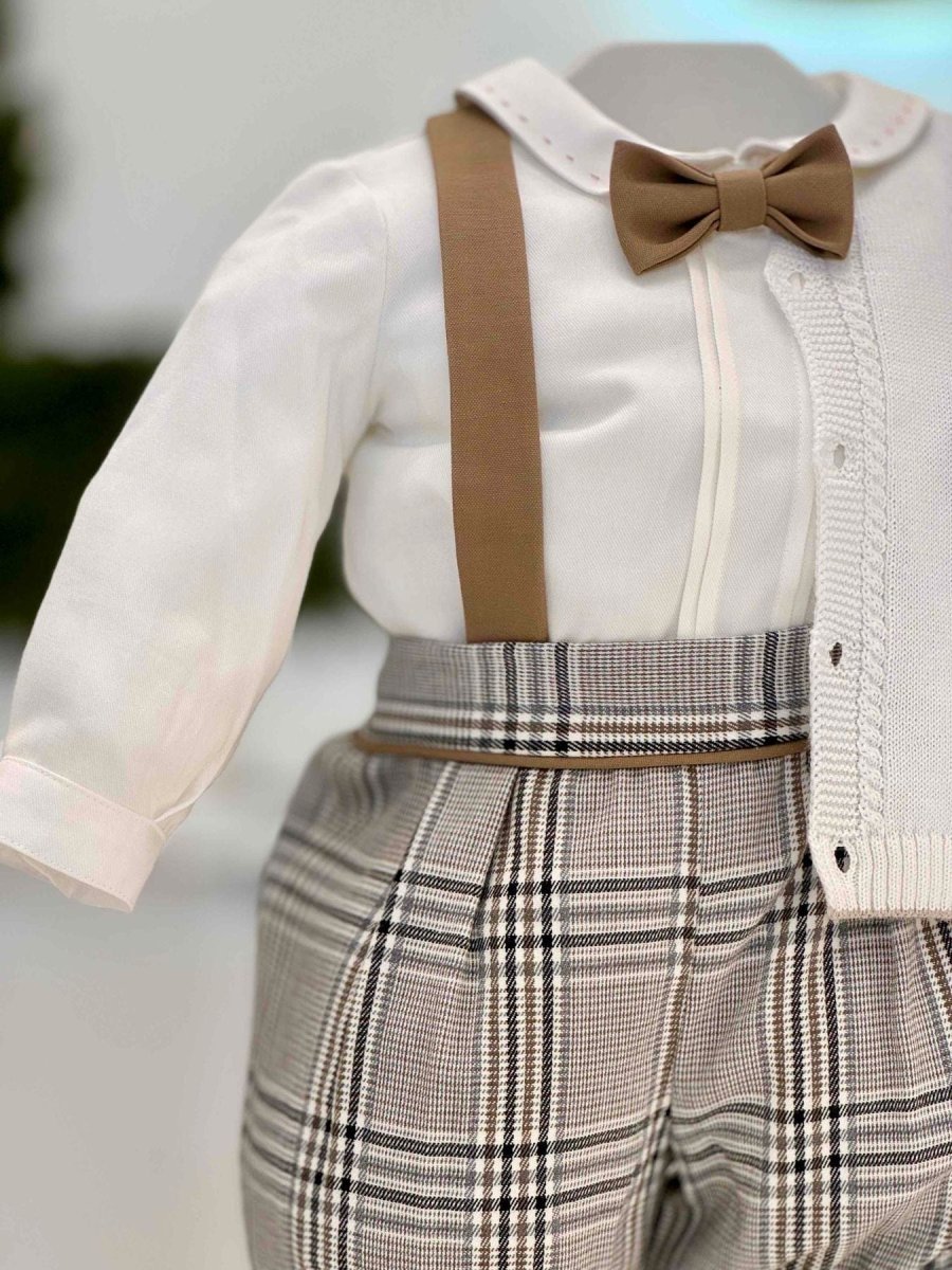 Completo composto da pantalone zuava principe di Galles con bretelle, camicia a body, papillon tortora e cardigan di lana con bordi tortora