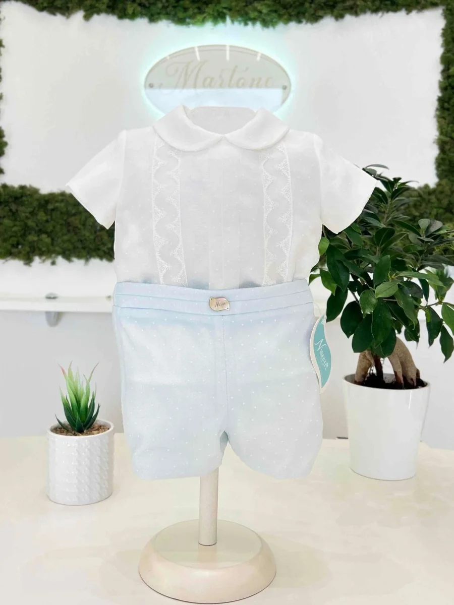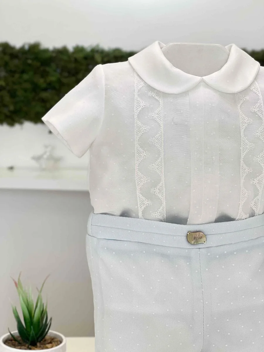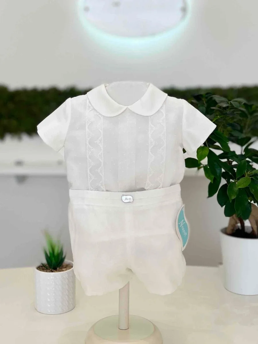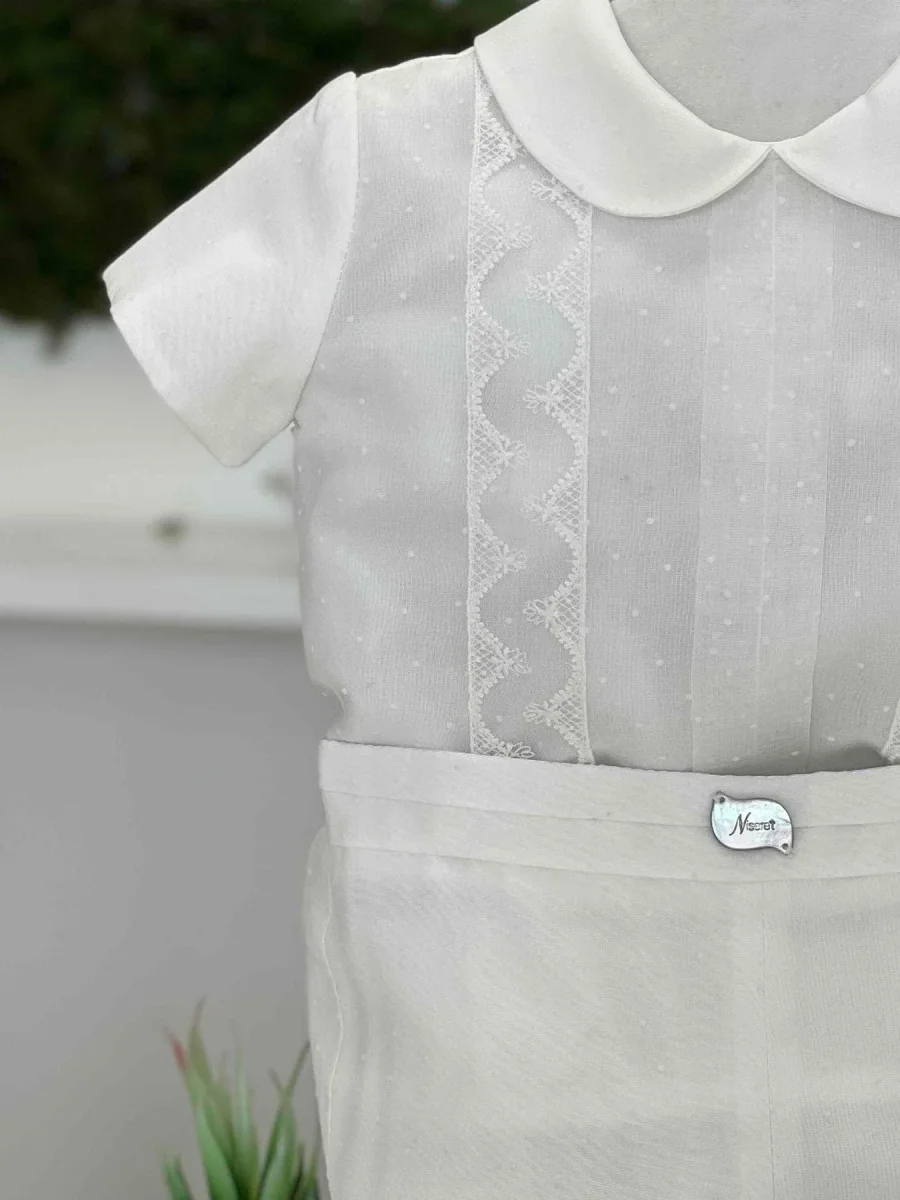 Camicia manica corta doppio strato in lino e plumetis con lavorazione a mano in pizzo, bermuda in plumetis con fascia lavorata in pizzo.