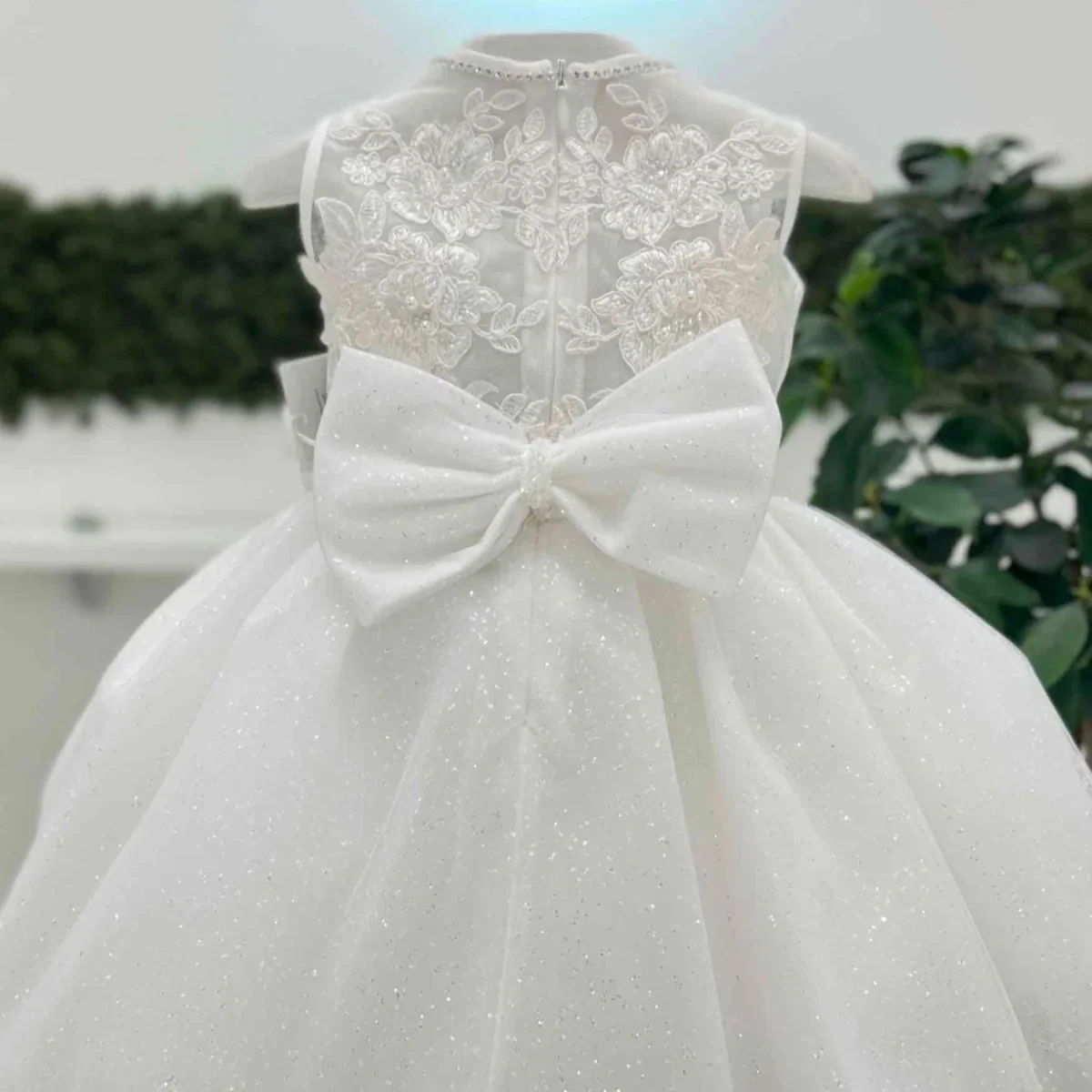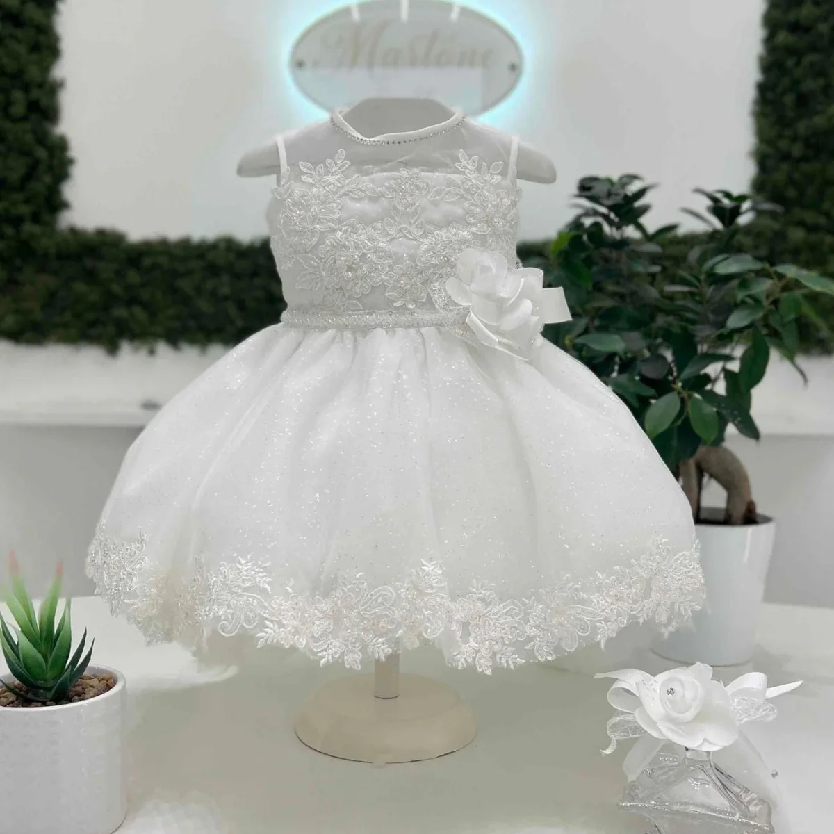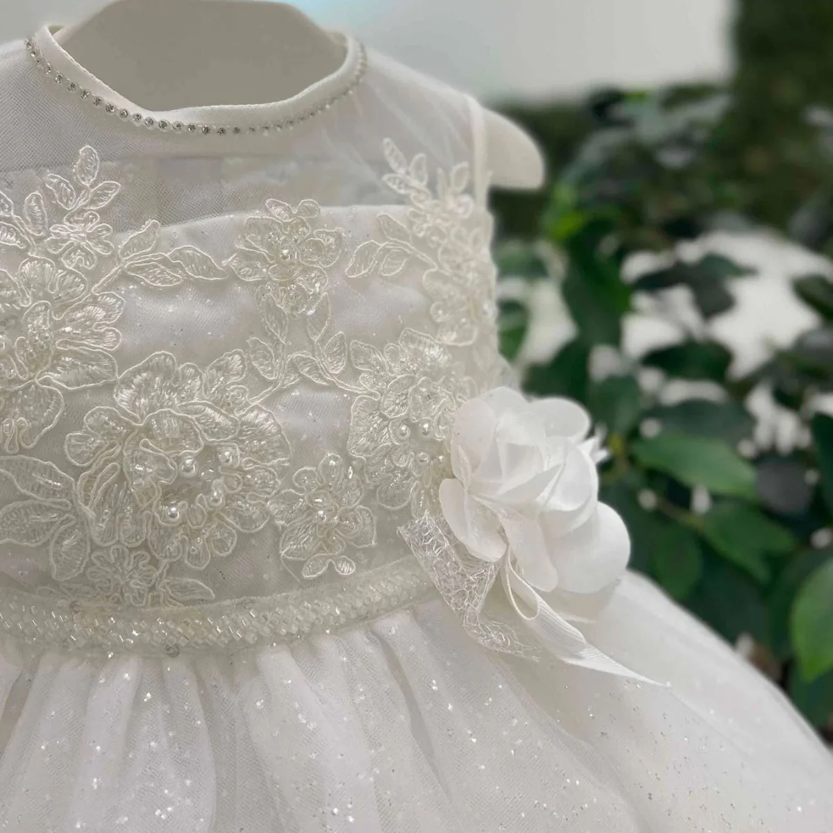 Prezioso abito battesimale neonata in tulle glitterato con coda,