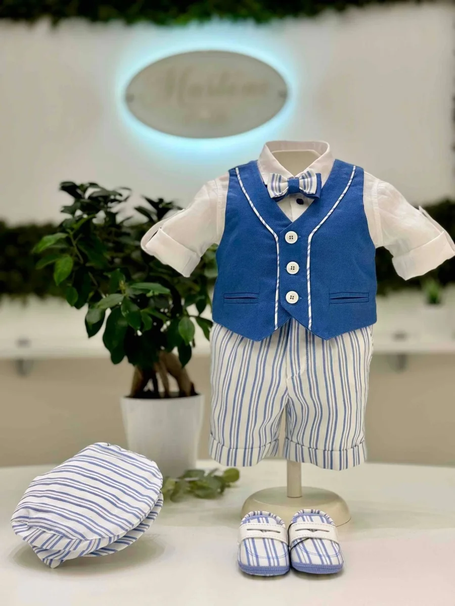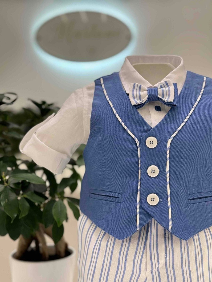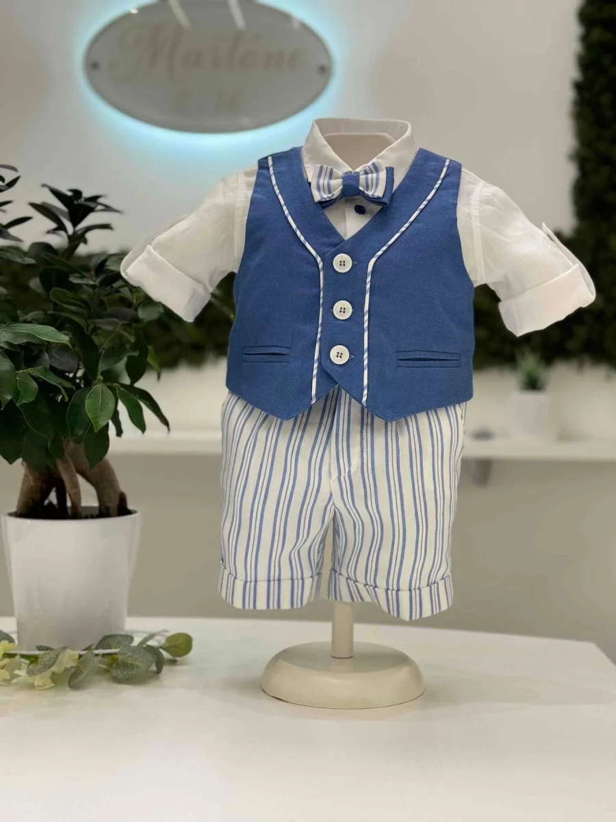 Abito battesimale composto da gilet in cotone con bordatura a righe, camicia body con risvolti in lino e bottoni azzurri, papillon con fantasia a righe e bermuda in lino a righe.