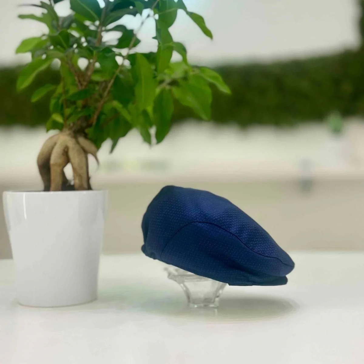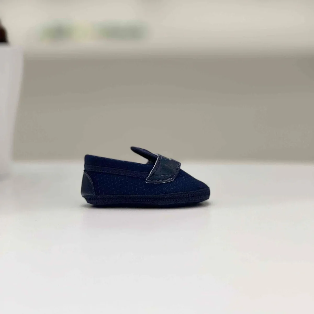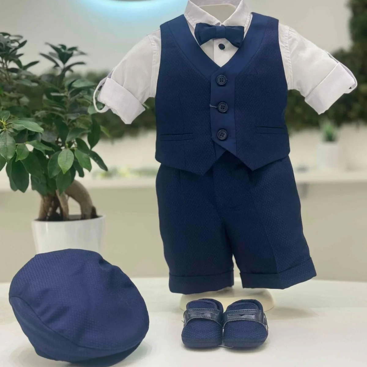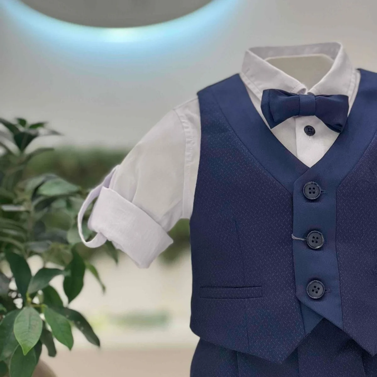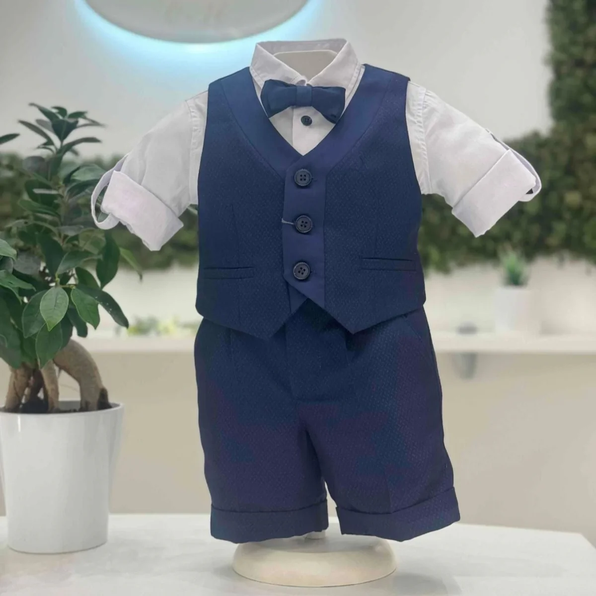 Completo battesimale neonato composto da gilet blu in microfantasia, camicia classica bianca con risvolti e bottoni in blu, bermuda con risvolto in microfantasia e papillon blu.