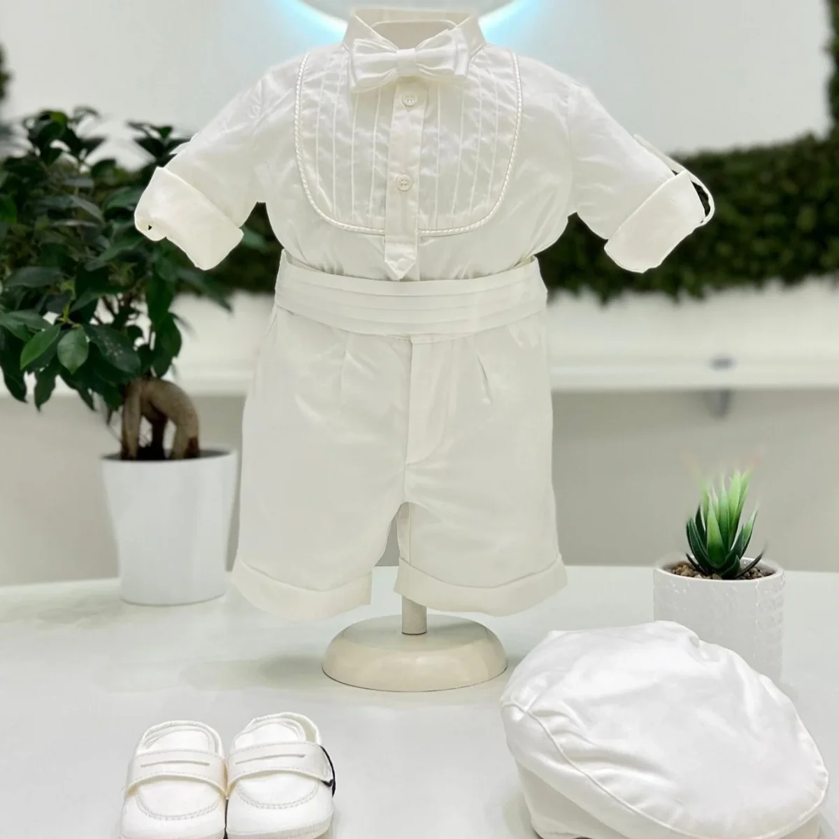 Abito battesimale composto da camicia plissettata con manica con risvolto, papillon coordinato, bermuda e fascia smoking in vita.