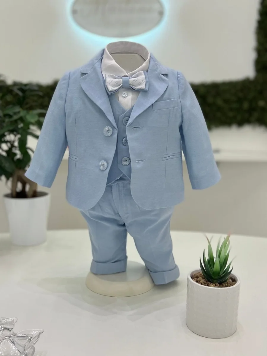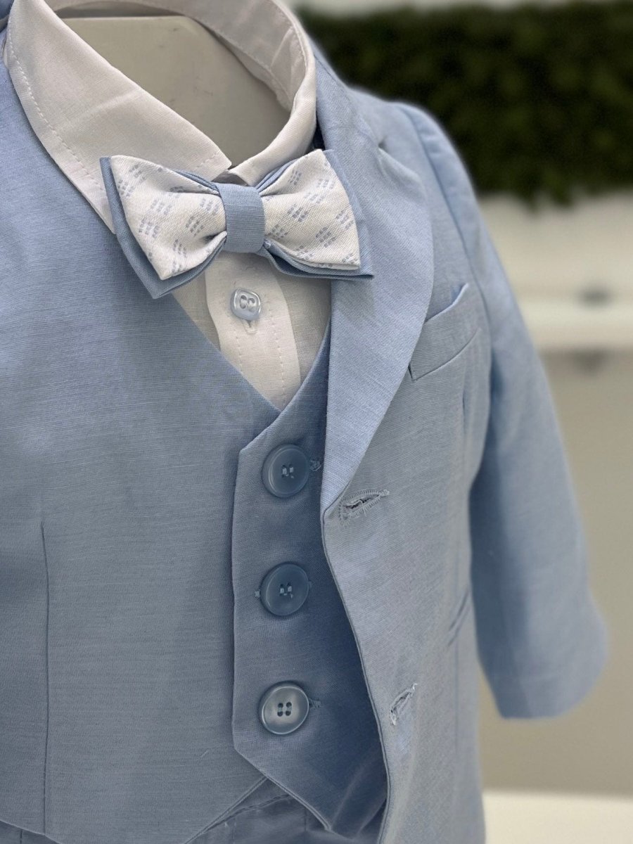 Abito battesimale 5 pezzi in taffetà di seta, con camicia in cotone bianca, gilet, pantalone slim fit e papillon fantasia abbinato.