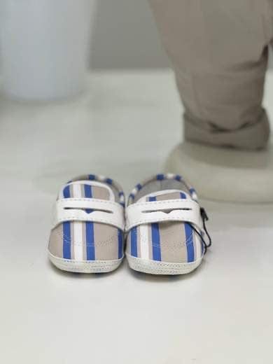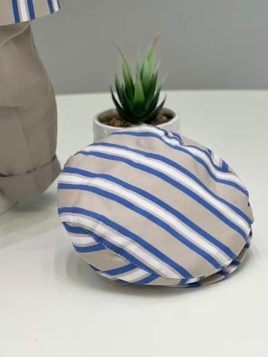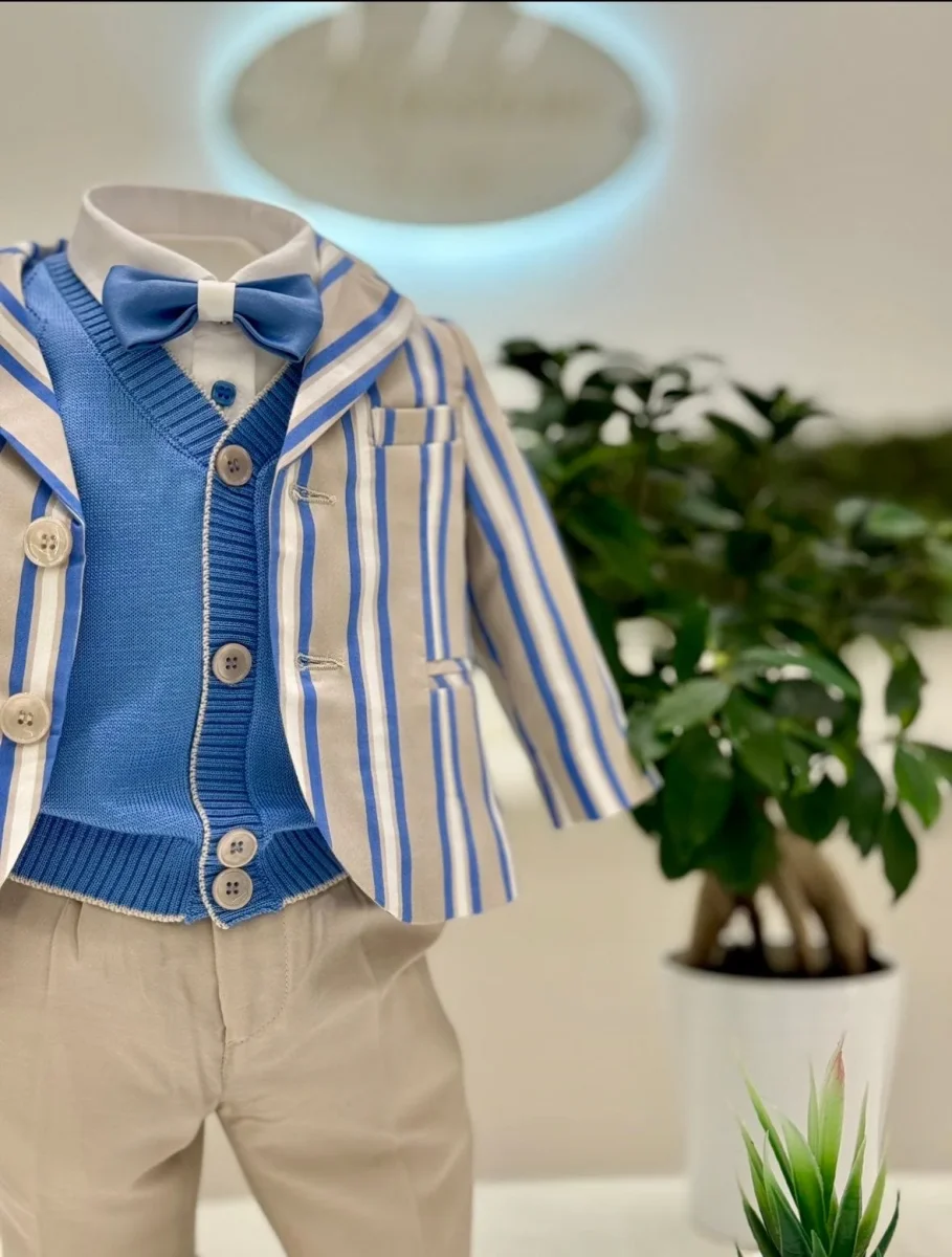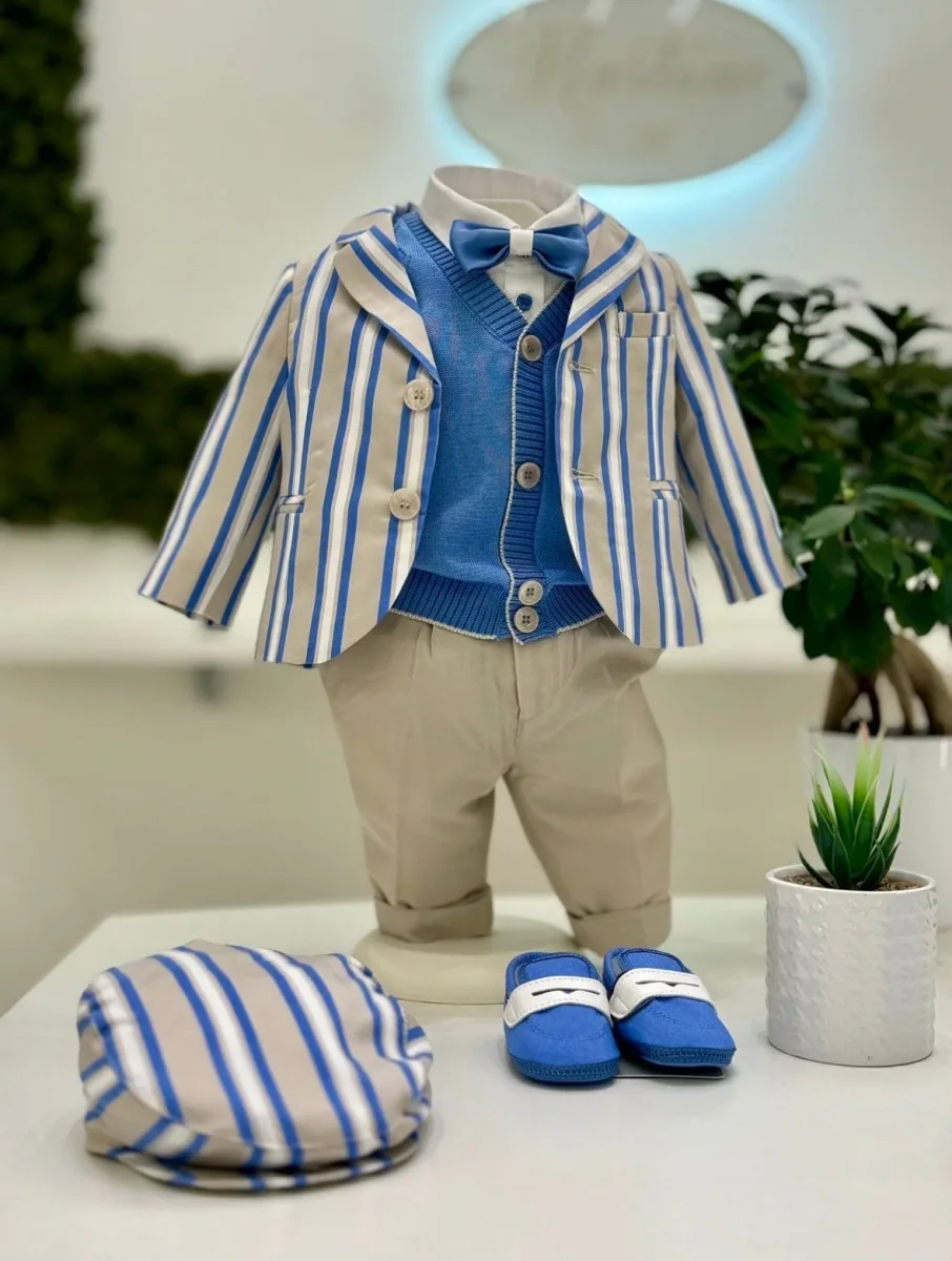 Completo cinque pezzi composto da giacca in cotone con fantasia a righe, gilet in filo di cotone con trama ricamata, camicia in cotone, papillon coordinato e pantalone con risvolto in cotone.