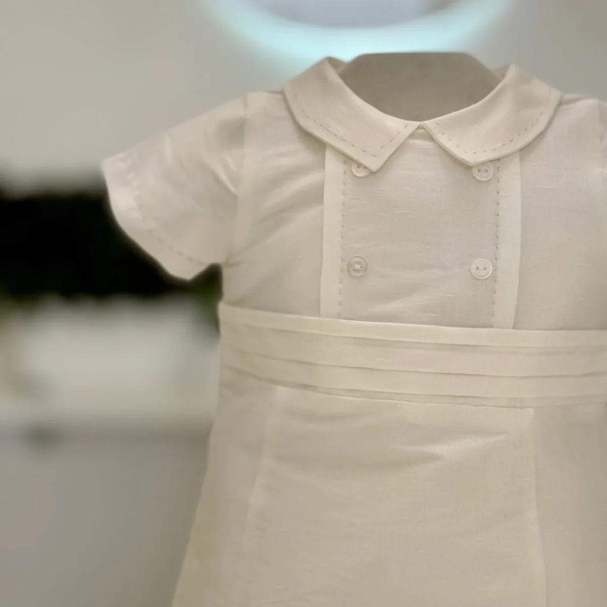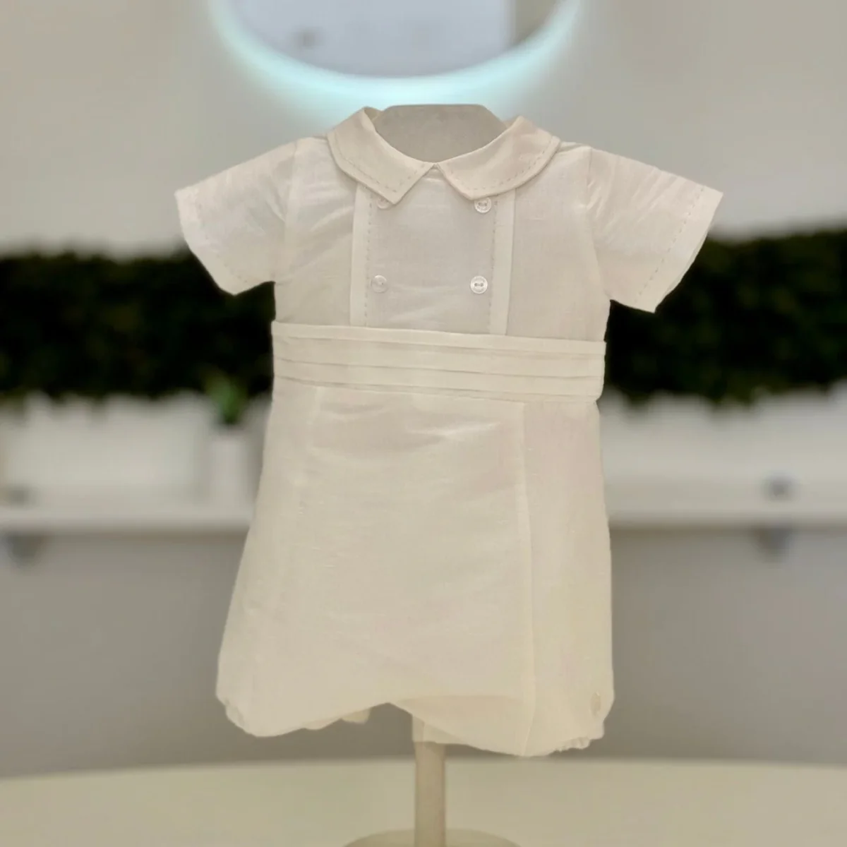 Pagliaccetto bimbo interamente in shantung di seta, con fascia smoking in vita e particolare dettaglio ricamato su colletto e maniche.