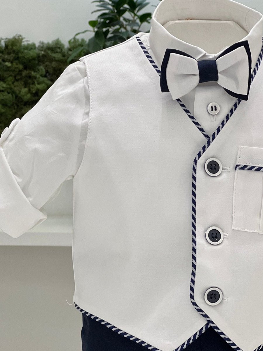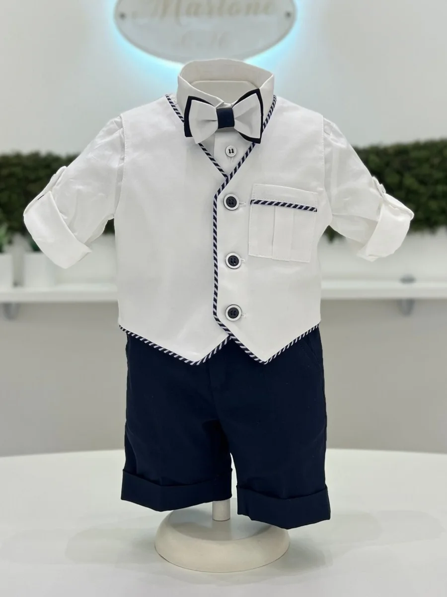 Abito battesimale composto da gilet con profili in blu a righe, bermuda e camicia in cotone con papillon coordinato.