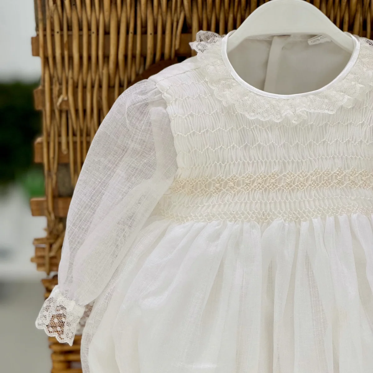 Pagliaccetto battesimale per neonata in tessuto simil batista, decorato con raffinati dettagli in pizzo e punto smock. Dotato di bottoni sul retro per una facile vestizione, questo capo combina eleganza e praticità, ideale per una cerimonia speciale.