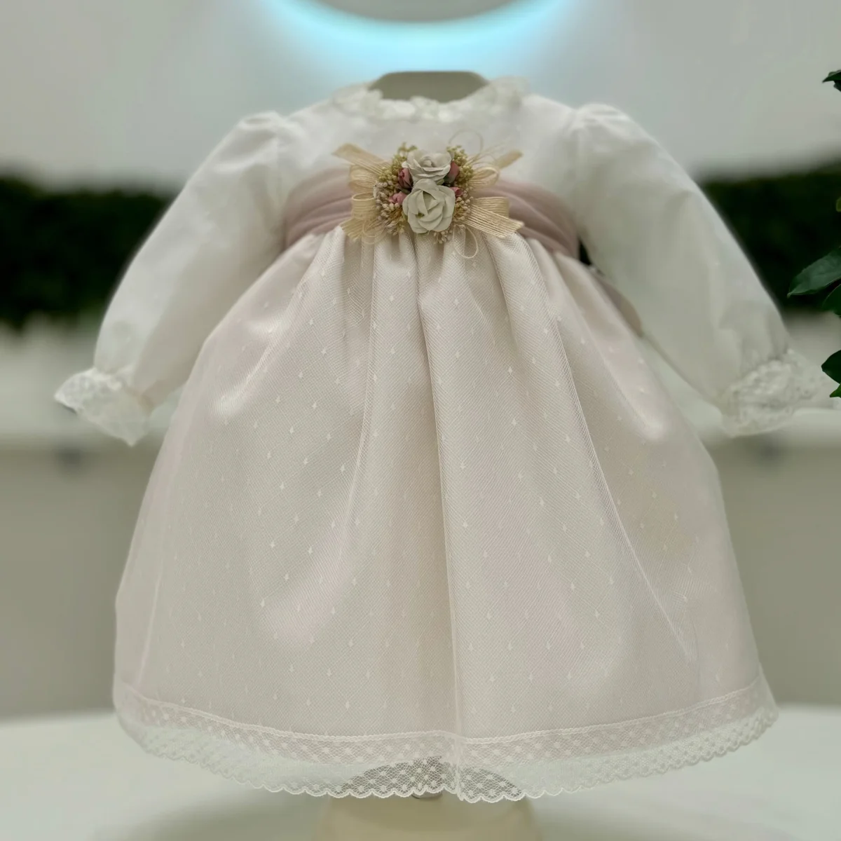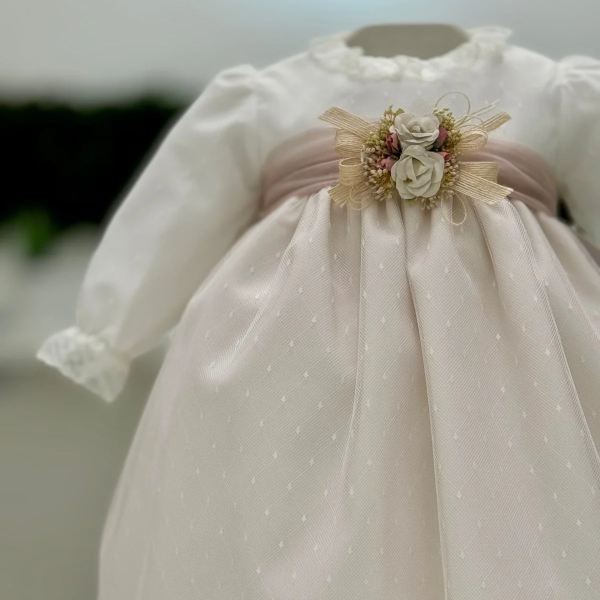 Abito battesimale per neonata con cuffia e culotte, realizzato in tulle e cotone con raffinate rifiniture in pizzo. Questo elegante abito presenta maniche lunghe foderate e una cintura con una spilla removibile, decorata con un delicato dettaglio floreale. Ideale per rendere indimenticabile il giorno del battesimo della tua piccola, unendo comfort e bellezza in un capo speciale.