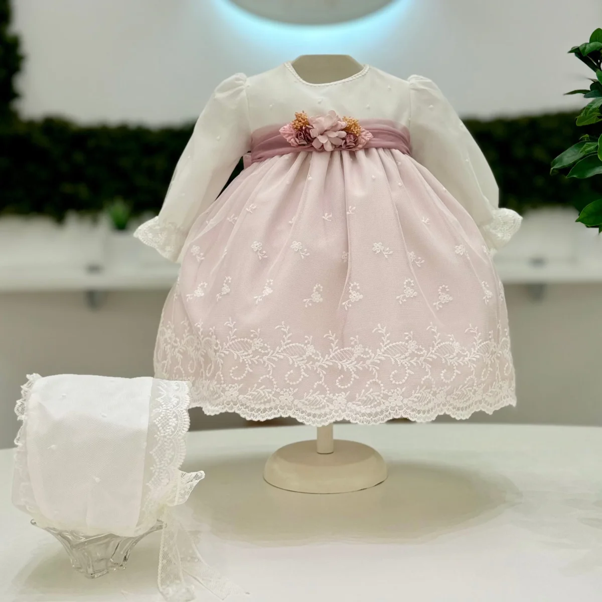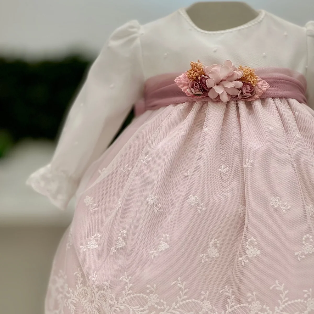 Questo abito battesimale per neonata è un vero incanto, con fondo rosa in tulle e cotone impreziosito da ricami in pizzo macramè. Il set comprende anche una cuffia e culotte coordinate, perfette per completare l’outfit. Le maniche lunghe foderate offrono comfort e calore, mentre la cintura in tulle, ornata da una spilla removibile con delicato dettaglio floreale, aggiunge un tocco di eleganza. Ideale per rendere ancora più speciale e indimenticabile il giorno del battesimo della tua piccola, questo abito unisce dolcezza e raffinatezza in un capo straordinario.