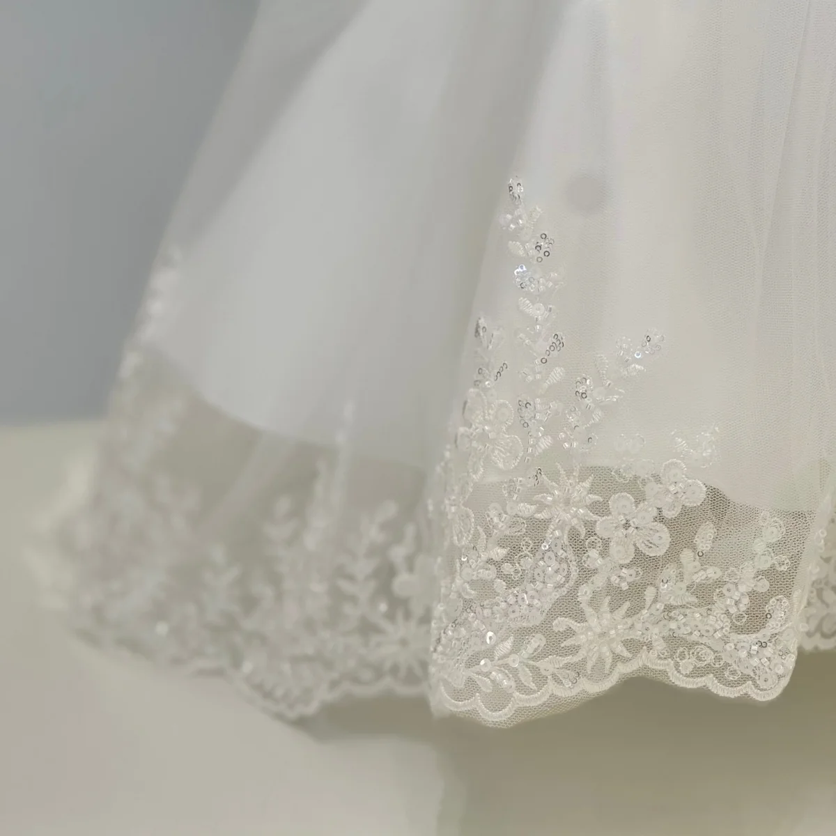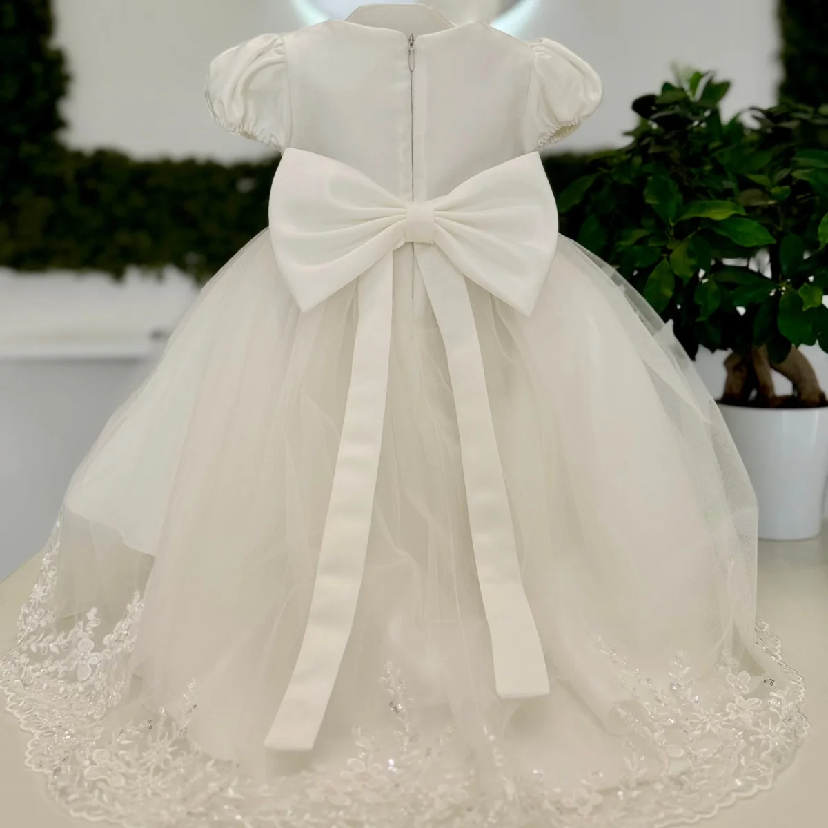 Questo sofisticato abito battesimale per neonata, impreziosito da una coda, combina un corpetto liscio in mikado con maniche a sbuffo per un look raffinato. La gonna in tulle, foderata per garantire comfort, è finemente rifinita sull’orlo con pizzo arricchito da canottiglie. In vita, una cintura liscia avvolge delicatamente la figura, mentre un elegante fiocco rigido sul retro completa l’abito con un tocco distintivo.