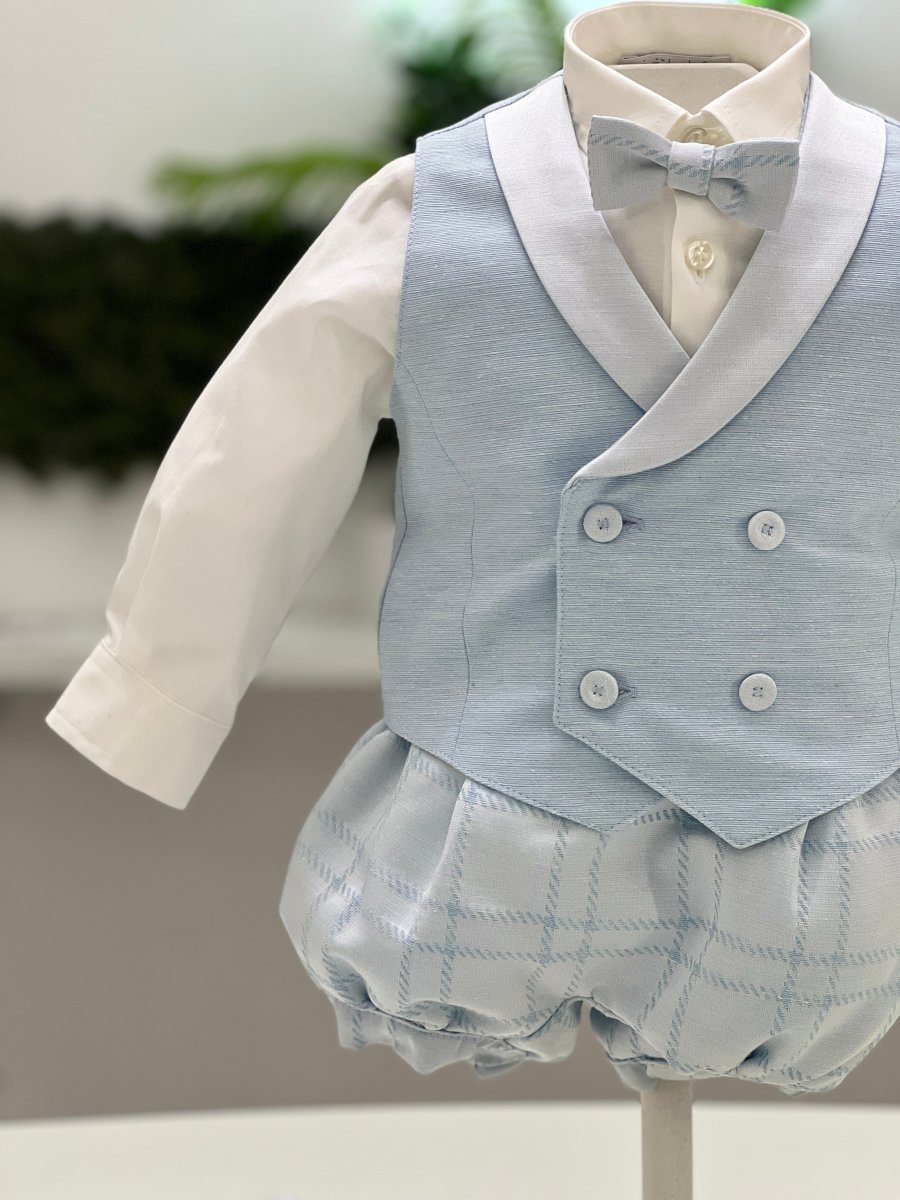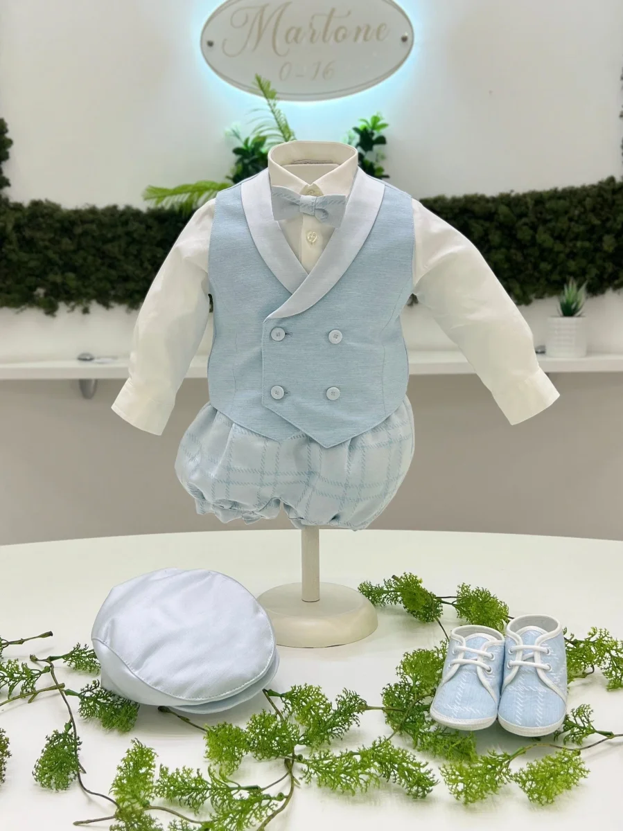 Completo elegante composto da pagliaccetto con bretelle in tessuto operato gabardine a quadri, camicia in cotone, gilet con collo sciallato e papillon coordinato.