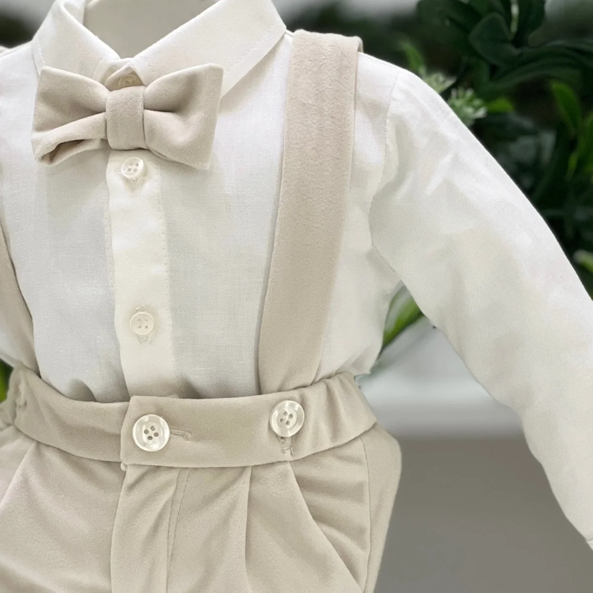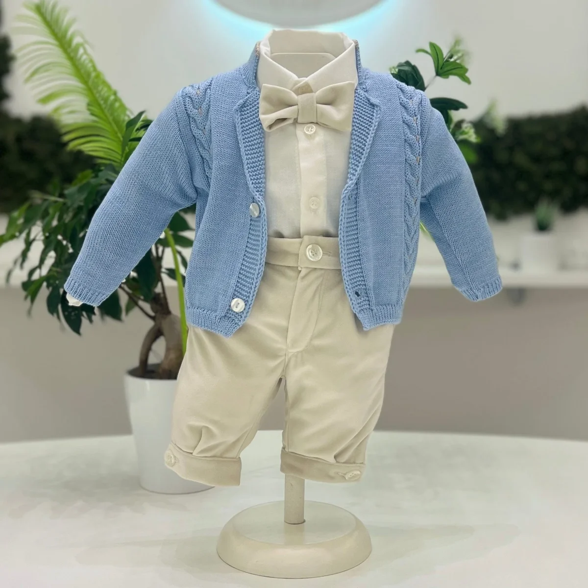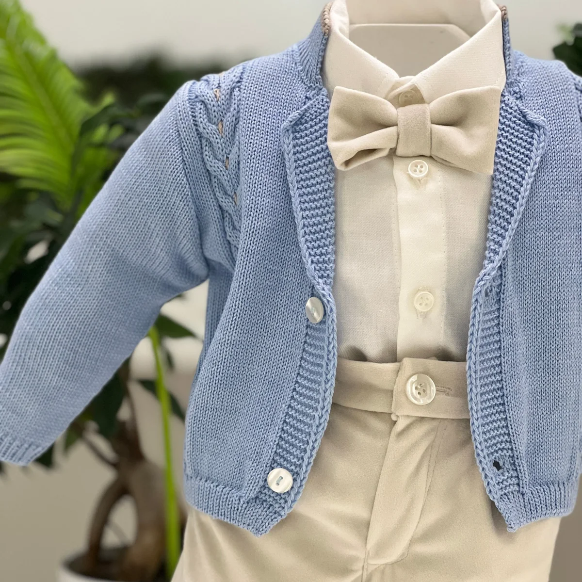 Abito elegante battesimale composto da pantalone alla zuava in velluto con bretelle, cardigan in misto lana con lavorazione a trecce, camicia in cotone classica bianca e papillon coordinato.