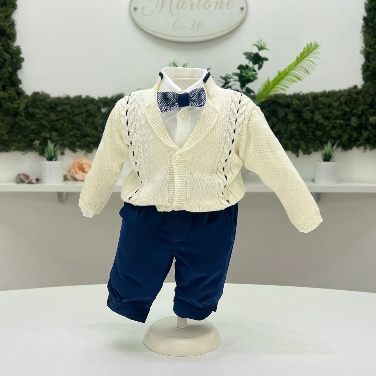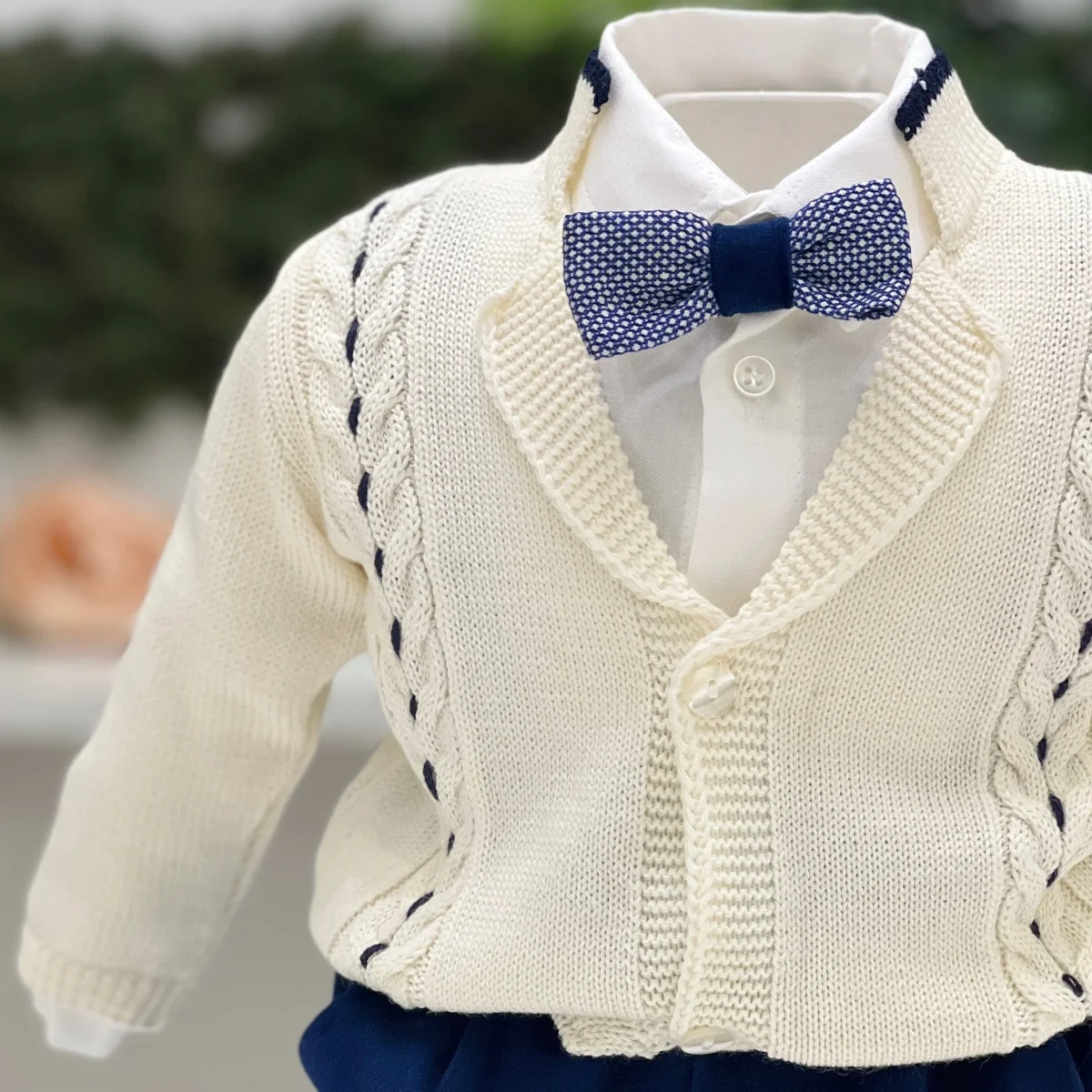 Completo velluto blu, camicia in cotone, cardigan panna con cuciture a contrasto e papilloon coordinato.
