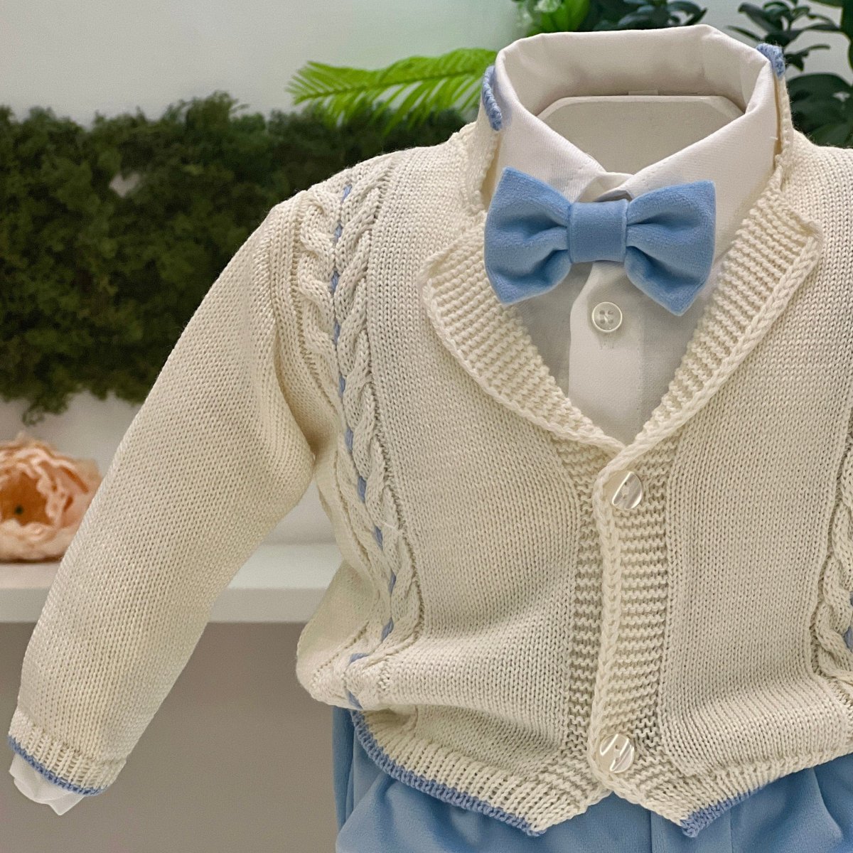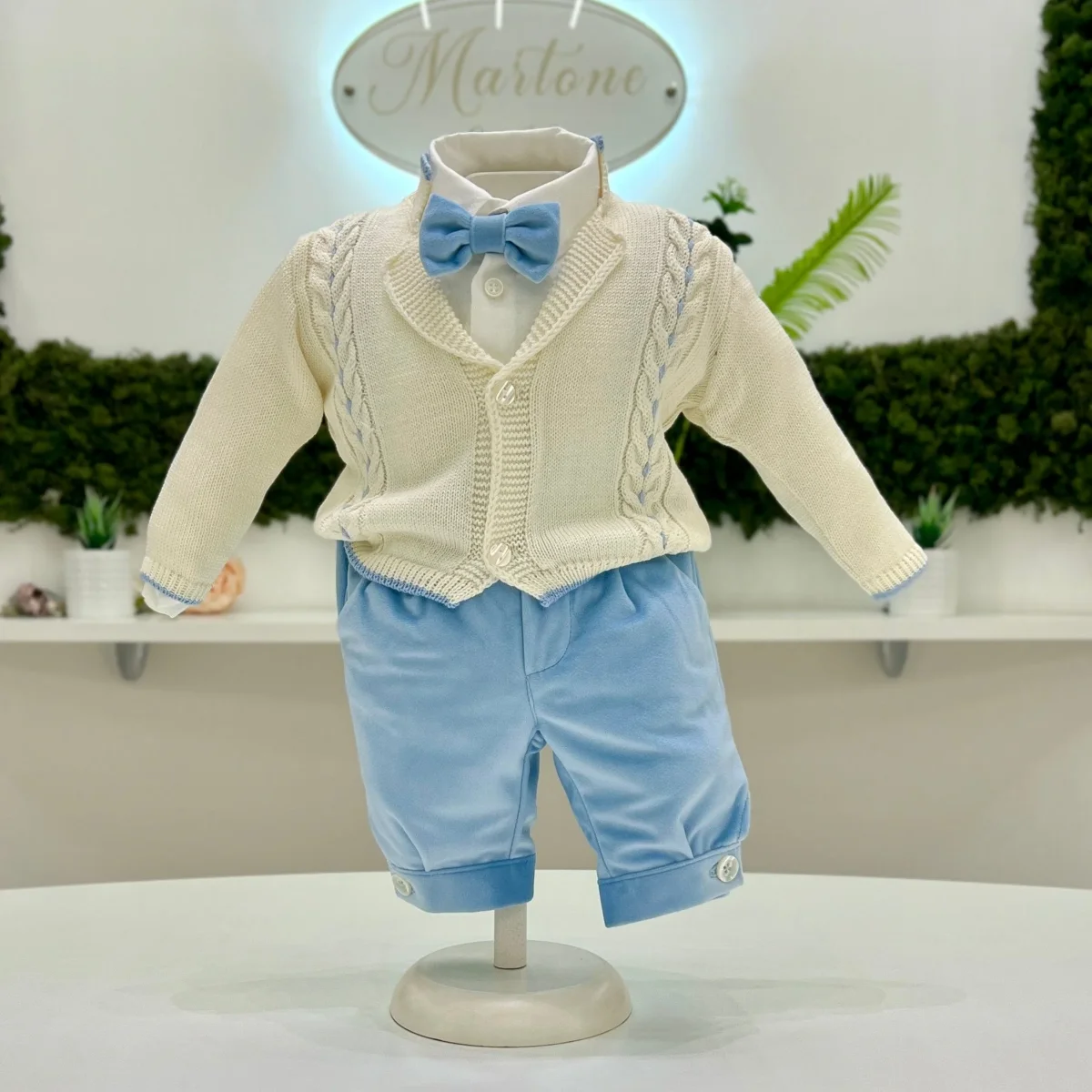 Completo velluto , camicia in cotone, cardigan panna con cuciture a contrasto e papilloon coordinato.