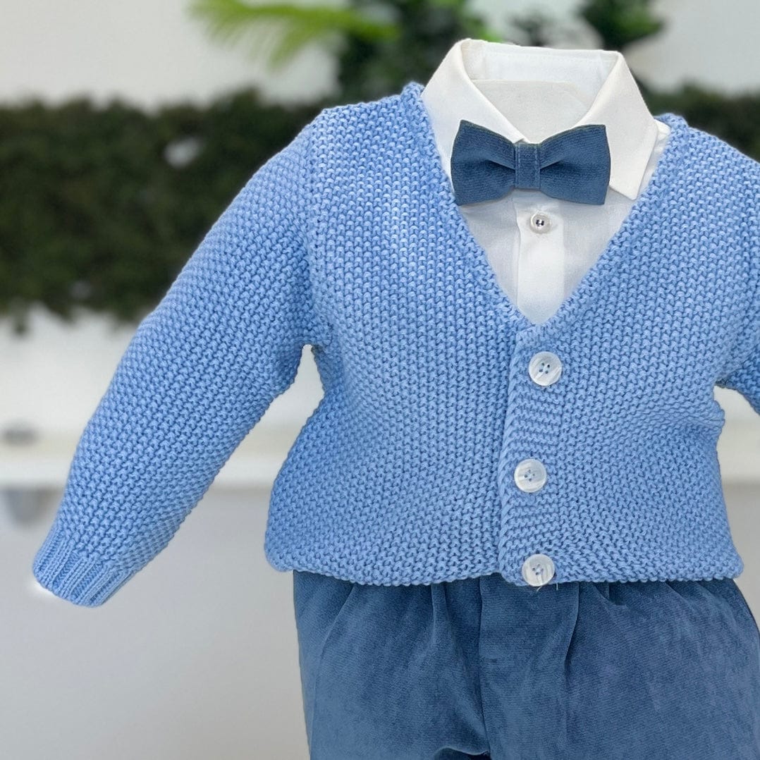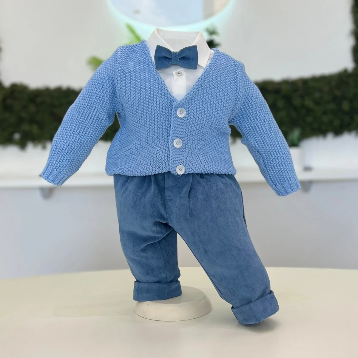 Abito elegante, cardigan lavorato a maglia con scollo a v, pantalone in velluto con risvolto, papillon coordinato e camicia in cotone.