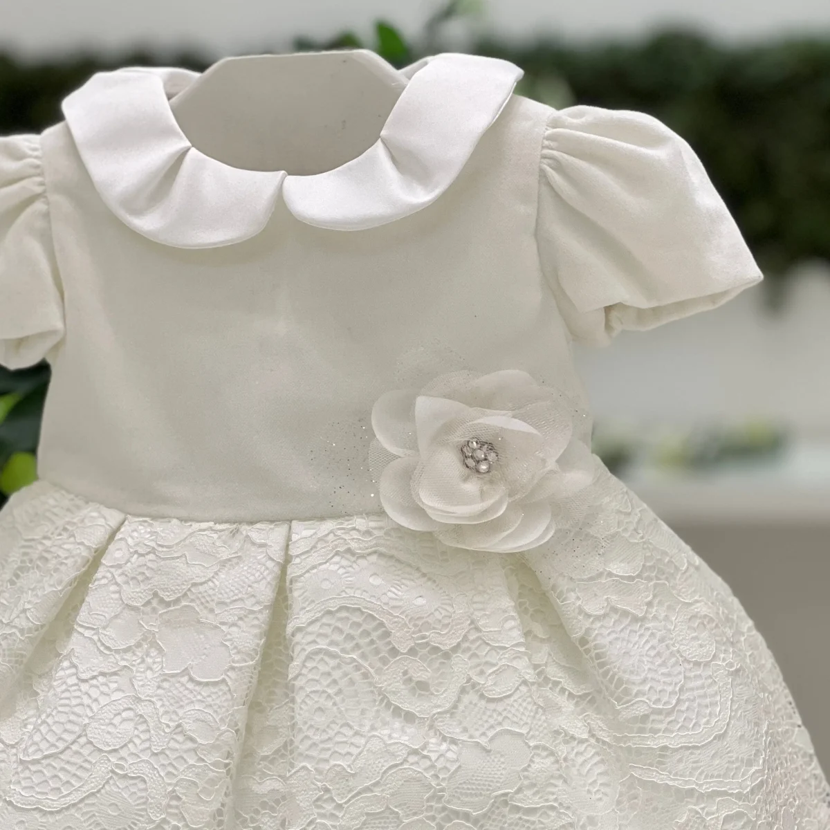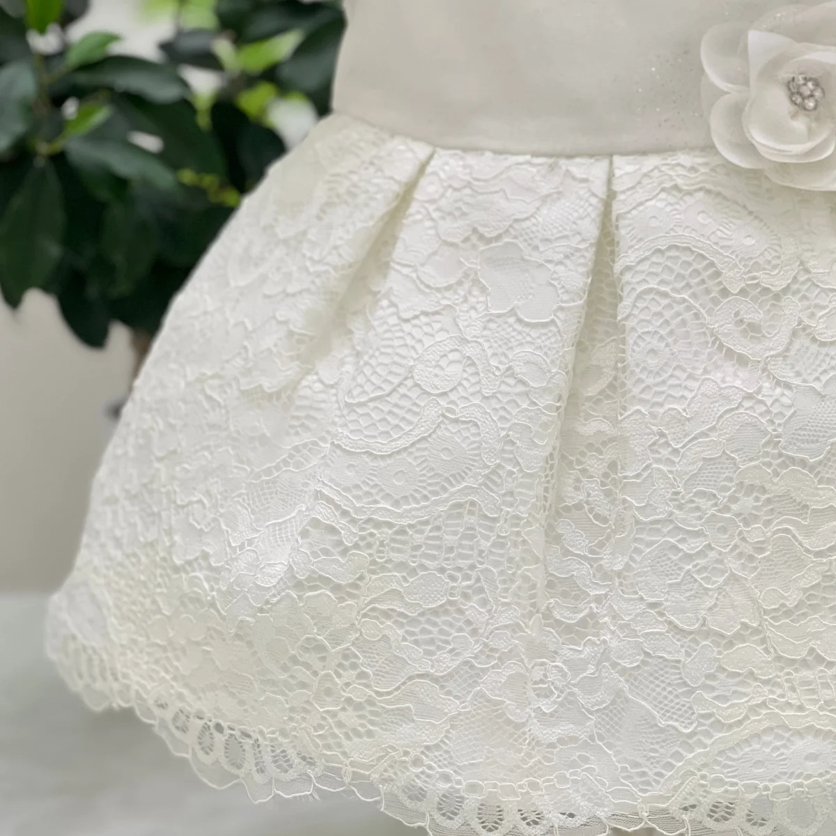 Abito battesimale mezza manica con corpetto di velluto e gonna di merletto con fiore in vita
