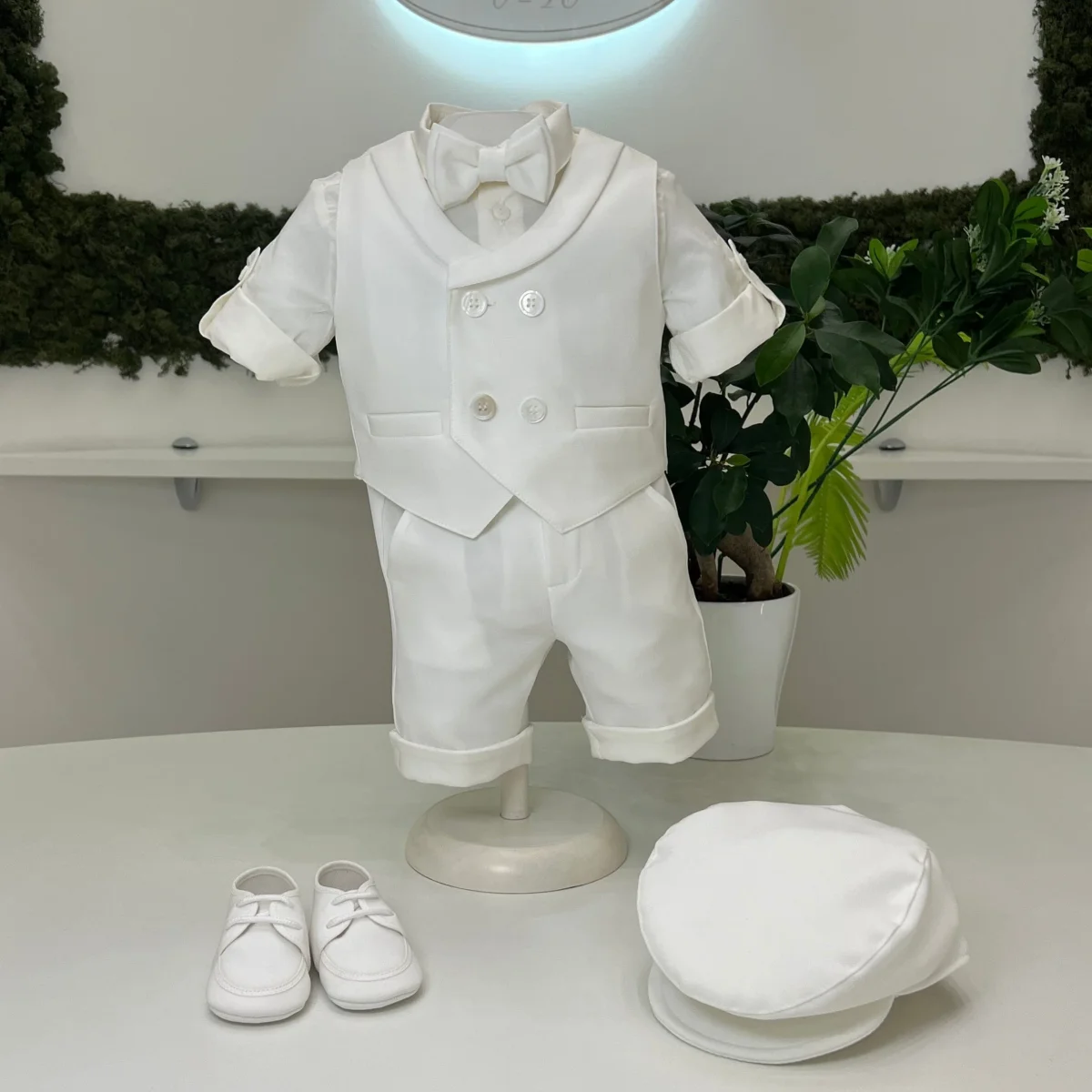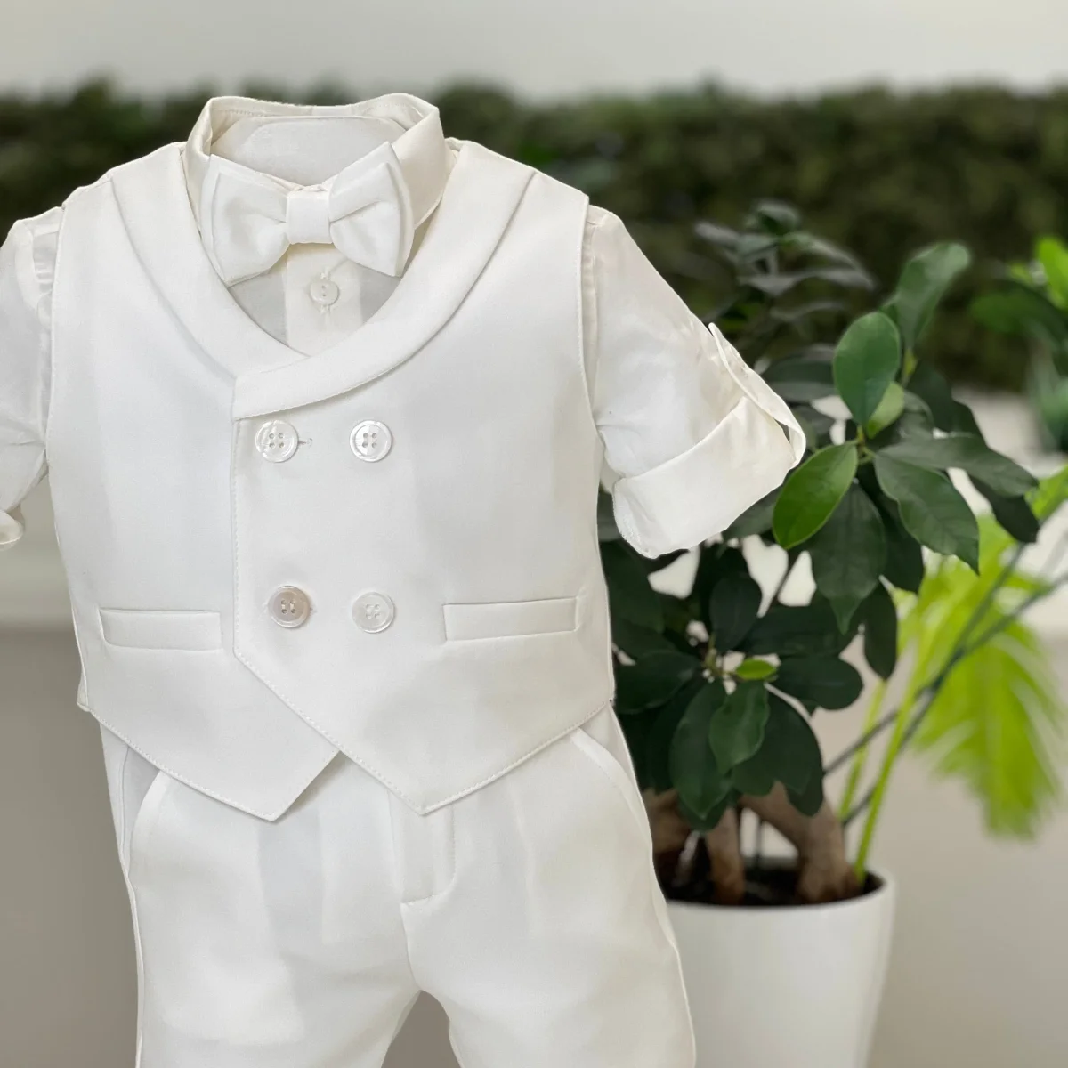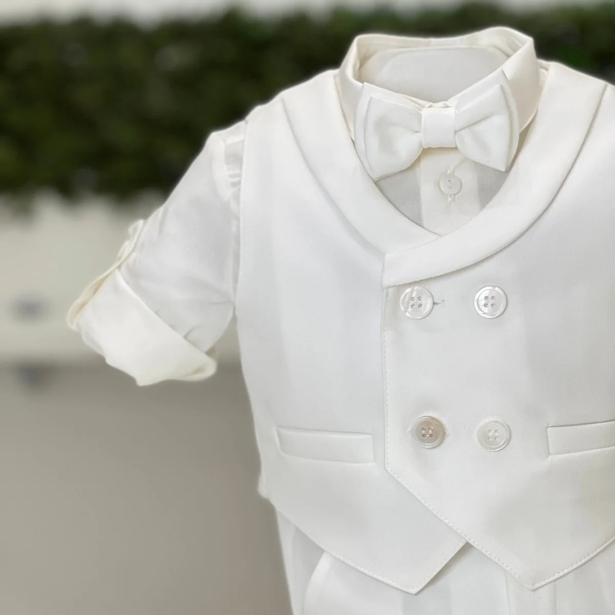 Un abito da battesimo per maschietto che esprime una raffinatezza senza pari. Realizzato in un esclusivo tessuto bianco effetto seta, il completo è la quintessenza dell’eleganza classica. Il bermuda, con risvolto e bretelle regolabili, offre un equilibrio perfetto tra comfort e stile, mentre il gilet doppiopetto con rever sciallato aggiunge un tocco sofisticato, quasi sartoriale. La camicia in cotone bianco, impeccabile nella sua semplicità, è arricchita da un papillon che completa il look con un accenno di modernità. Un abito pensato per il giovane dandy contemporaneo, dove ogni dettaglio è curato con precisione sartoriale.