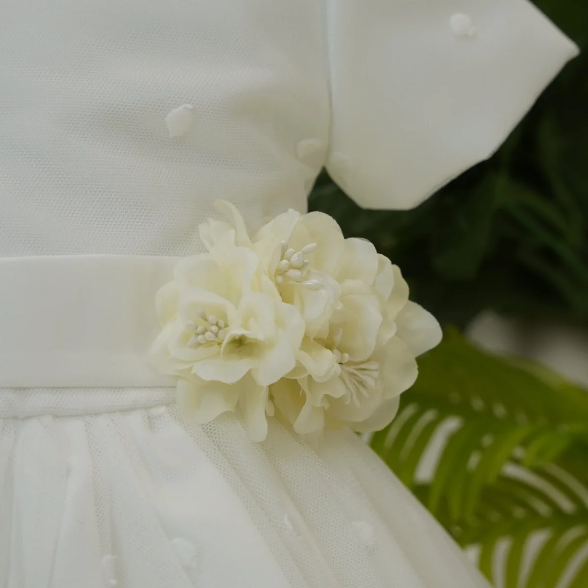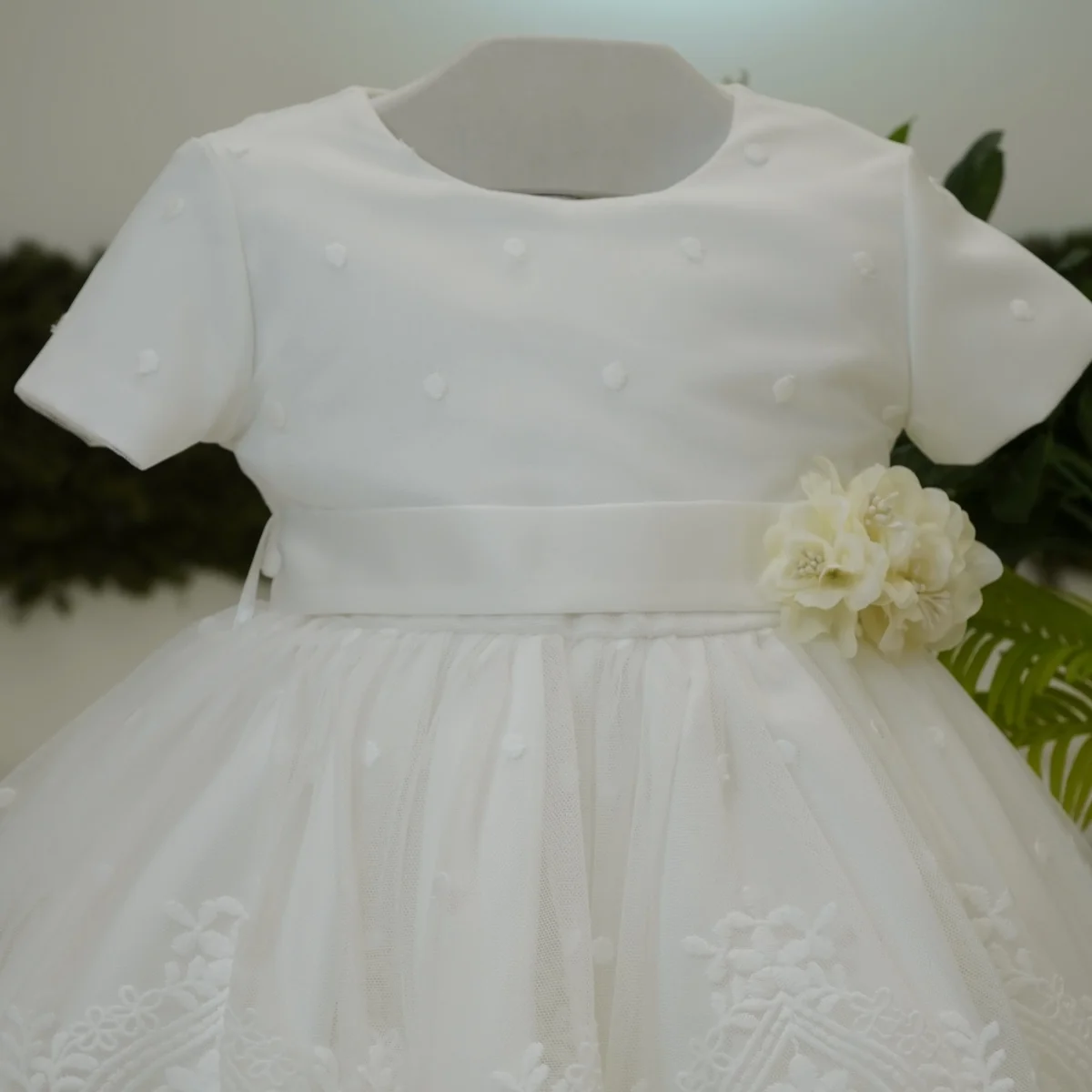 Abito da battesimo per neonata in tulle ricamato con delicato bordo in pizzo. Il corpetto in plumetis conferisce un tocco di eleganza, mentre la cintura in vita, adornata da una spilla floreale, aggiunge un dettaglio raffinato. Completato da una leggera coda, è il perfetto connubio di dolcezza e stile per un’occasione speciale.