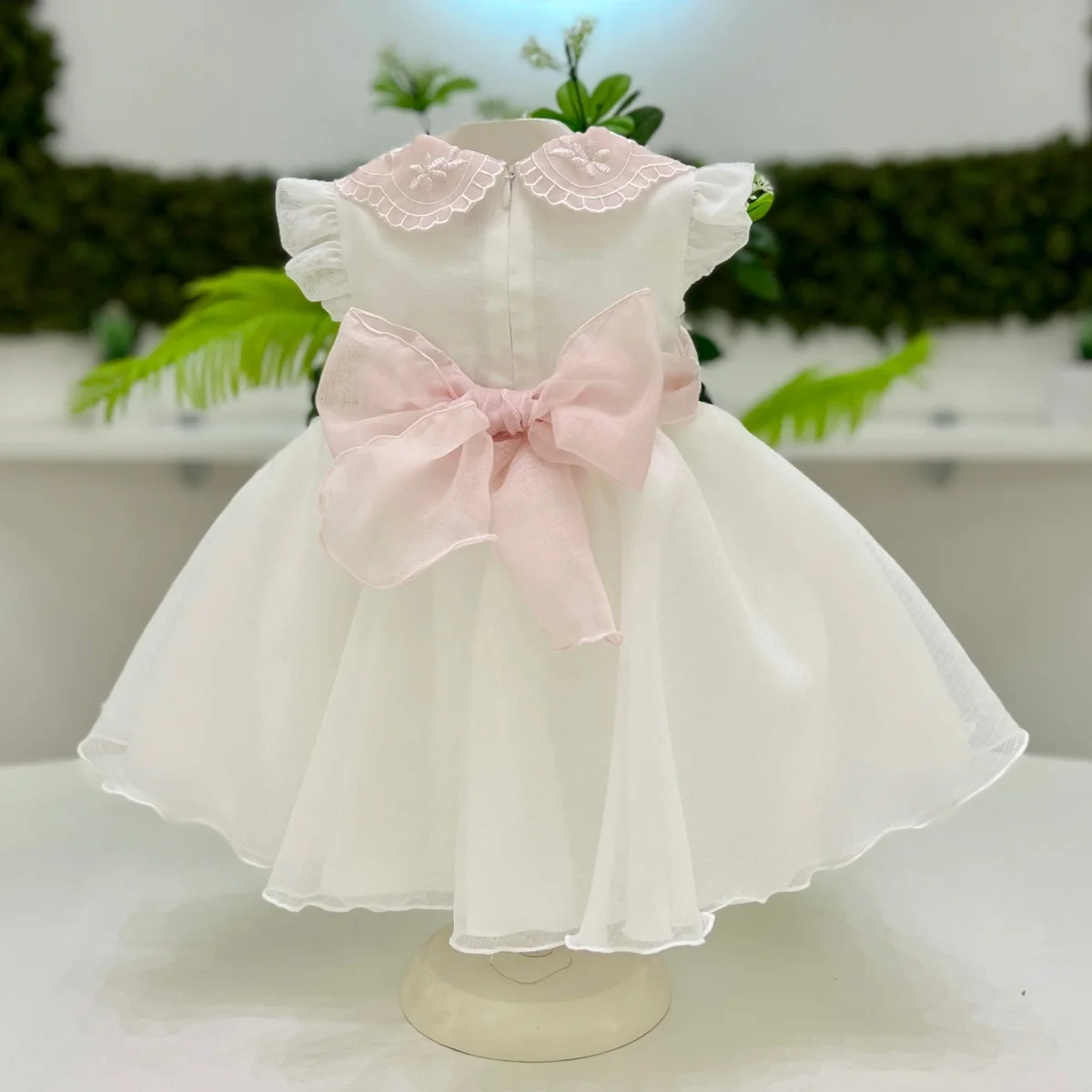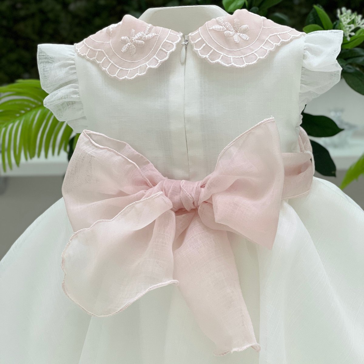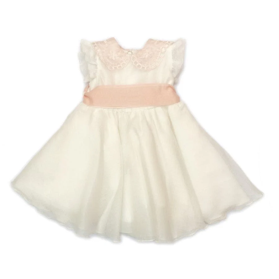 Abito da cerimonia rosa con un corpetto senza maniche, impreziosito da un delicato pizzo rosa e due fiocchi applicati sulle spalle per un tocco di eleganza. La gonna voluminosa con ampie pieghe crea un effetto romantico e raffinato. L’apertura posteriore con zip invisibile aggiunge praticità e perfezione al design. Un abito ideale per le occasioni speciali, che unisce grazia e stile.