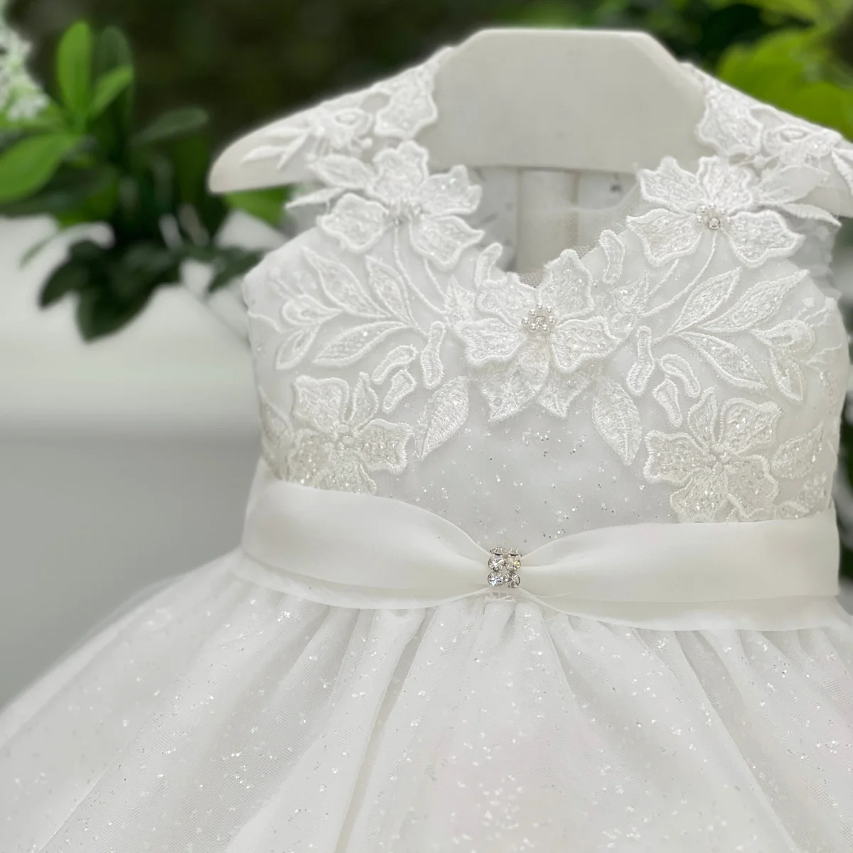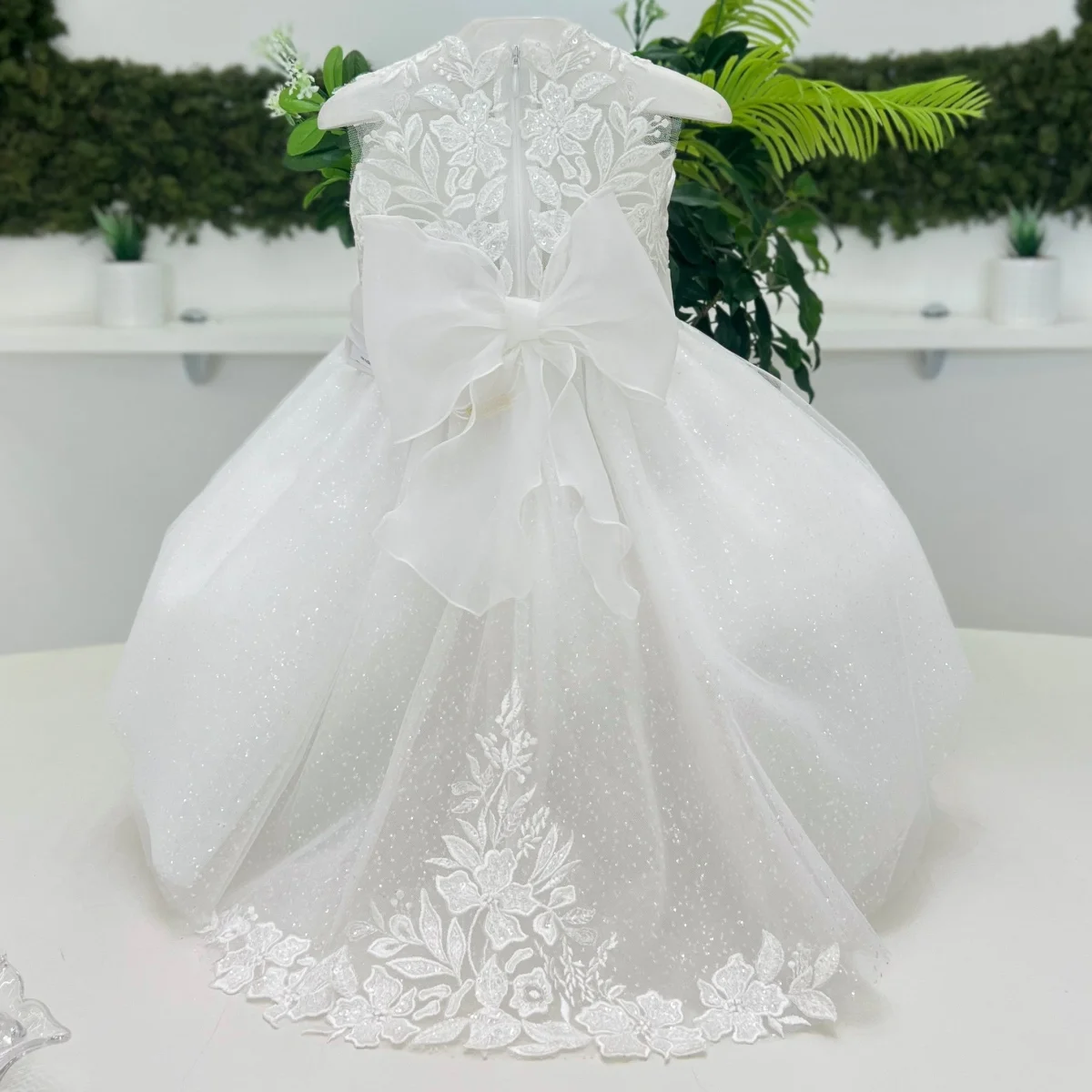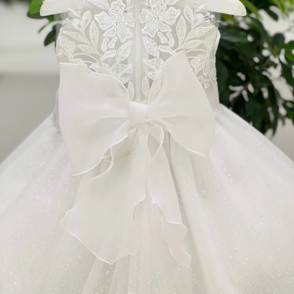 il corpino effetto tattoo in pizzo si fonde armoniosamente con la gonna in tulle glitterato, arricchita da una coda in pizzo che dona movimento e charme. In vita, una delicata cintura in organza con fiocco sul retro e punto luce frontale completa il look con un tocco prezioso.