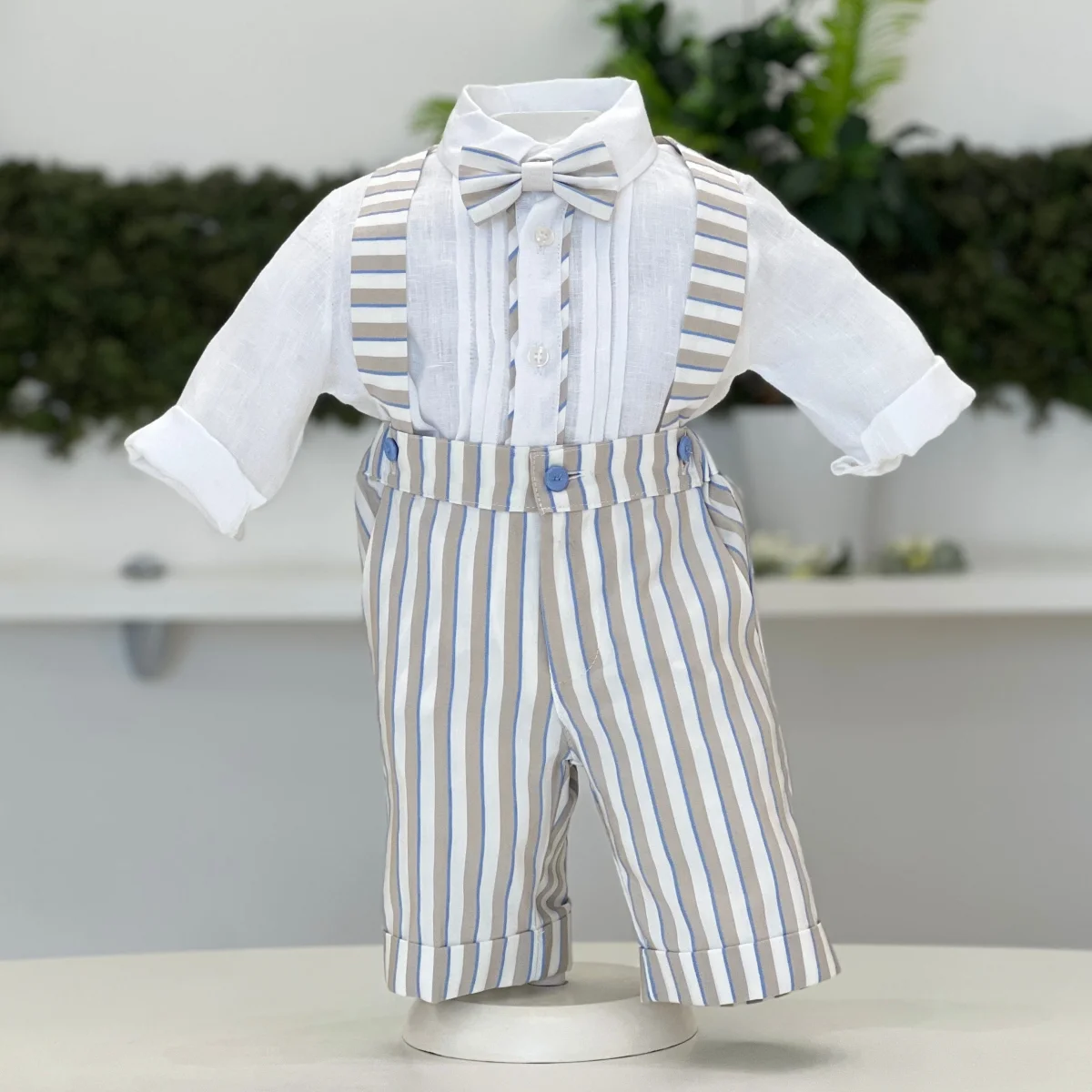 Completo elegante battesimale in lino, composto da pantaloncino con bretelle a righe e camicia coordinata, arricchita da un papillon tono su tono. Un look raffinato e sofisticato, ideale per le occasioni più speciali.