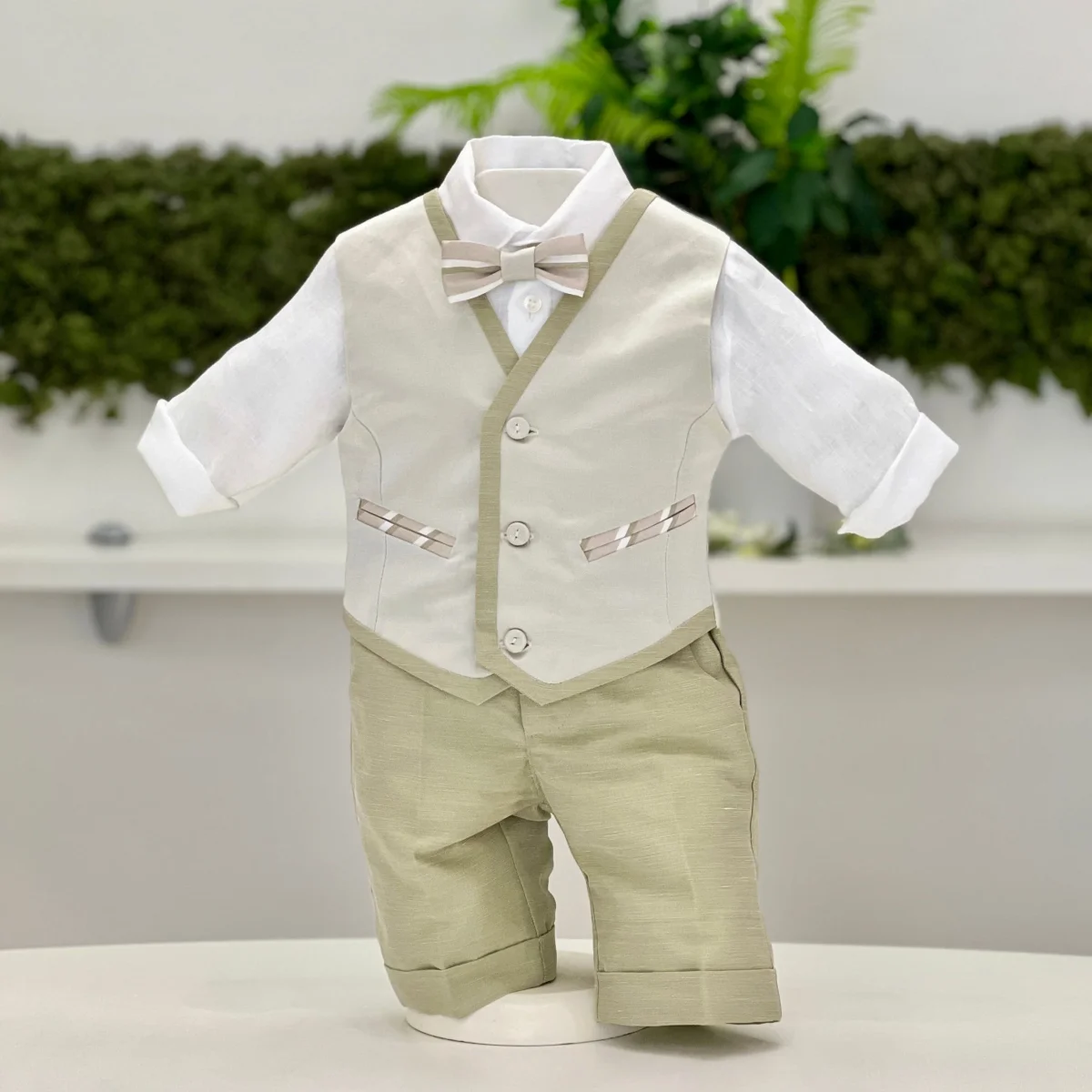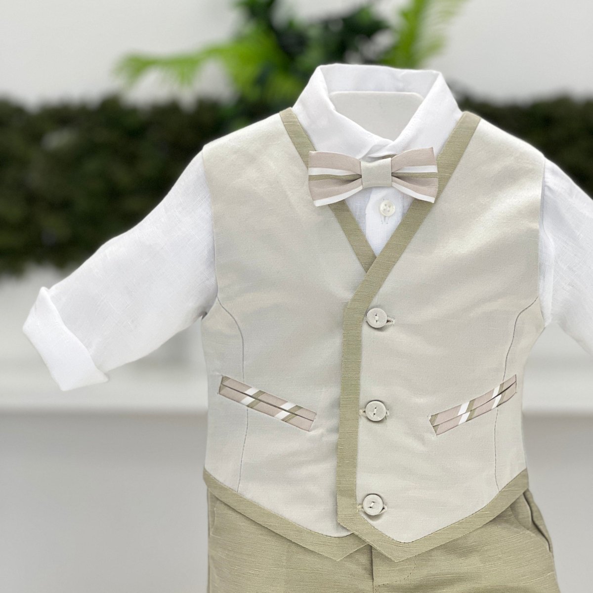 Completo elegante in shantung, composto da pantaloncini con gilet coordinato, arricchito da profili a contrasto e papillon a righe. La camicia in lino coordinata completa l’outfit, creando un look raffinato e sofisticato, perfetto per le occasioni speciali.