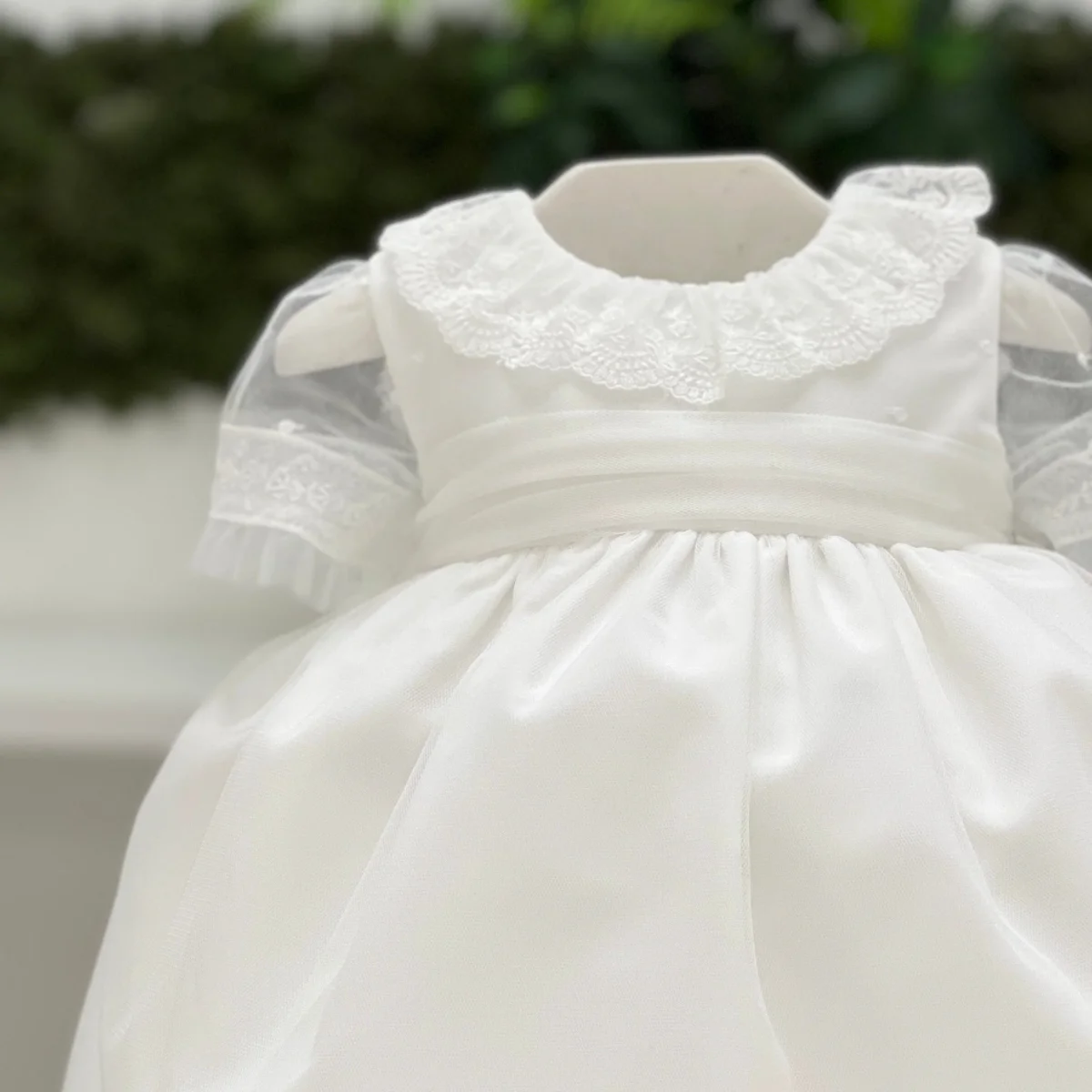 Abito battesimale in tulle con colletto in pizzo, scollo a puntina sul retro e maniche in trasparenza bordate in pizzo. La cintura in vita con fiocco completa il modello con un dettaglio delicato e raffinato.