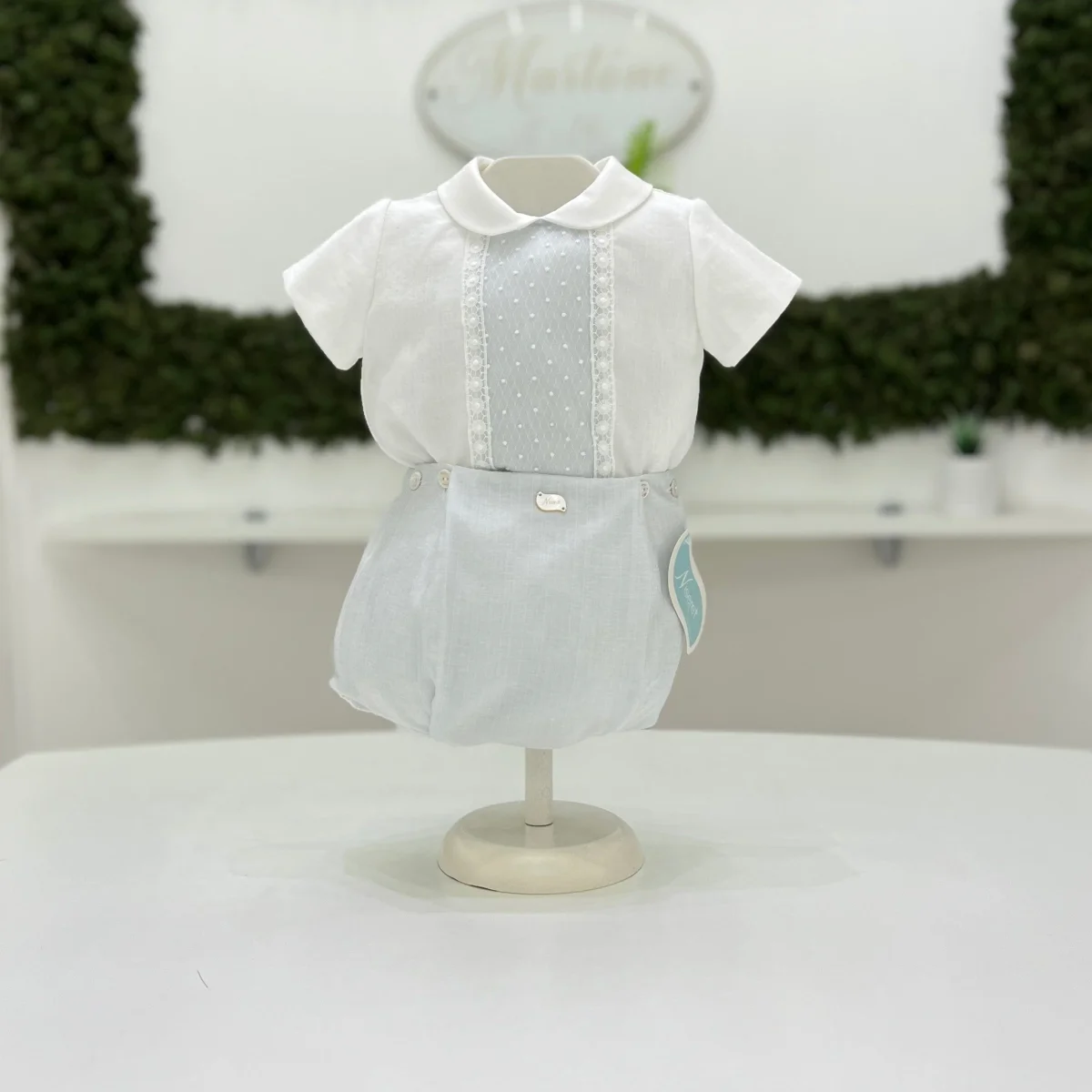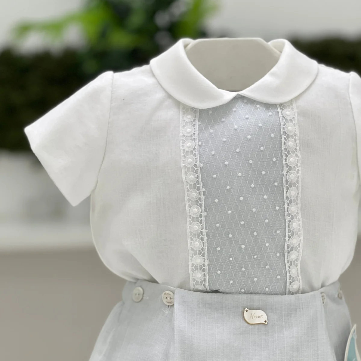 Abito elegante composto da camicia con balza frontale in plumetis e pizzo e pantaloncini coordinati. Una delicata nota di celeste, presente sui pantaloncini e sul davanti della camicia, dona un tocco di colore raffinato e armonioso all’insieme.