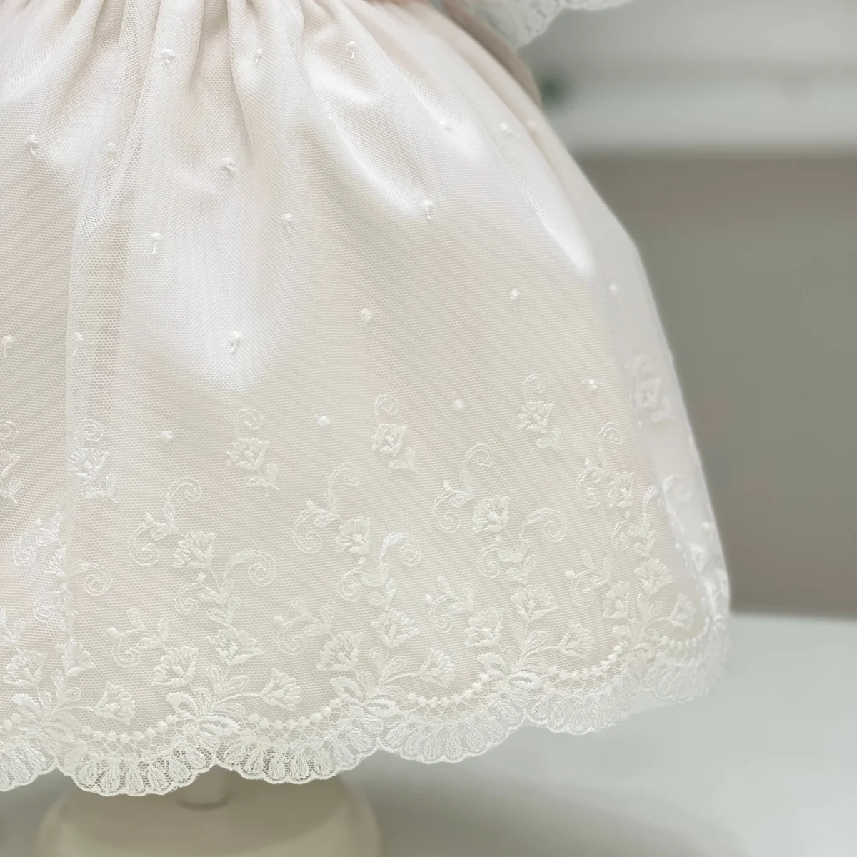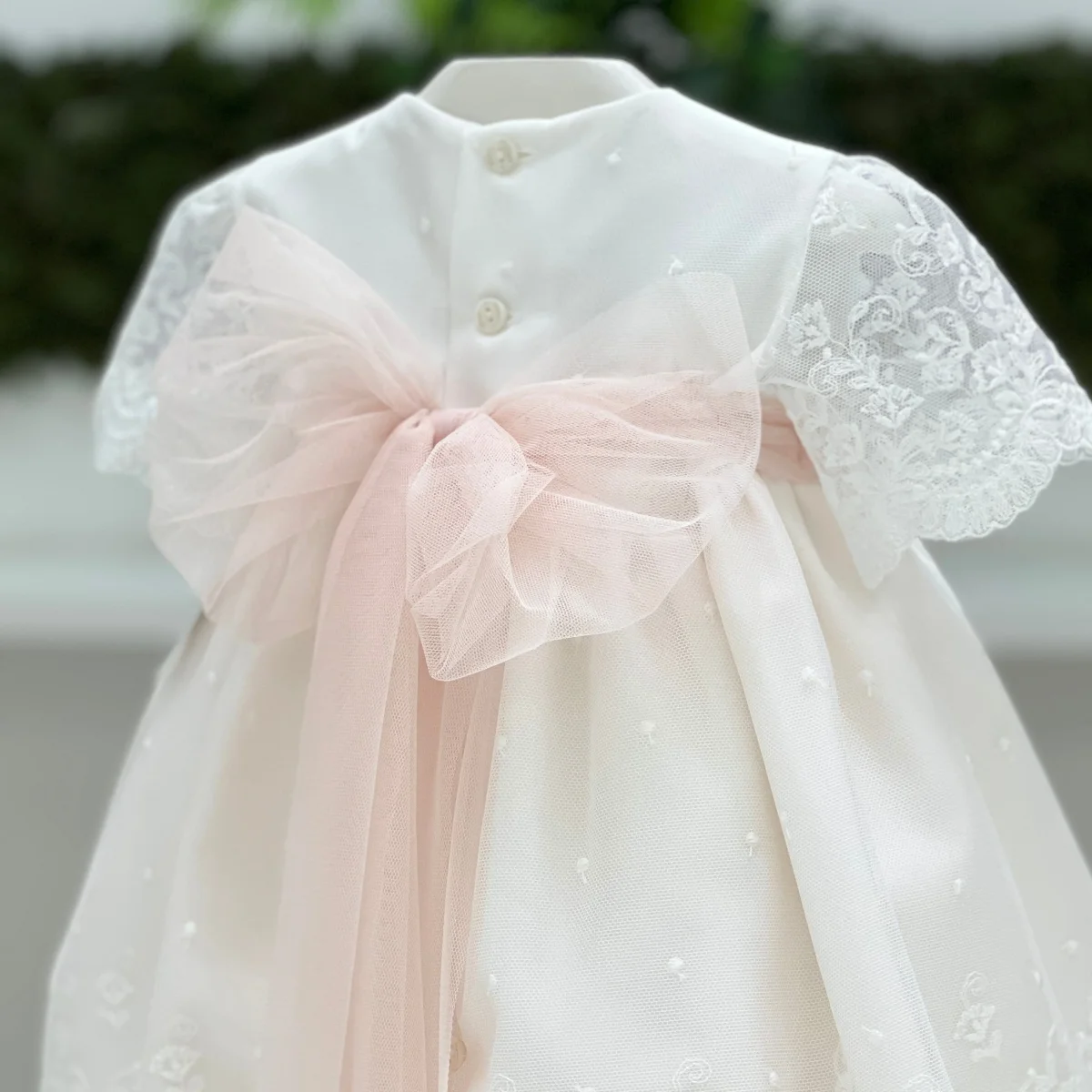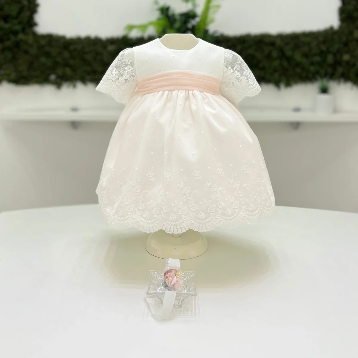 Abito elegante per neonata in tulle plumetis con smerlo in pizzo, caratterizzato da una gonna con fondo rosa pescato che si ritrova anche nella cintura in vita. La manica corta velata e la fascia con fiore coordinata completano il look con grazia e delicatezza.
