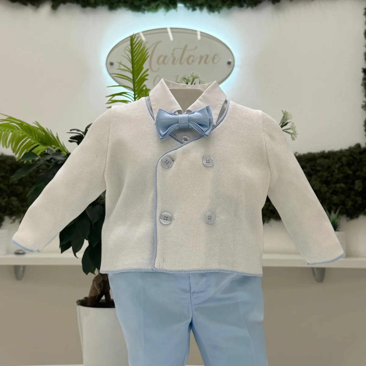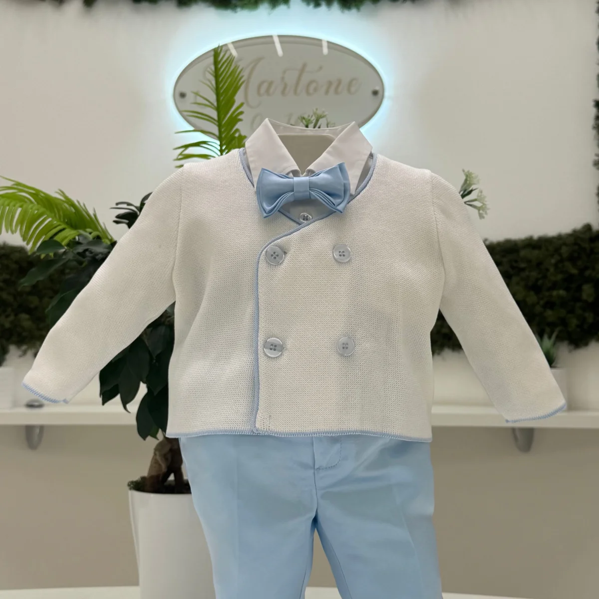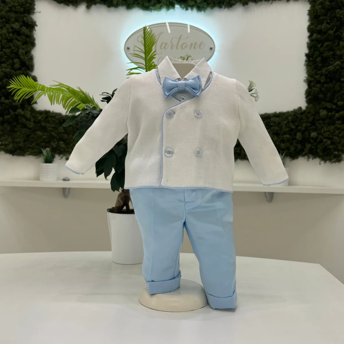 Il cardigan doppiopetto bianco, rifinito con bordi in celeste, dona un tocco di classe senza tempo. La camicia con body in misto lino assicura una vestibilità impeccabile, mentre il pantalone in raso, con risvolto, completa l’outfit con stile e ricercatezza. Perfetto per cerimonie ed eventi speciali, questo abito è sinonimo di eleganza sartoriale e attenzione ai dettagli.