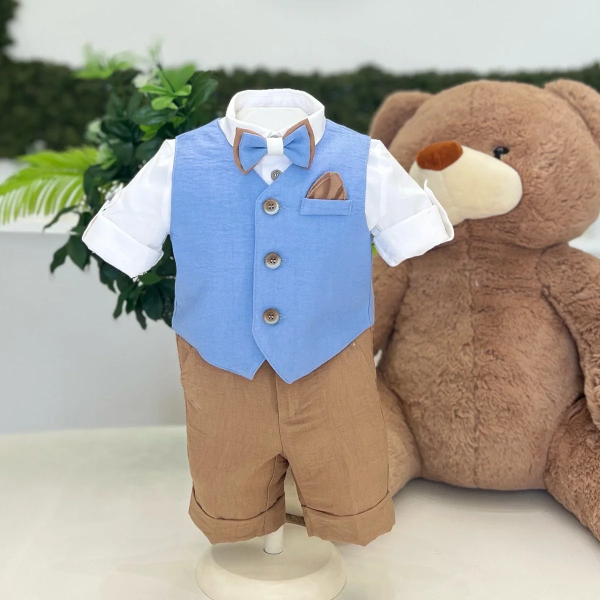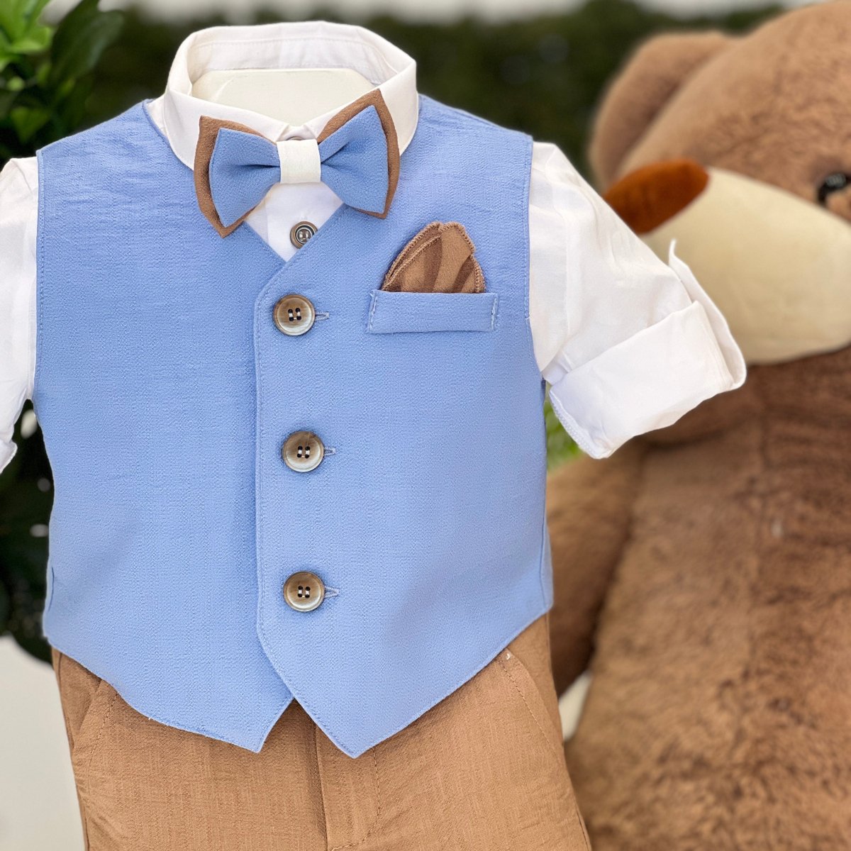 Completo elegante con gilet celeste in tessuto strutturato, camicia bianca con risvolti, bermuda marroni con risvolto e papillon coordinato. Rifinito con fazzoletto da taschino in tono, perfetto per uno stile ricercato e distintivo.