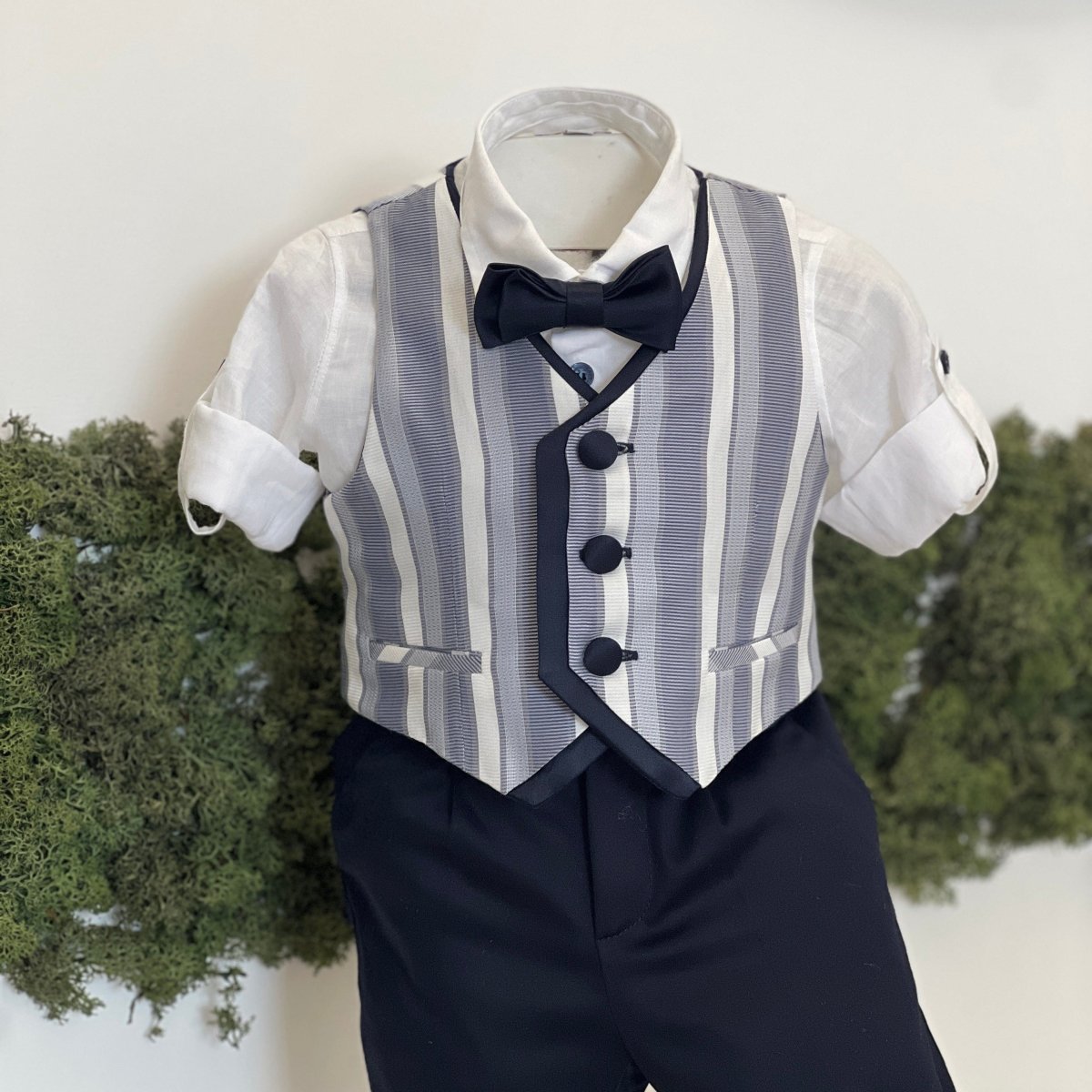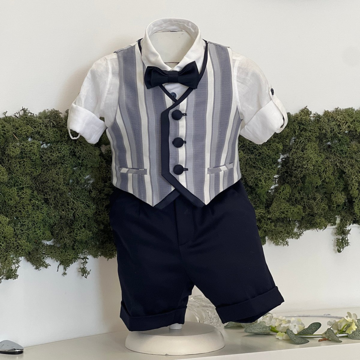 Completo battesimale elegante composto da camicia in lino bianca con maniche risvoltabili e bottoncini laterali, gilet a righe verticali con profili blu e bottoni rivestiti, bermuda blu con risvolto e papillon coordinato. Un abito curato nei dettagli, ideale per cerimonie e occasioni speciali.