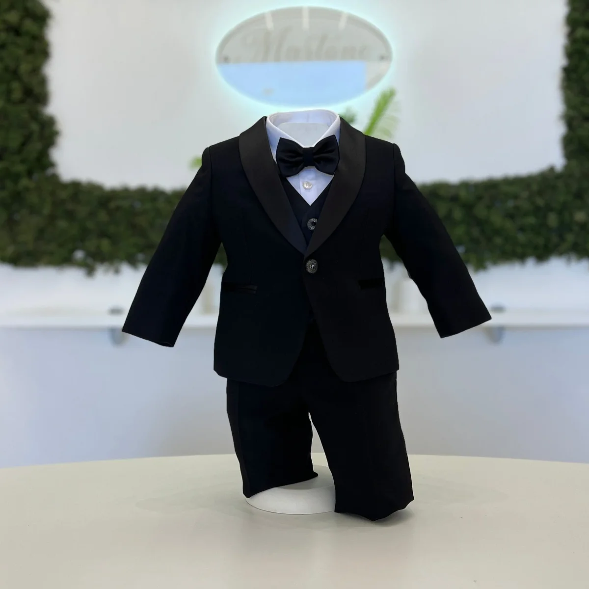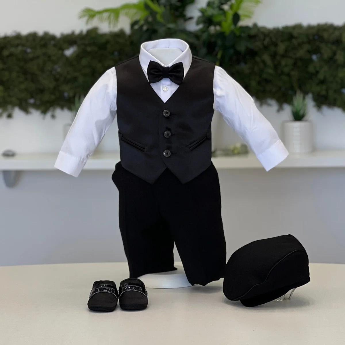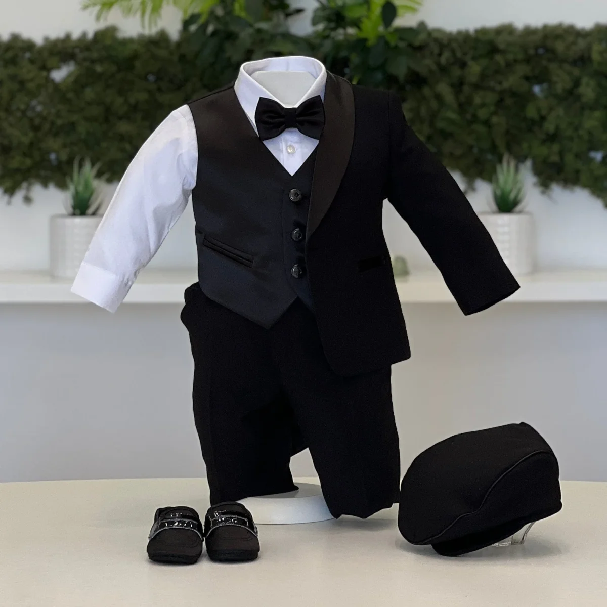 Completo battesimale artigianale con giacca dal revers satinato, impreziosito da eleganti bottoni gioiello. Il set comprende gilet coordinato, camicia bianca, pantalone classico, papillon, coppola e scarpine abbinate. Realizzabile anche su misura per una vestibilità perfetta ed esclusiva.