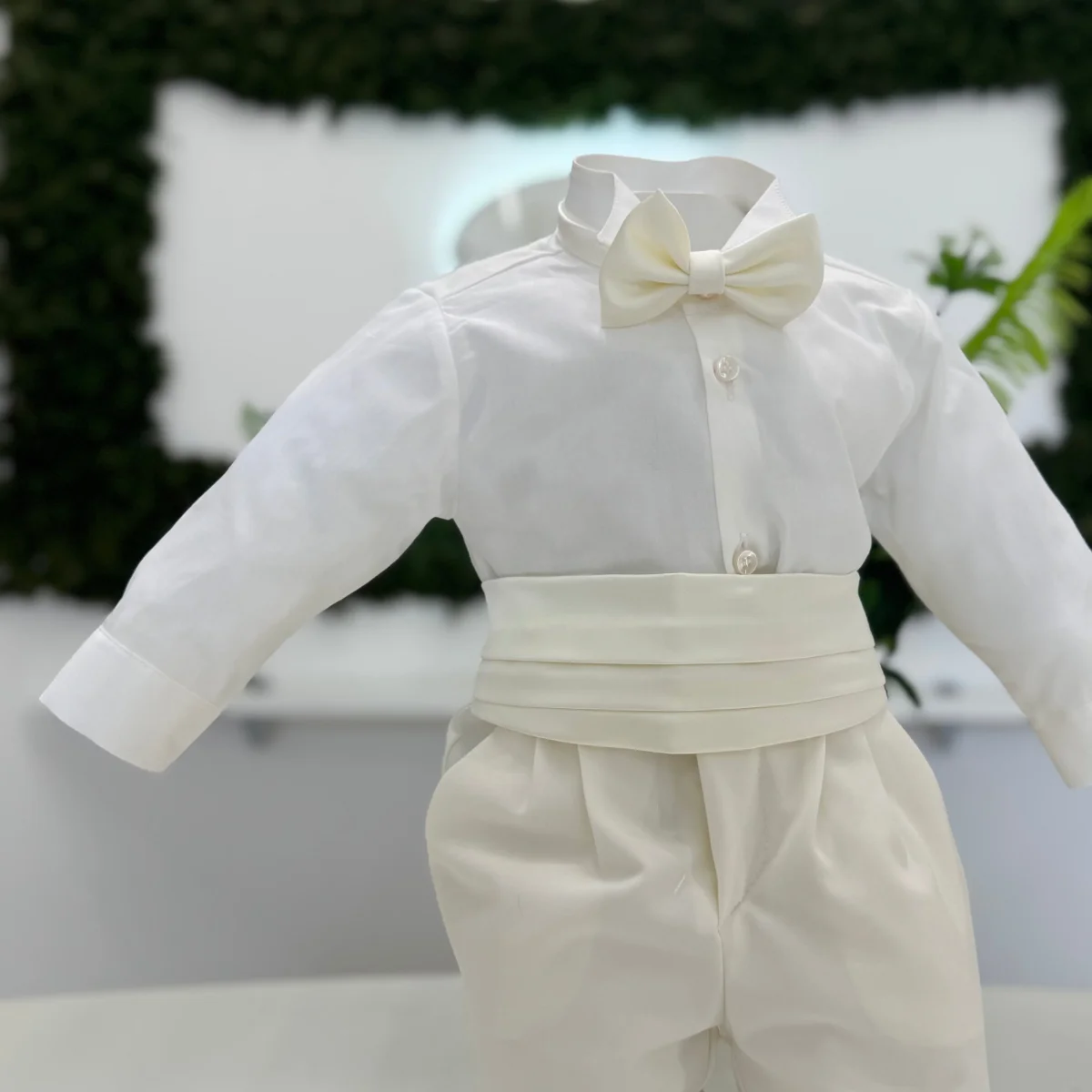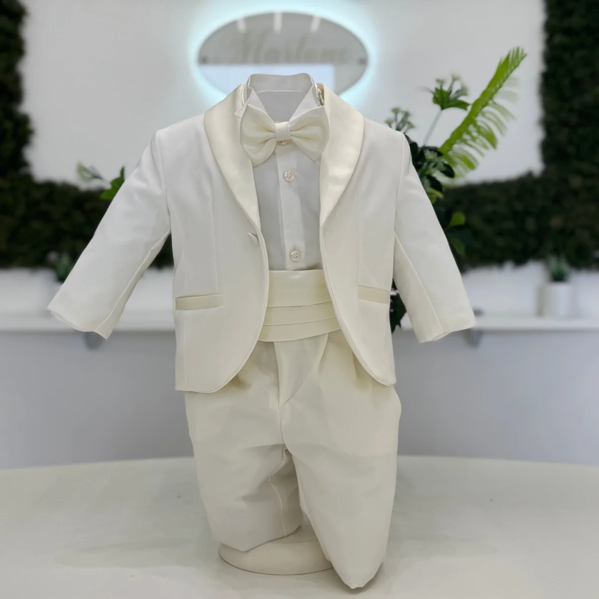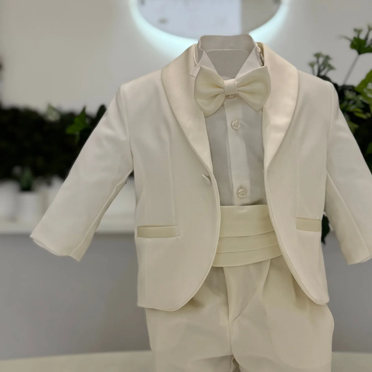 Smoking da battesimo in tonalità panna, composto da giacca monopetto con revers lucidi, pantalone con fusciacca plissettata e camicia in cotone. Papillon coordinato a completare l’ensemble. Un classico intramontabile, ideale per cerimonie dall’eleganza formale.