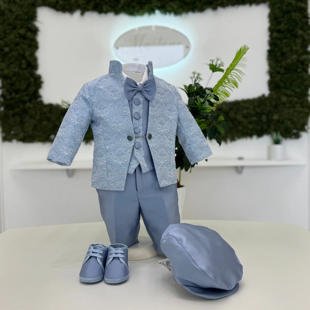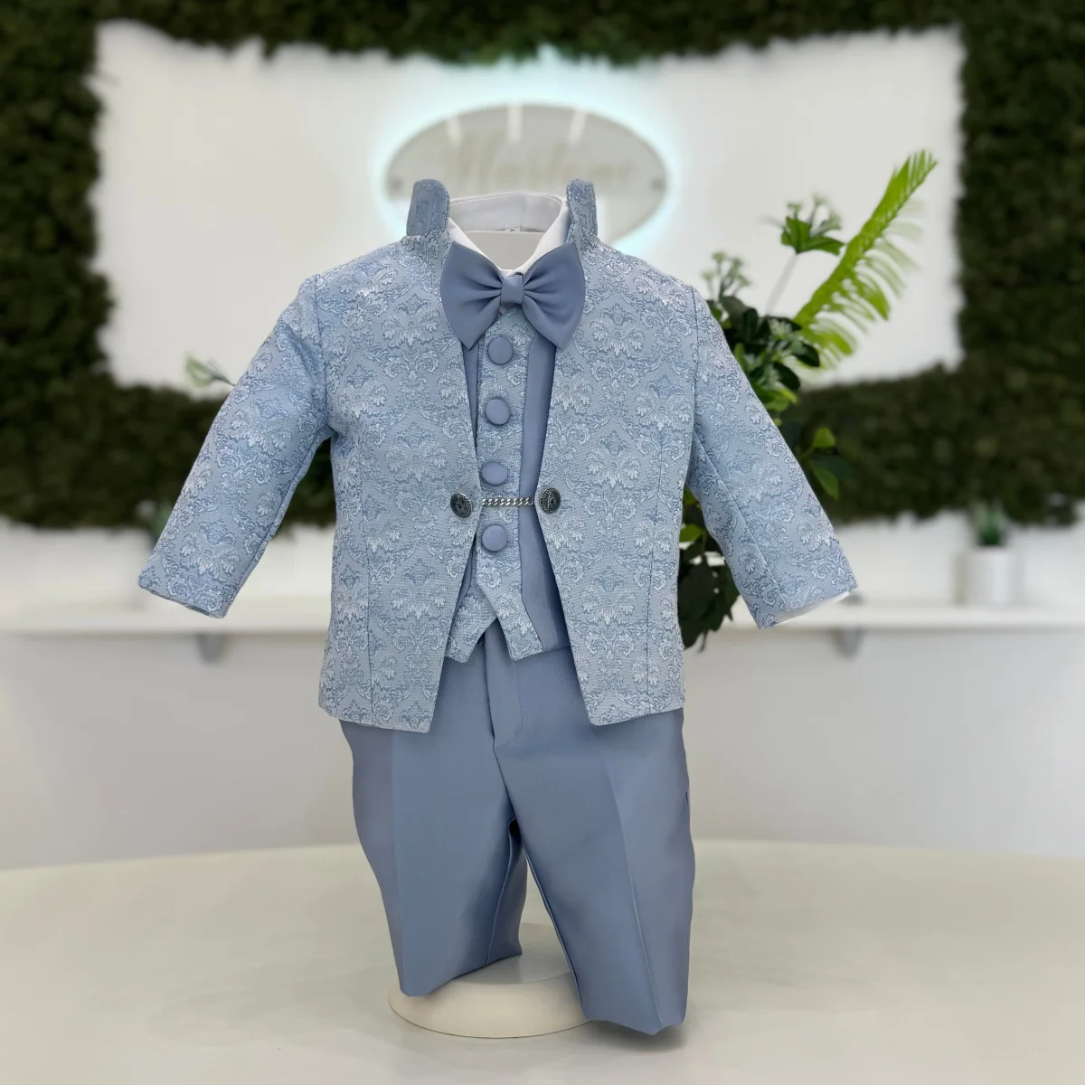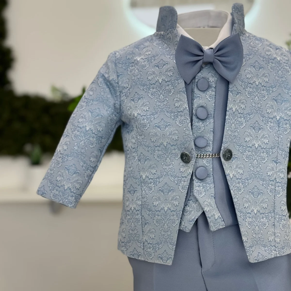 Completo da battesimo in tonalità azzurro, con giacca dal collo alla coreana in tessuto damascato a motivo jacquard. Gilet coordinato con bottoni rivestiti e catenella decorativa, papillon tono su tono e camicia bianca in cotone. Pantalone liscio a completare un insieme elegante e raffinato, ideale per cerimonie dal gusto classico.