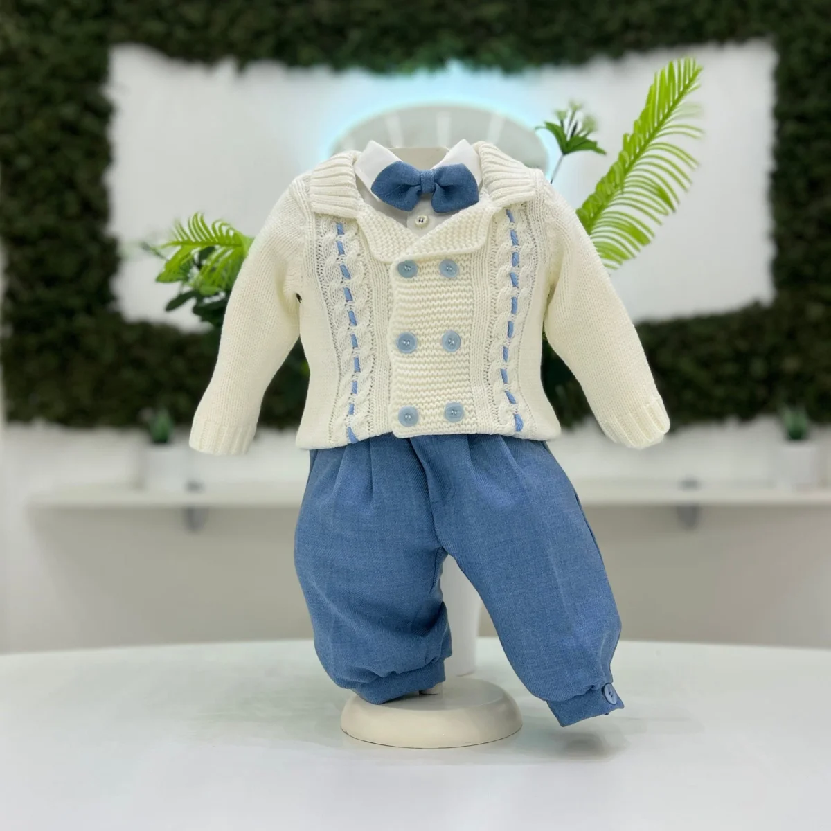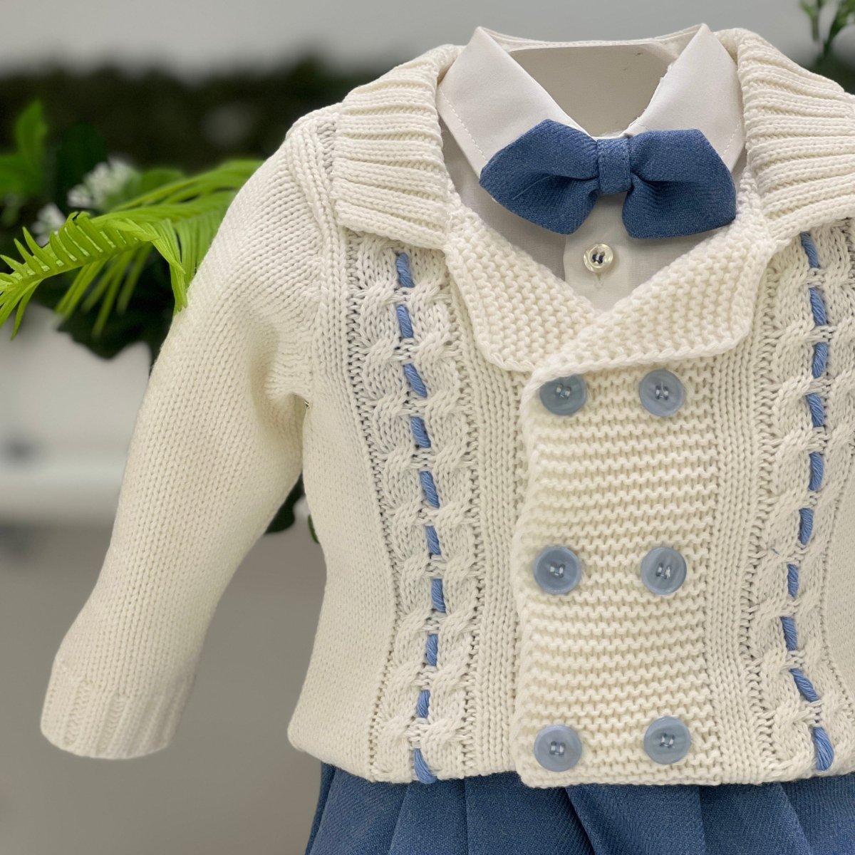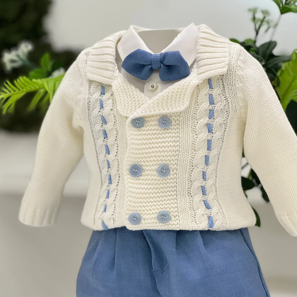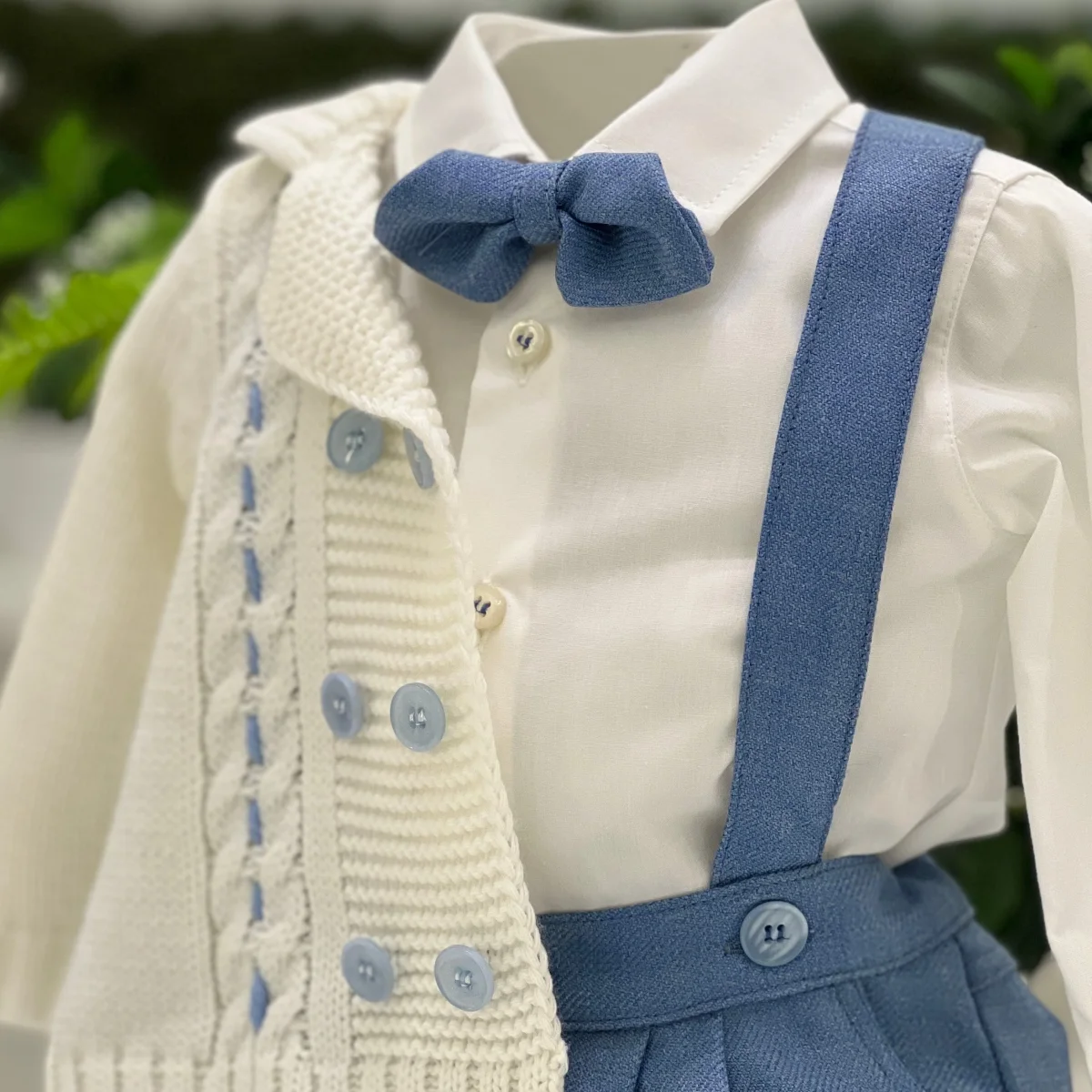 Completo elegante per neonato composto da camicia bianca in tessuto leggero con papillon coordinato, pantalone celeste alla zuava con bretelle e cardigan panna in maglia a doppiopetto con lavorazione intrecciata e dettagli in contrasto. Un outfit raffinato e confortevole, curato nei particolari e ideale per il battesimo e le cerimonie speciali.