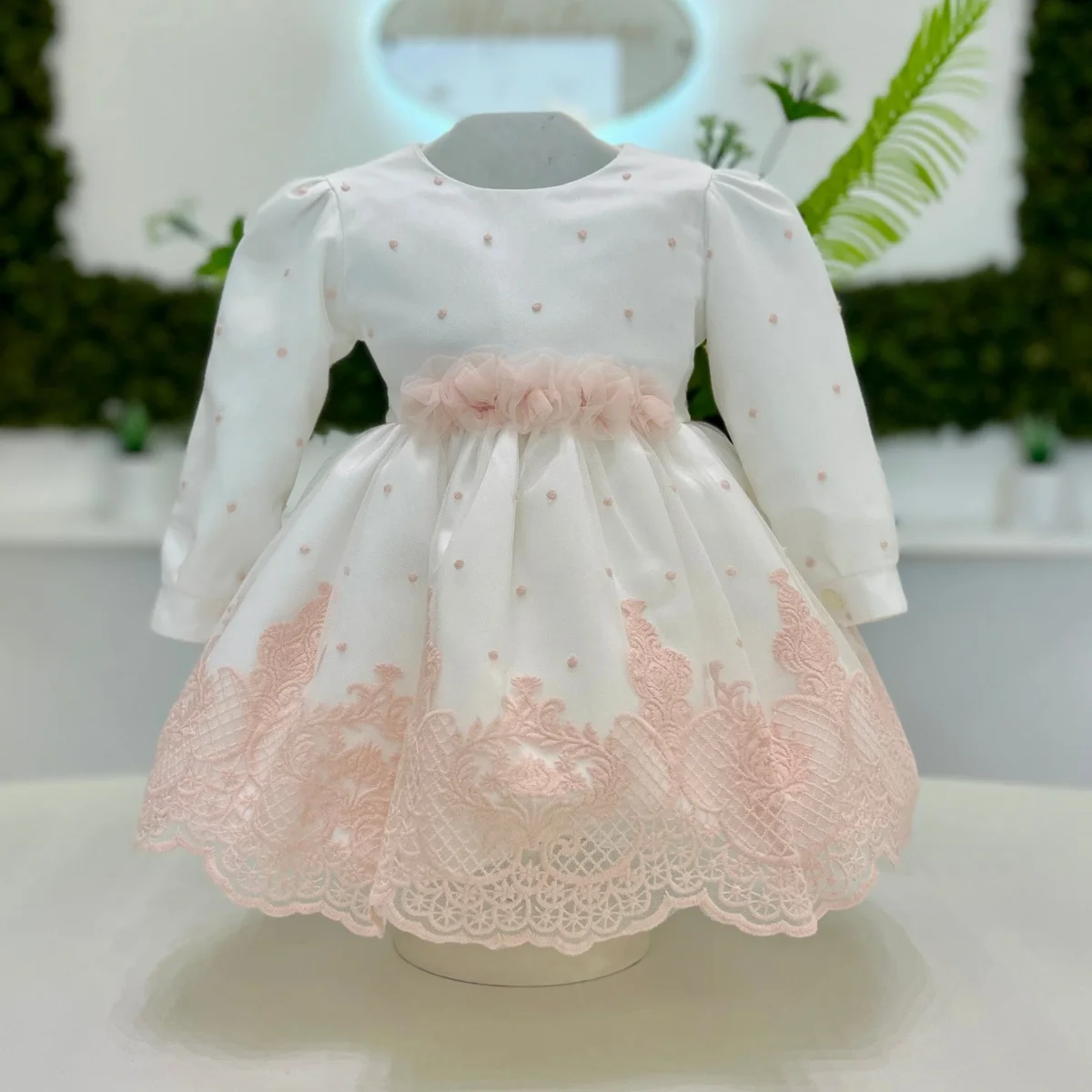 Abito a maniche lunghe in tessuto bianco con delicati ricami a pois tono su tono sul corpino. La vita è impreziosita da una cintura in tulle con applicazioni floreali, mentre la gonna presenta un raffinato ricamo rosa con bordo smerlato. Sul retro, un romantico fiocco in tulle completa il design. Un capo elegante e raffinato, ideale per battesimi e cerimonie speciali.