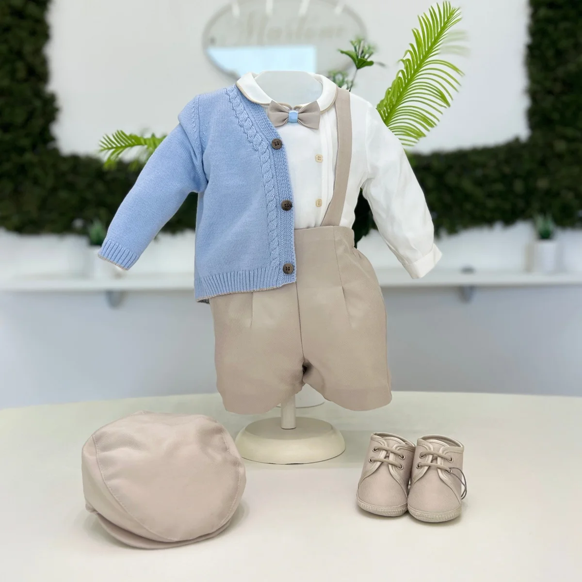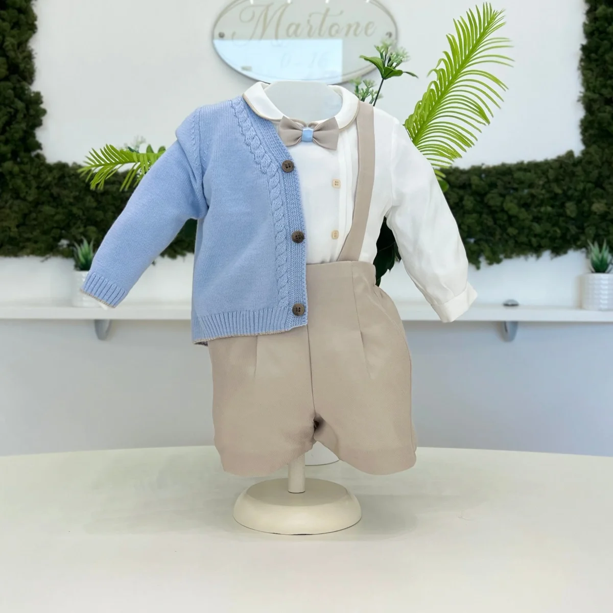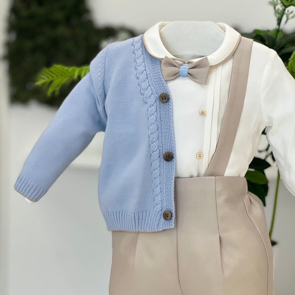 Completo battesimale per bambino composto da camicia bianca in cotone con profilo sul colletto e papillon coordinato nei toni beige e celeste. Pantaloncini beige con bretelle in tessuto abbinato. Cardigan in maglia celeste con lavorazione a treccia sul davanti e bottoni in contrasto. Un insieme elegante e curato nei dettagli, perfetto per il giorno del battesimo e le cerimonie più speciali.