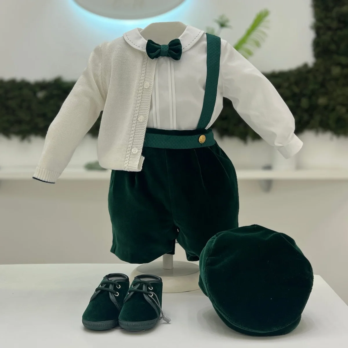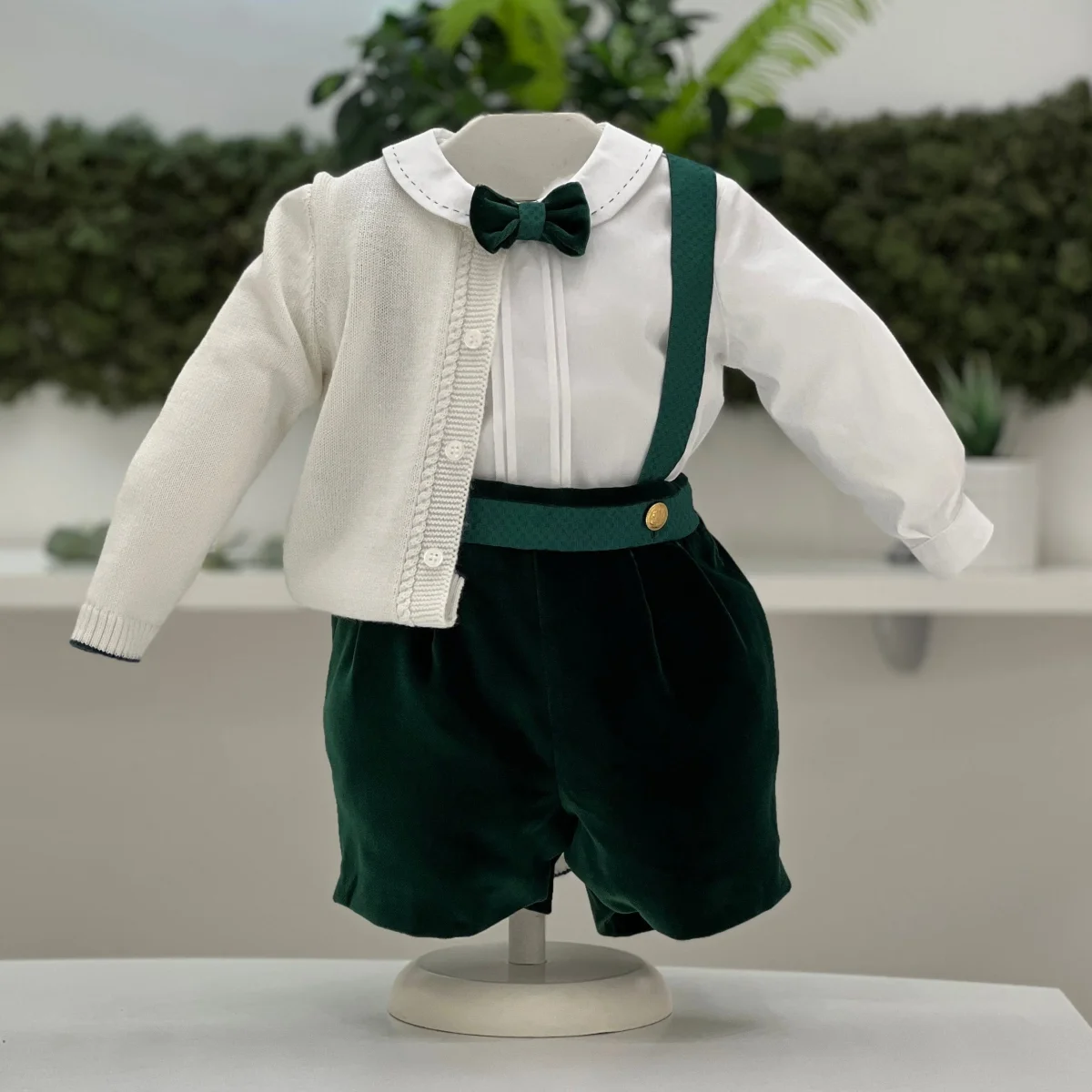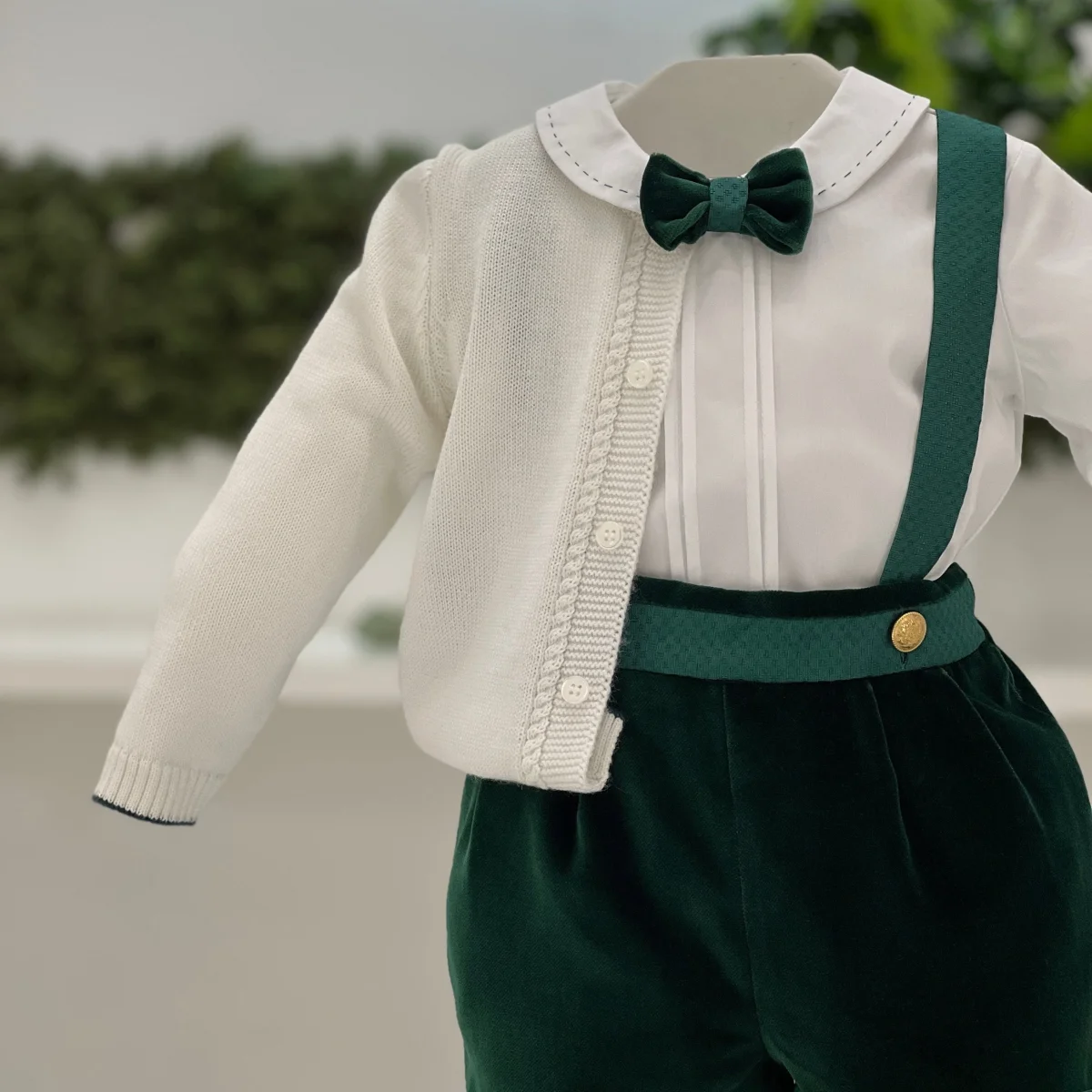 Completo battesimale elegante per bambino composto da camicia bianca in cotone con colletto ricamato a contrasto e papillon in velluto verde bottiglia coordinato. Pantaloncini in velluto verde con bretelle a trama jacquard e bottoni dorati. A completare l’outfit, cardigan in maglia bianca con bordo rifinito e dettagli tono su tono. Un abito raffinato e curato nei particolari, perfetto per il giorno del battesimo e le occasioni più speciali.