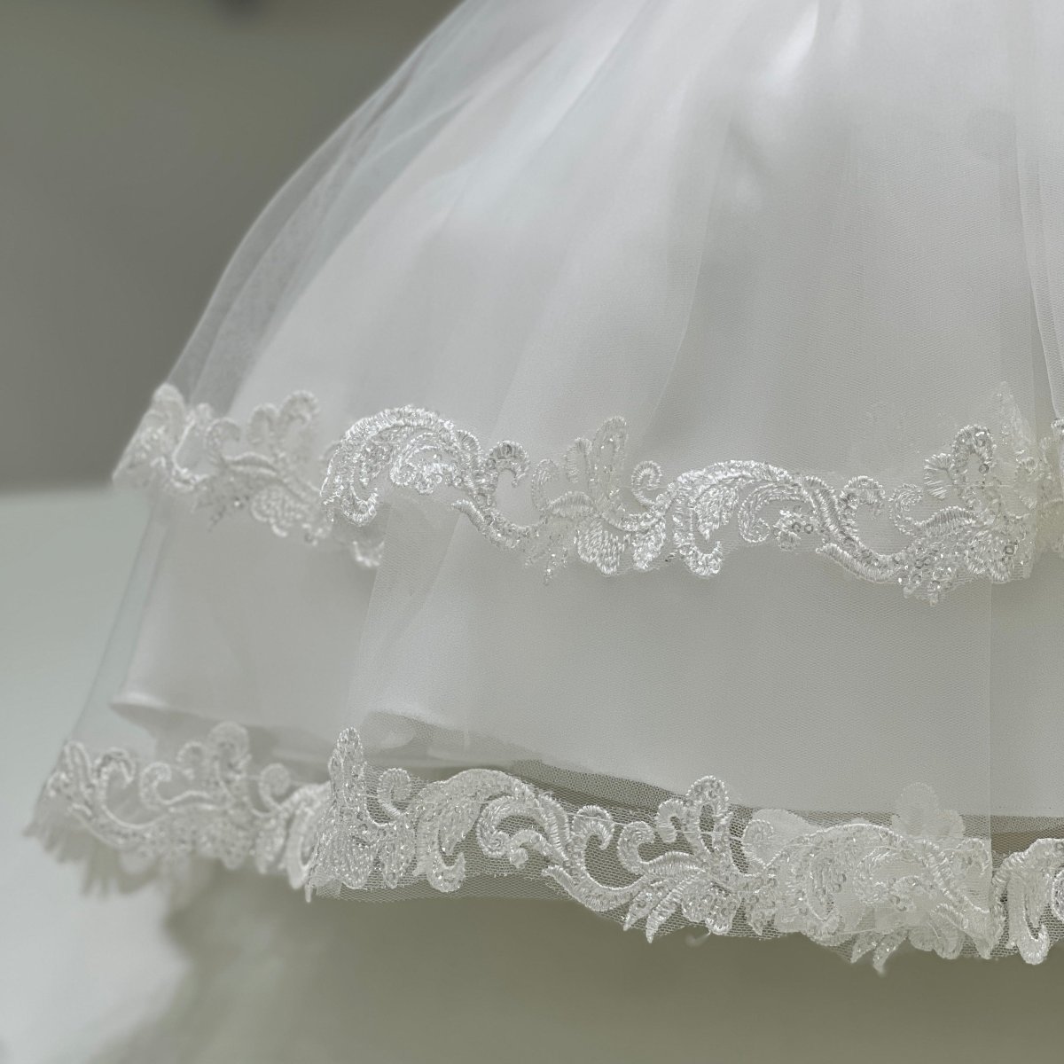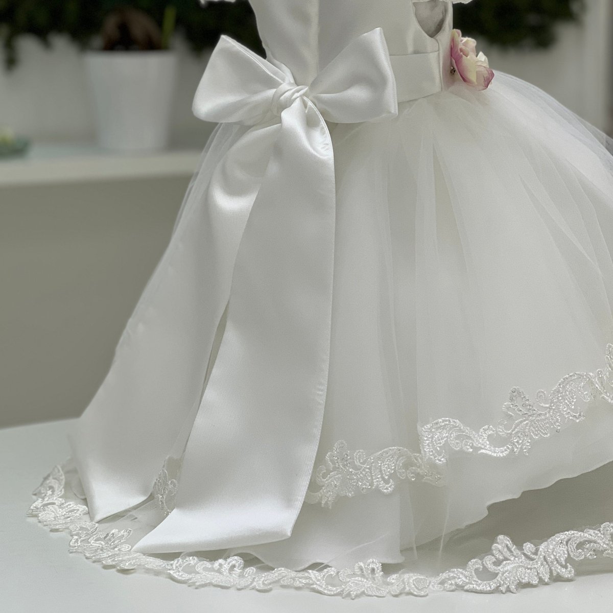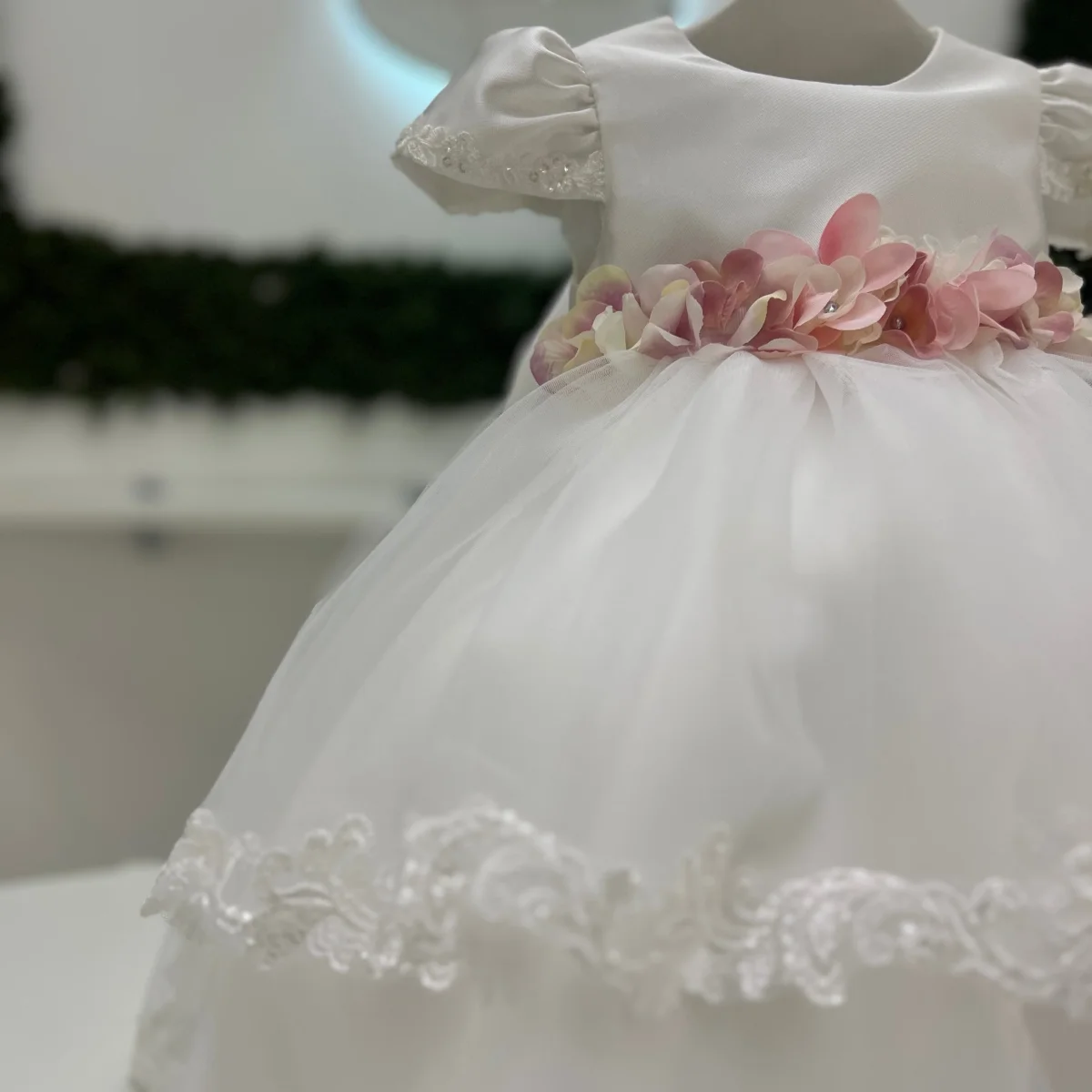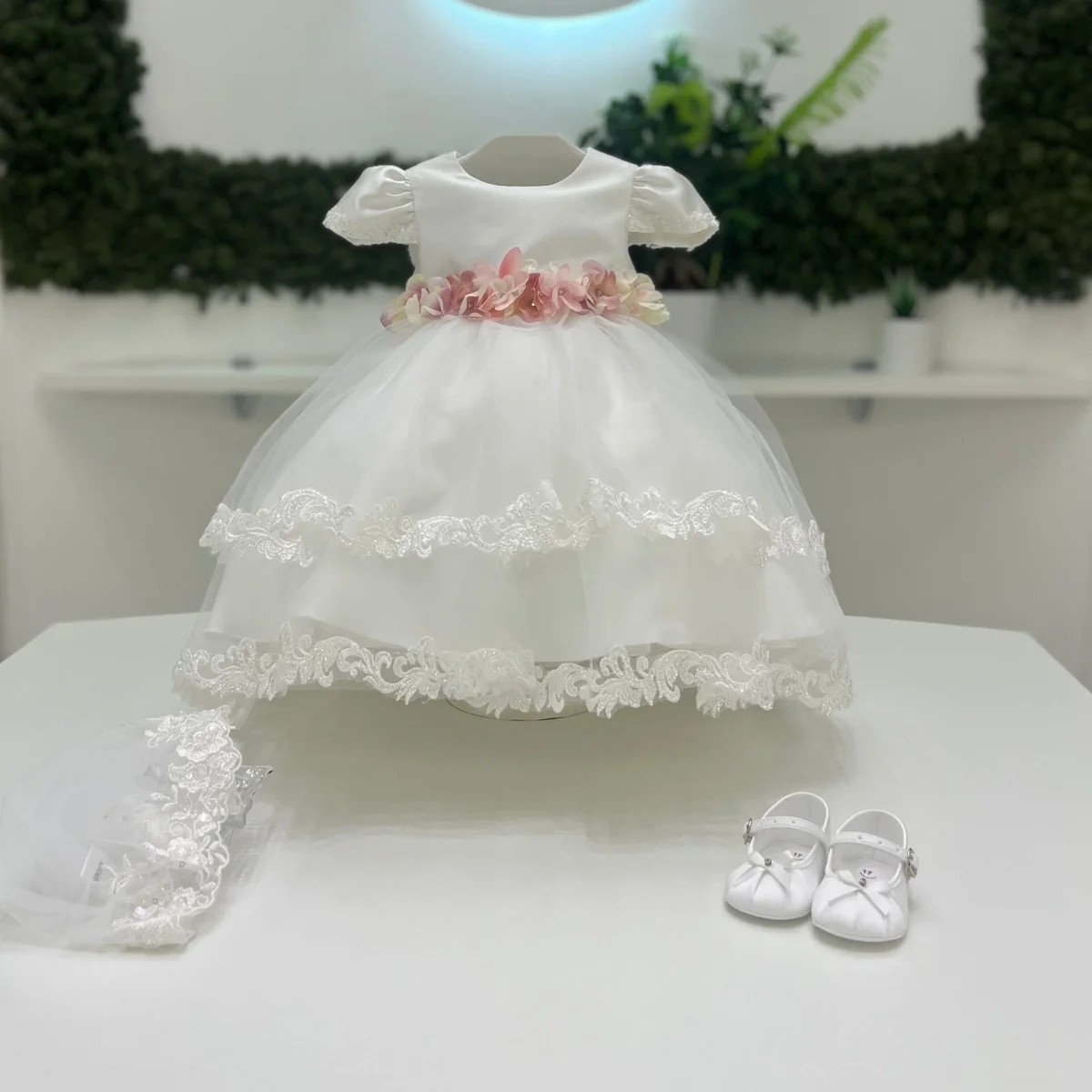 Abito da cerimonia per neonata in mikado e tulle, caratterizzato da maniche a sbuffo rifinite con dettagli ricamati e gonna a balze arricchita da bordature in pizzo. La vita è impreziosita da una cintura floreale con applicazioni in tonalità rosa, che dona un delicato contrasto romantico. Completa il coordinato un fiocco posteriore, velo con bordo in pizzo e scarpette abbinate.