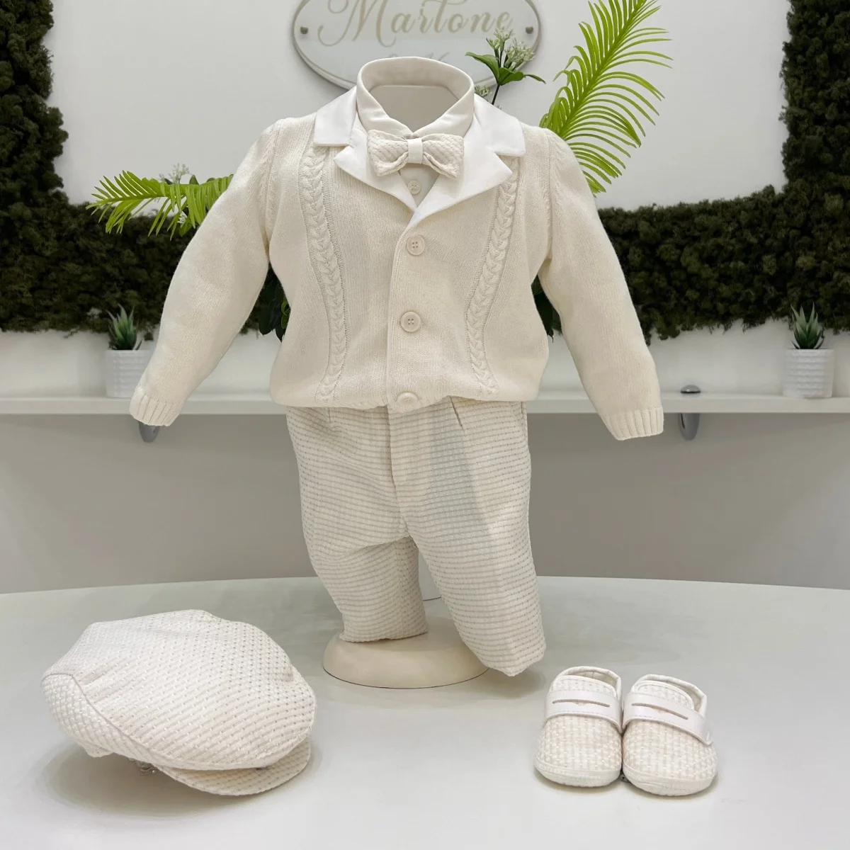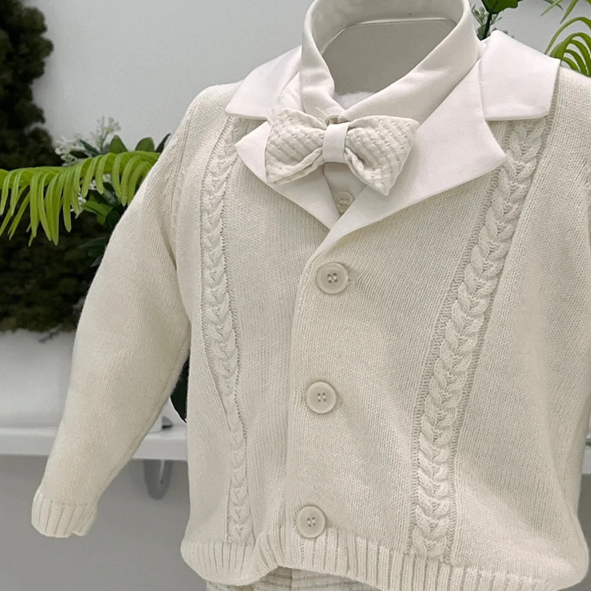 Abito da battesimo per bambino composto da giacca in maglia panna con lavorazione trecce e bottoni frontali, camicia con collo classico e pantalone in tessuto operato tono su tono. Un completo elegante e confortevole, ideale per cerimonie e occasioni speciali.