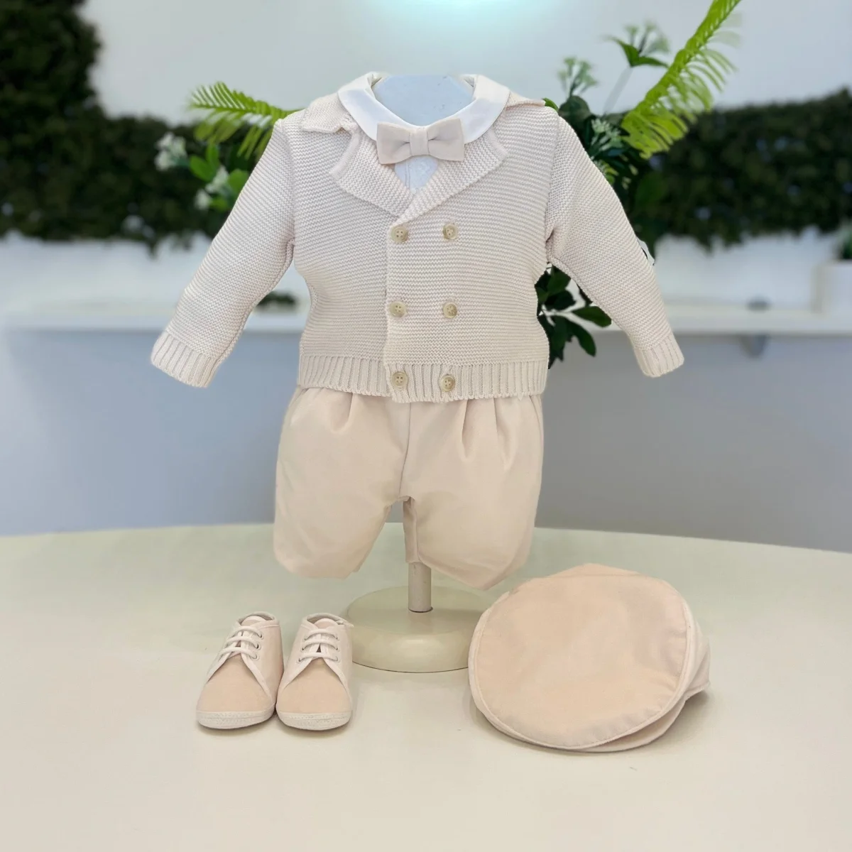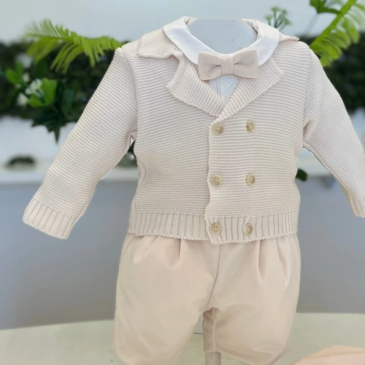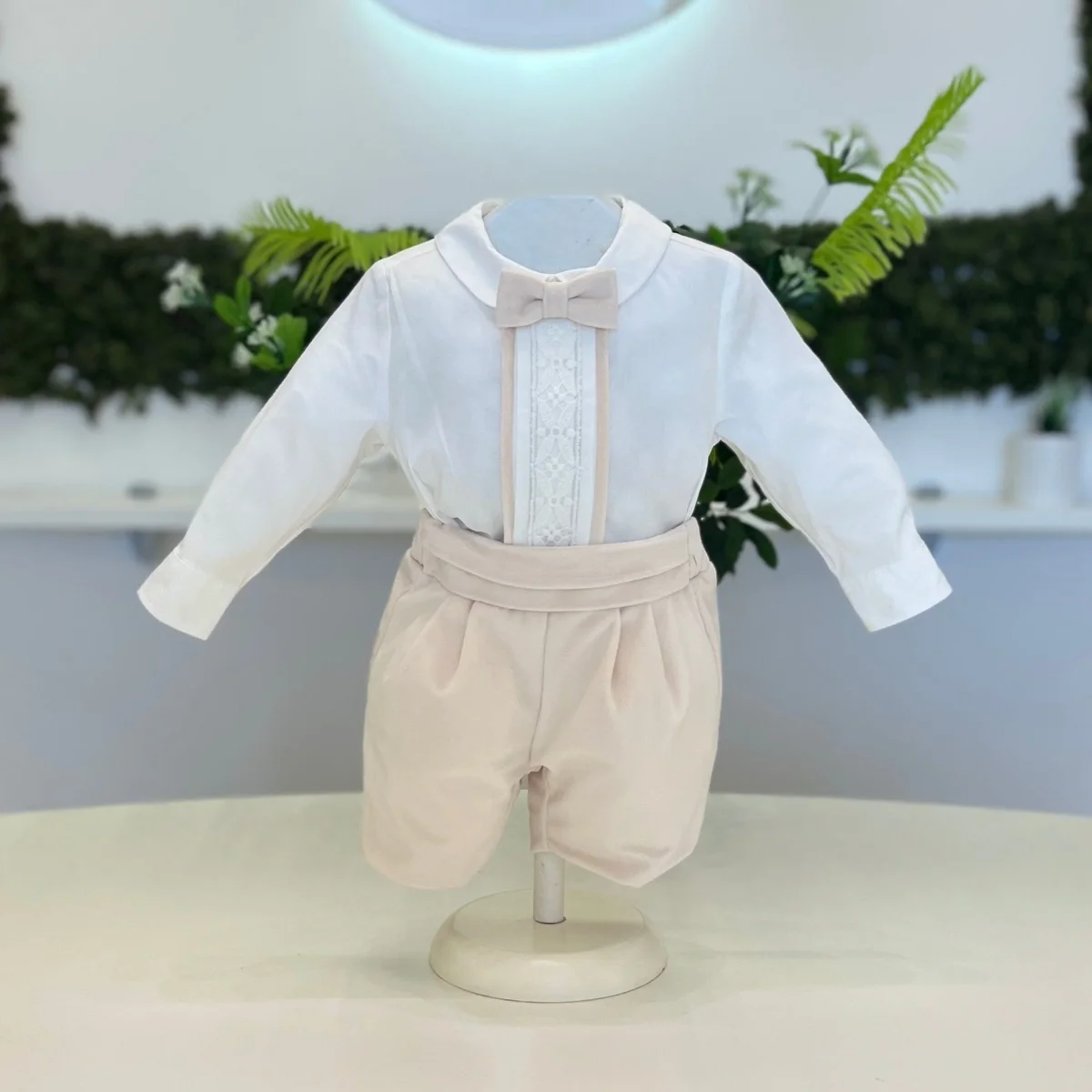 Completo elegante da bimbo composto da camicia in cotone con papillon e inserto frontale in tono azzurro, bermuda in shantung con bretelle e cardigan in maglia con lavorazione a trecce. La combinazione nei toni del bianco e dell’azzurro conferisce uno stile raffinato e luminoso, perfetto per cerimonie, battesimi e occasioni speciali.