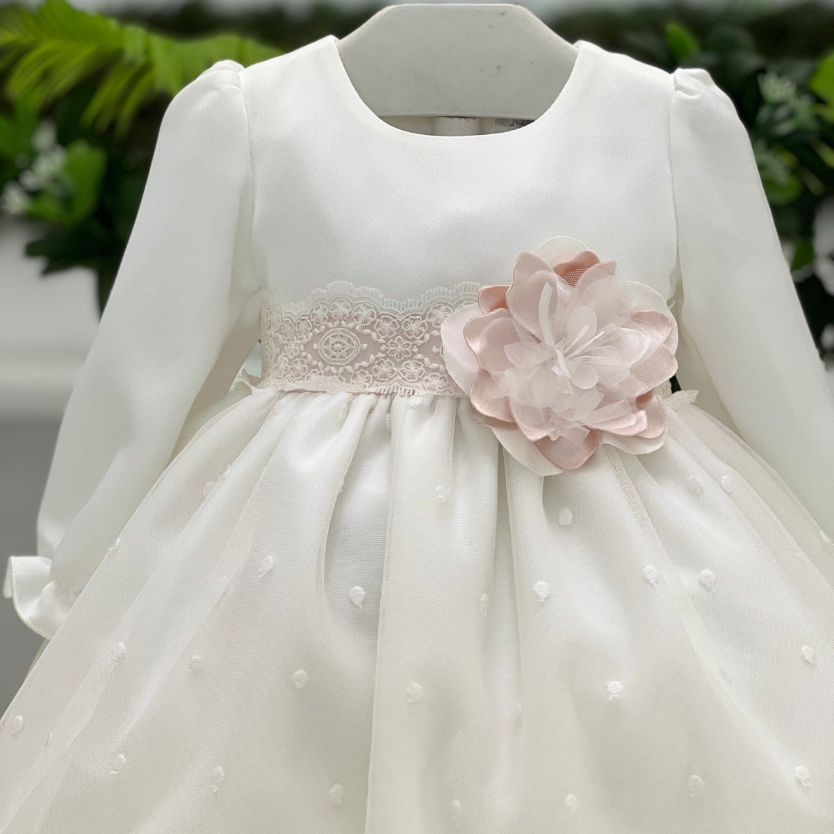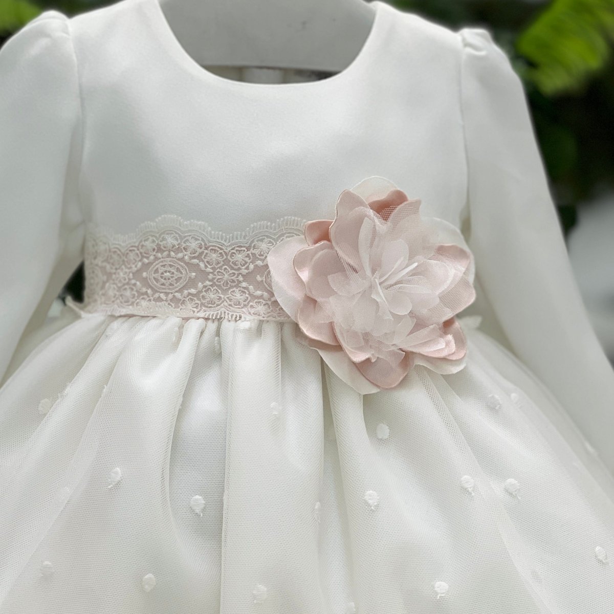 Abito da cerimonia per neonata in organza ricamata, con maniche lunghe e corpino in tessuto satinato. La gonna, impreziosita da piccoli pois in rilievo e bordo in pizzo, dona movimento e leggerezza. In vita, una cintura in pizzo lavorato si completa con una maxi applicazione floreale in organza rosa cipria. Coordinato con fascia abbinata, è l’interpretazione perfetta dell’eleganza romantica — raffinato, impeccabile, assolutamente indimenticabile.