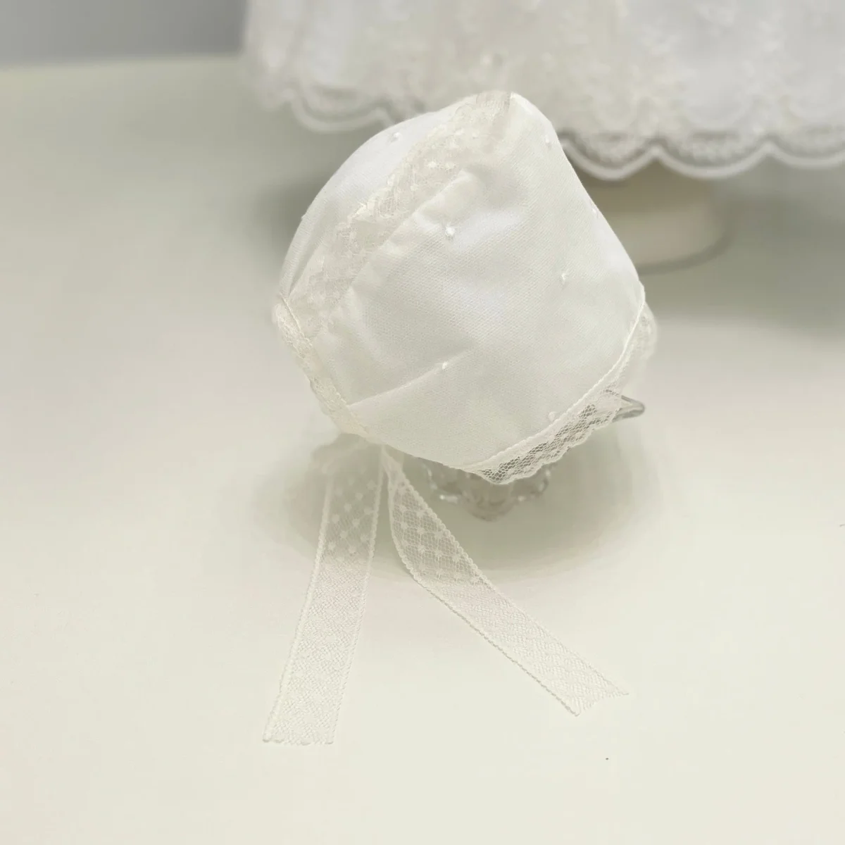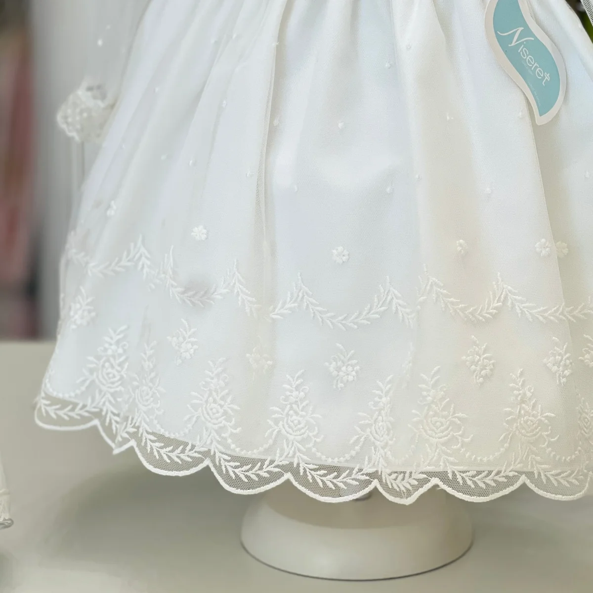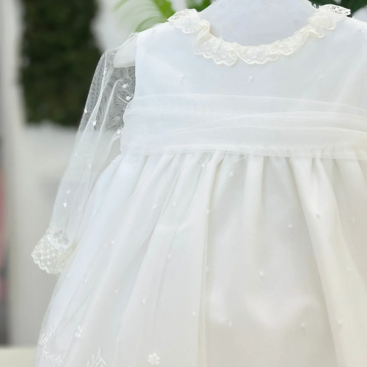 Abito battesimale in organza e seta ricamata a pois, caratterizzato da corpino leggero con maniche in tulle trasparente e polsini rifiniti in pizzo. La gonna ampia cade morbida con orlo ricamato a motivo floreale e bordo smerlato. Il collo è impreziosito da una delicata passamaneria tono su tono. Completano il completo la cuffietta coordinata, con profilo in pizzo e nastri in tulle. Un ensemble di pura eleganza, pensato per un battesimo dall’allure eterea e impeccabile.