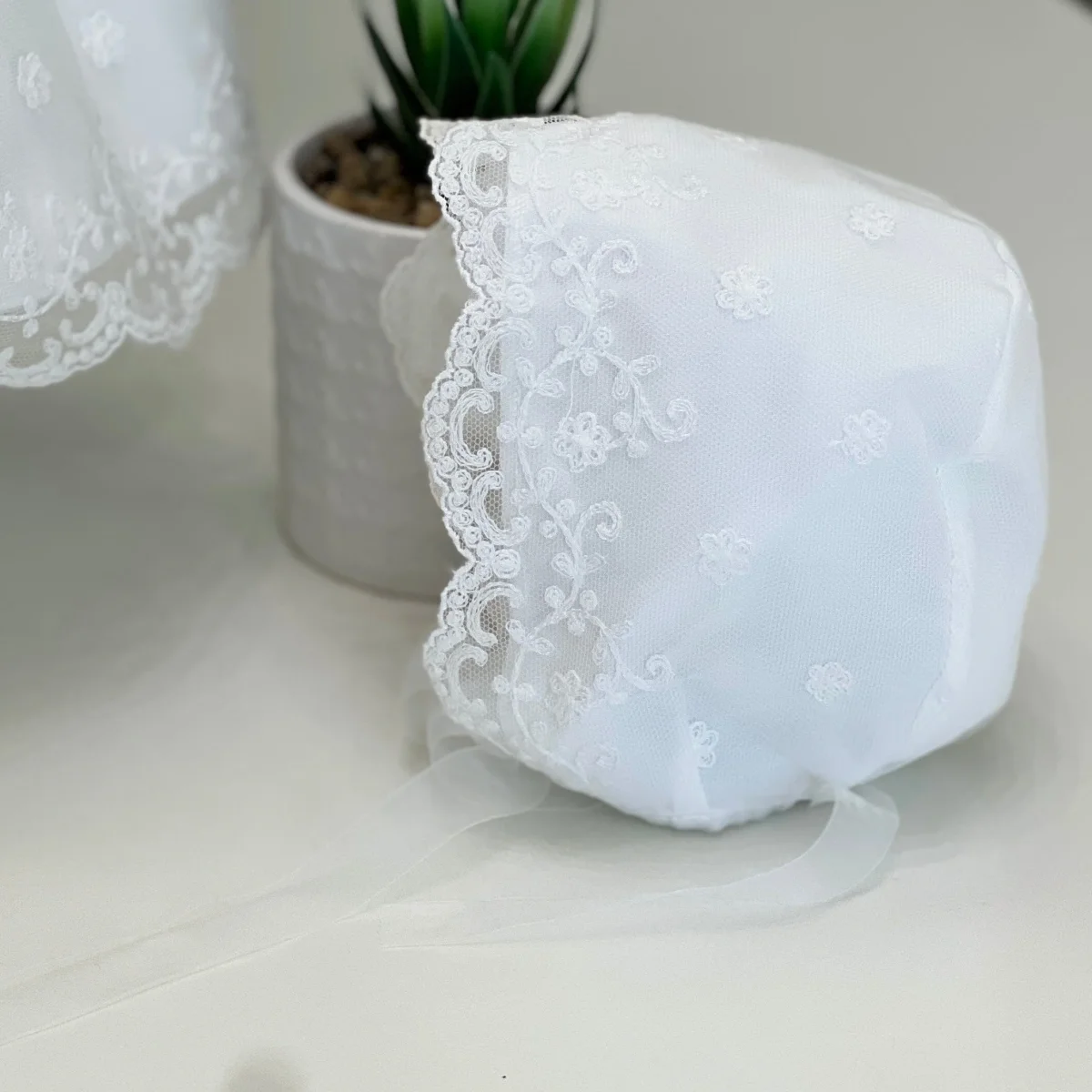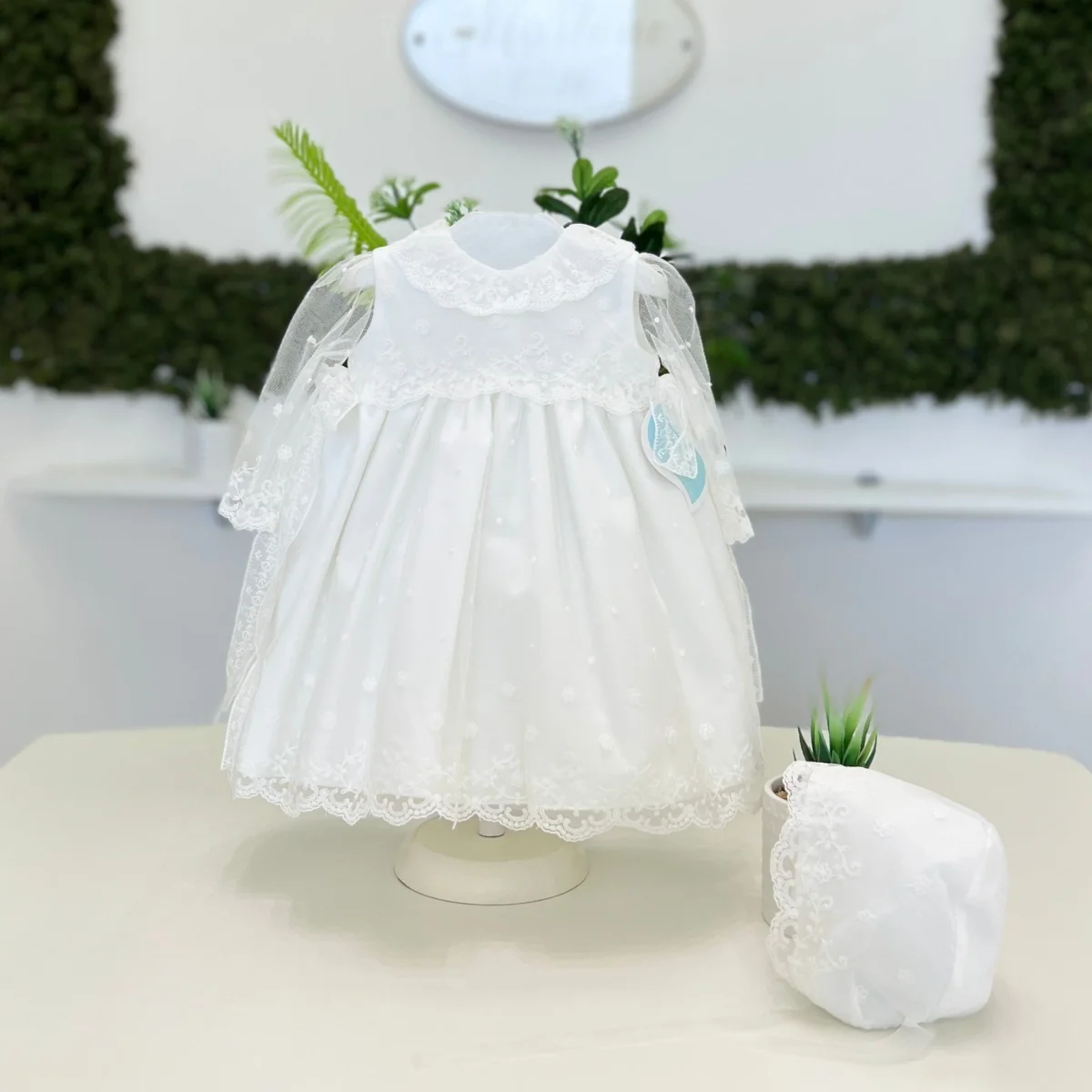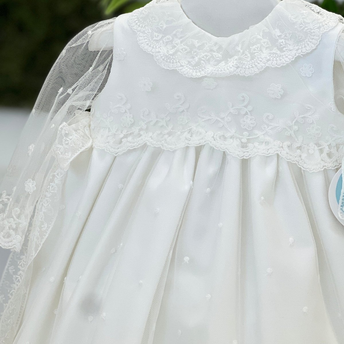 Abito battesimale in organza e seta con ricami floreali in rilievo, impreziosito da corpino ricamato e maniche in tulle trasparente che donano leggerezza alla silhouette. La gonna vaporosa è decorata da micro pois e rifinita con un orlo smerlato in pizzo. Il colletto rotondo ricamato aggiunge un tocco di grazia senza tempo. Completano il completo la cuffietta coordinata con bordo ricamato e nastri in tulle. Un capo iconico, pensato per un battesimo dall’eleganza eterea e impeccabile.
