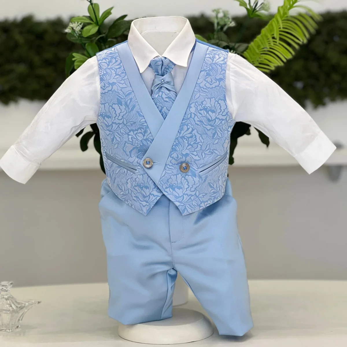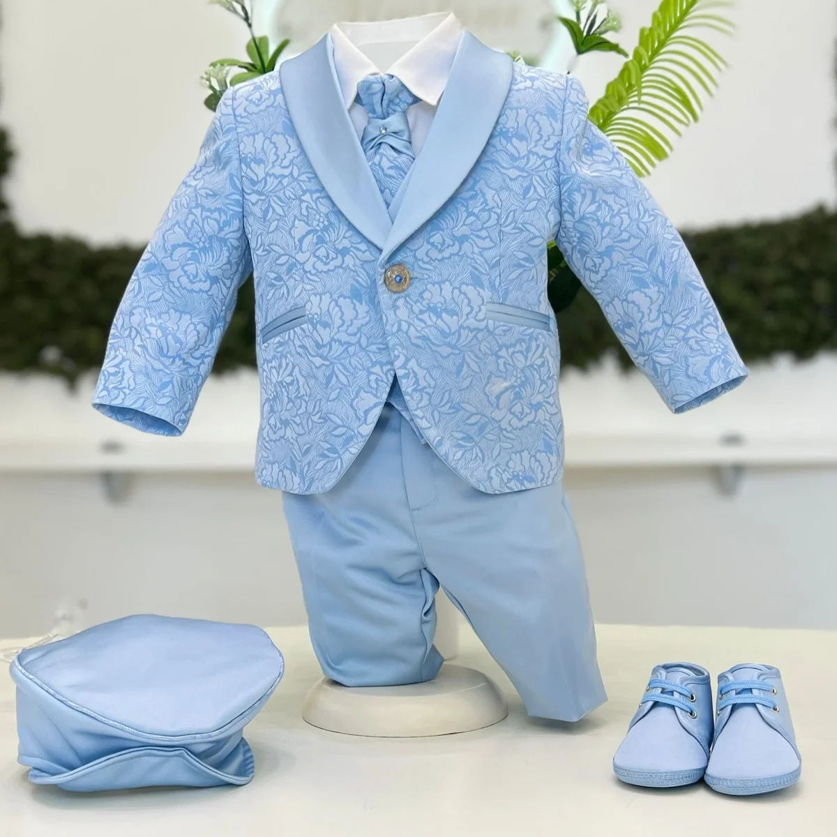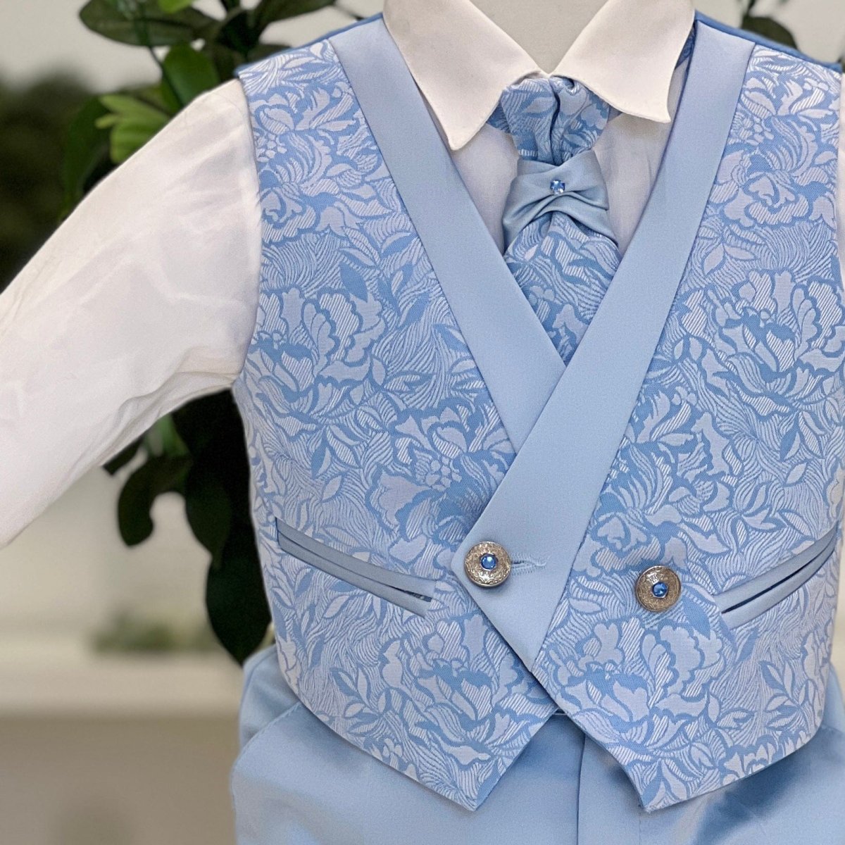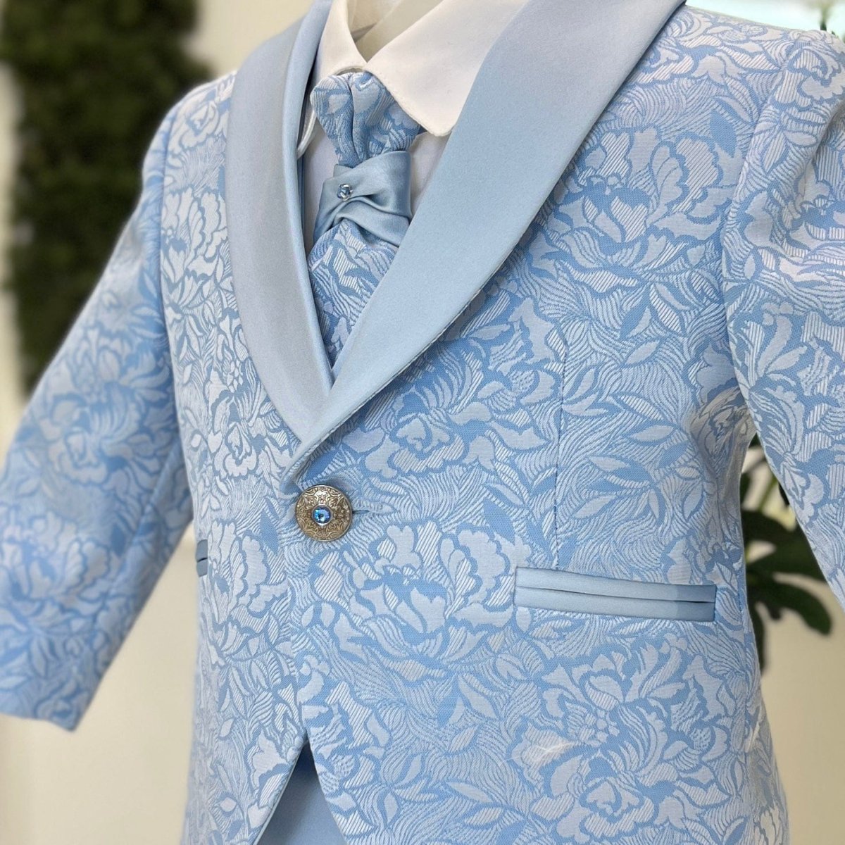 Abito sartoriale da cerimonia realizzato con estrema cura dei dettagli. Giacca monopetto in tessuto jacquard azzurro con raffinato motivo floreale, collo sciallato in tono liscio a contrasto, tasche a filetto rifinite e chiusura con bottone gioiello. Camicia bianca dal taglio pulito abbinata a gilet coordinato doppiopetto, impreziosito da bottoni decorativi e profili in tinta. Pantalone lungo azzurro dalla linea elegante e ben strutturata. Completa l’insieme la cravatta sartoriale coordinata, per un risultato armonioso e di grande impatto, pensato per le occasioni più importanti come il battesimo e le cerimonie di prestigio.