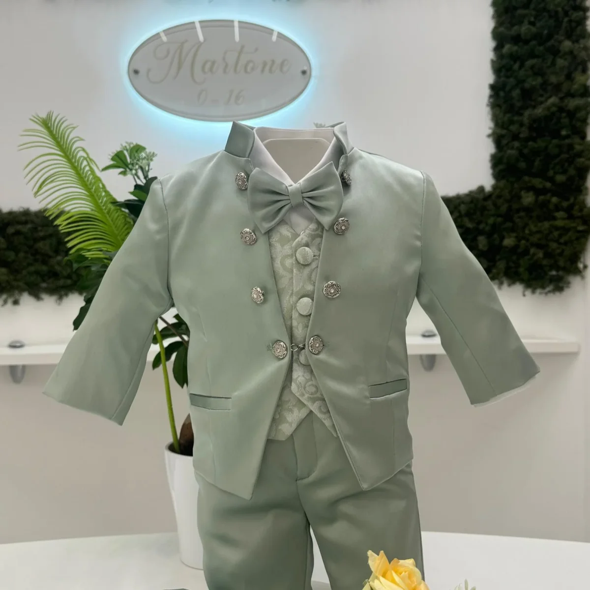 Completo da battesimo bimbo in elegante verde salvia, composto da giacca coreana con bottoni gioiello, gilet jacquard coordinato, camicia bianca, pantalone abbinato, papillon e coppola coordinata. Un insieme dal gusto sartoriale e ricercato, ideale per il battesimo e per cerimonie speciali, dove ogni dettaglio è pensato per un’eleganza impeccabile fin dal primo giorno importante.