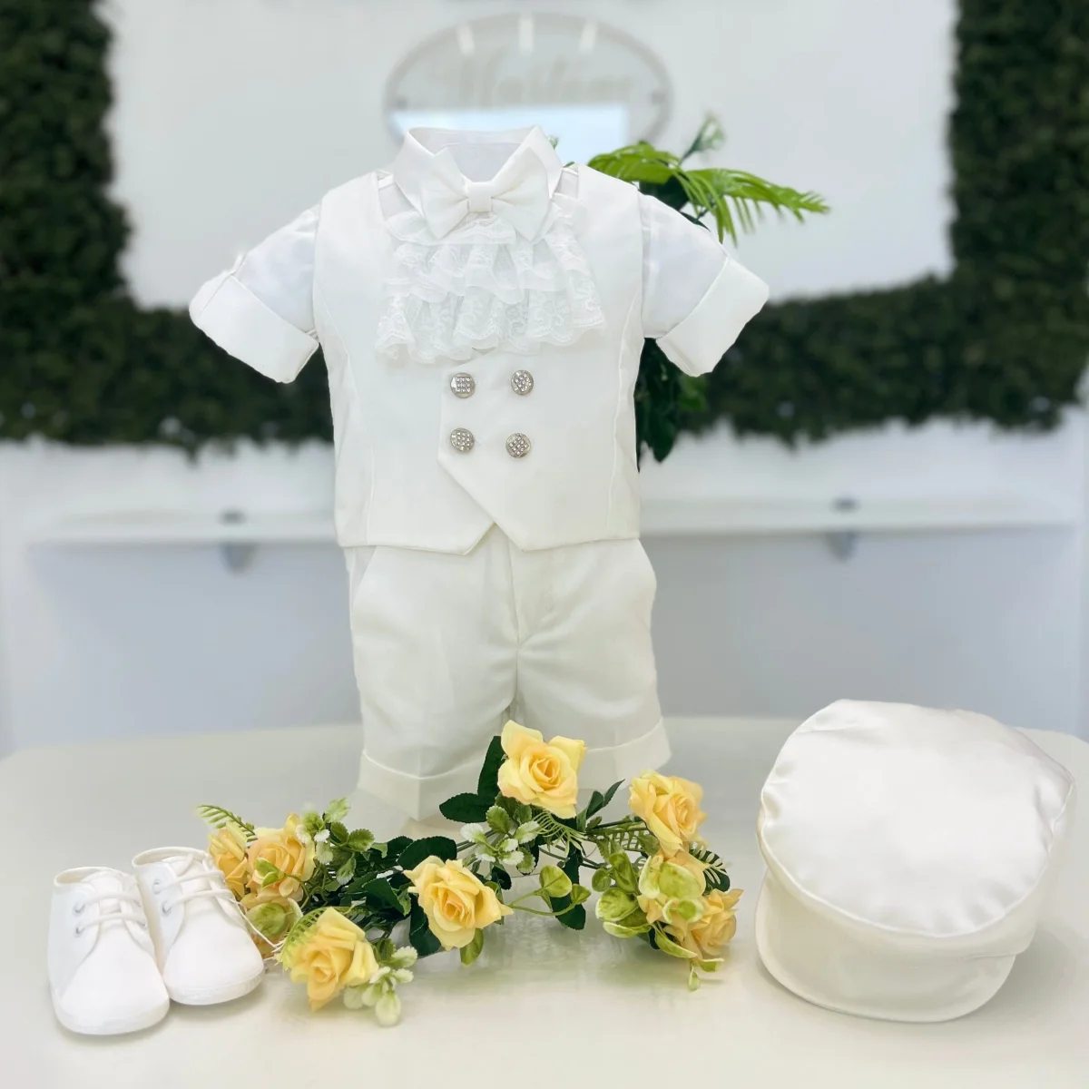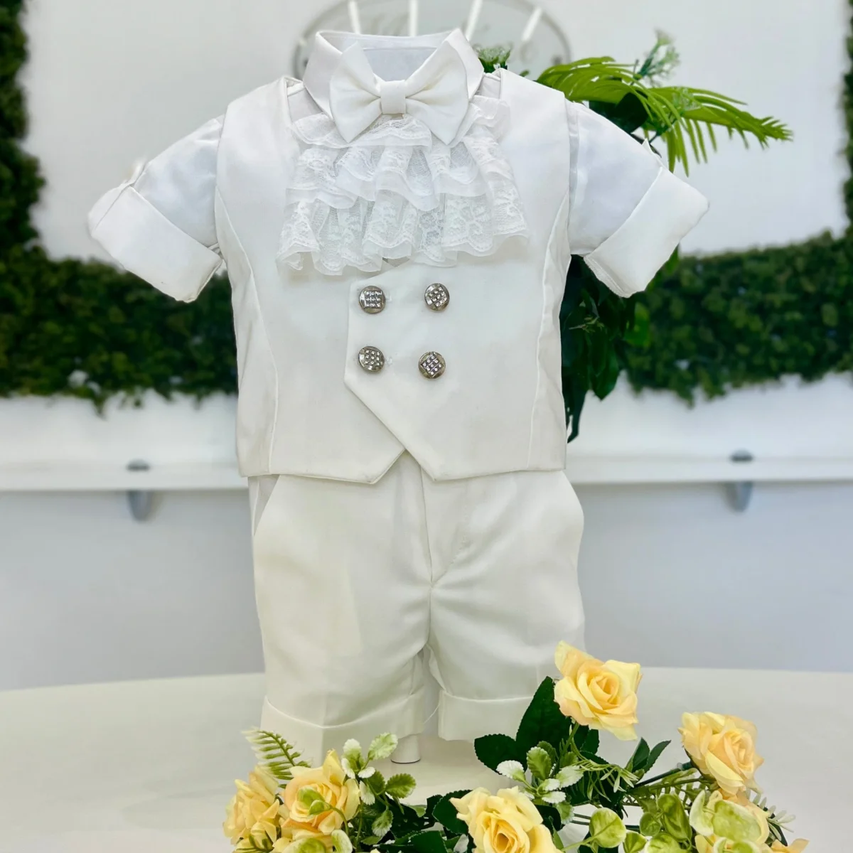 Abito da battesimo dallo stile raffinato e ricercato, composto da camicia con jabot in pizzo delicatamente lavorato, colletto classico e papillon coordinato. Gilet strutturato con bottoni gioiello che valorizzano il design, abbinato a pantalone con risvolto per un insieme armonioso ed elegante. Una proposta di grande classe, pensata per un battesimo o una cerimonia speciale, dove ogni dettaglio fa la differenza.